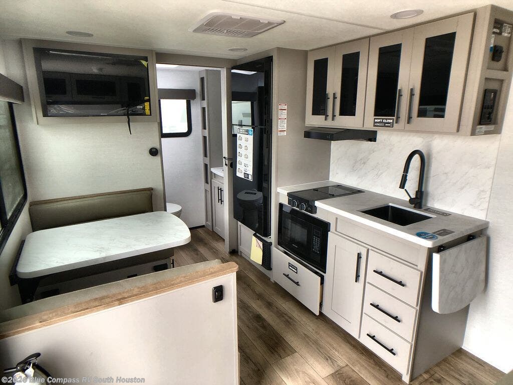 This compact, yet feature-packed travel trailer offers smart design and comfort throughout. Step inside through the 28" entry to find a front queen bed that easily converts into a 60" jackknife sofa, flanked by wardrobe nightstands for your clothes and essentials. The central kitchen is equipped with a 10-cu. ft. refrigerator, two-burner cooktop, sink, and overhead storage, while a booth dinette across from it offers dining space and a clear view of the 32-inch TV. At the rear, enjoy the convenience of a full bathroom with a spacious 30" x 36" shower, a sink with linen shelves, and additional overhead compartments for organized storage.