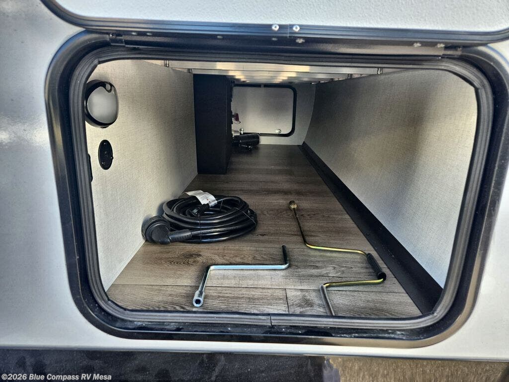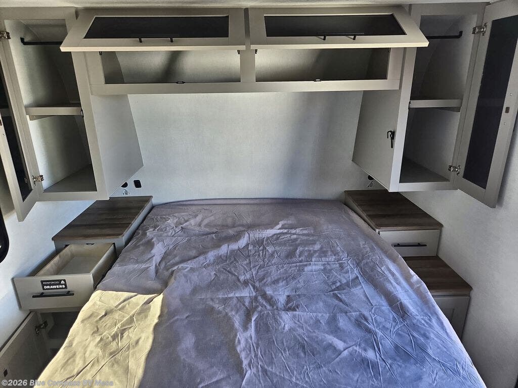 This compact, yet feature-packed travel trailer offers smart design and comfort throughout. Step inside through the 28" entry to find a front queen bed that easily converts into a 60" jackknife sofa, flanked by wardrobe nightstands for your clothes and essentials. The central kitchen is equipped with a 10-cu. ft. refrigerator, two-burner cooktop, sink, and overhead storage, while a booth dinette across from it offers dining space and a clear view of the 32-inch TV. At the rear, enjoy the convenience of a full bathroom with a spacious 30" x 36" shower, a sink with linen shelves, and additional overhead compartments for organized storage.