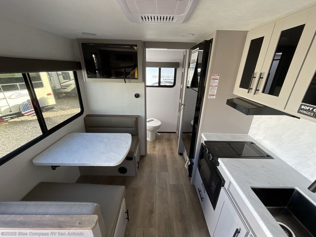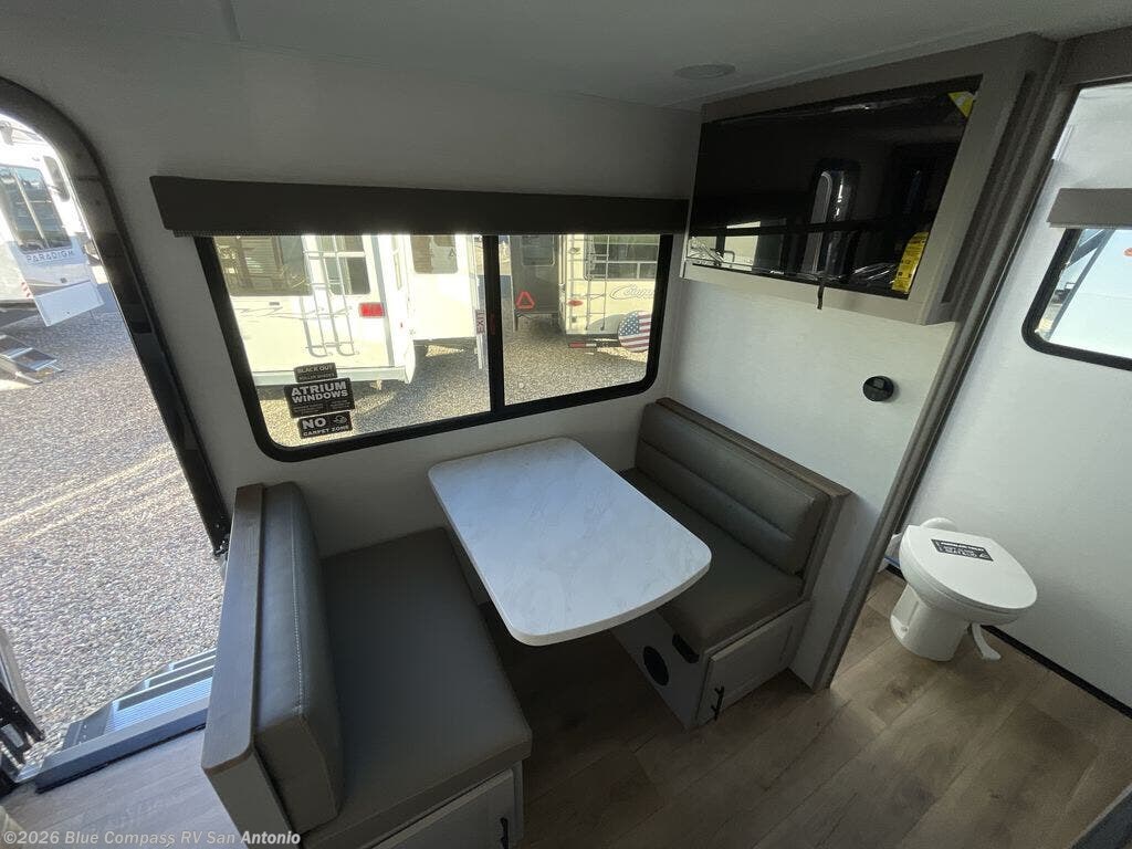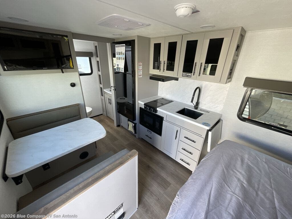 This compact, yet feature-packed travel trailer offers smart design and comfort throughout. Step inside through the 28" entry to find a front queen bed that easily converts into a 60" jackknife sofa, flanked by wardrobe nightstands for your clothes and essentials. The central kitchen is equipped with a 10-cu. ft. refrigerator, two-burner cooktop, sink, and overhead storage, while a booth dinette across from it offers dining space and a clear view of the 32-inch TV. At the rear, enjoy the convenience of a full bathroom with a spacious 30" x 36" shower, a sink with linen shelves, and additional overhead compartments for organized storage.