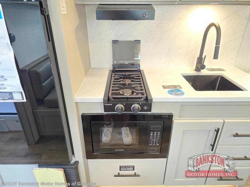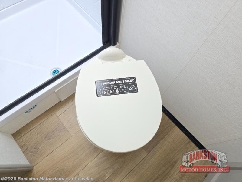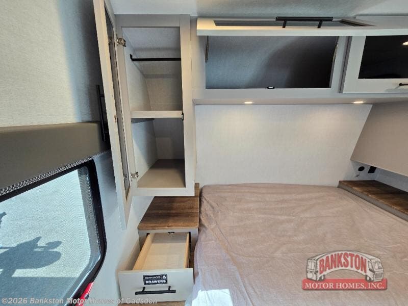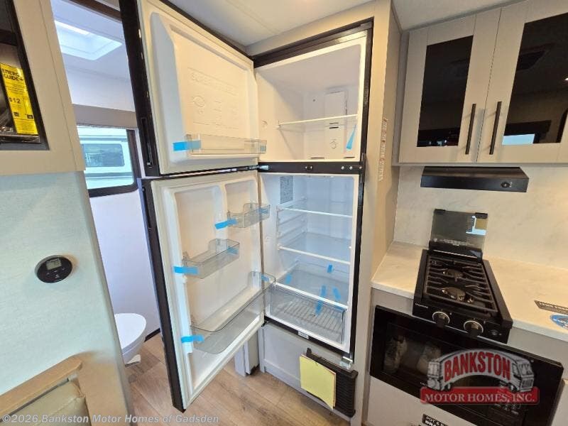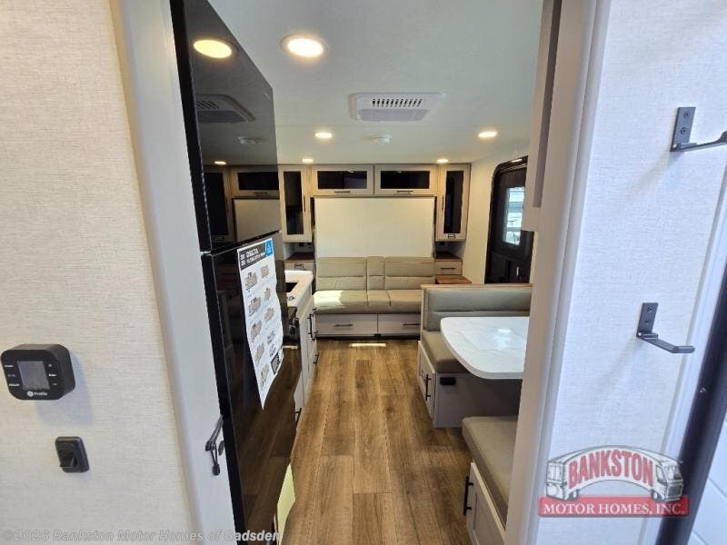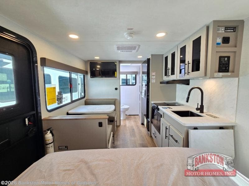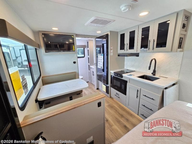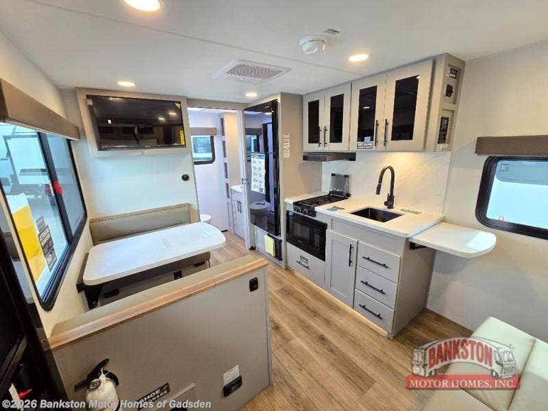 This compact, yet feature-packed travel trailer offers smart design and comfort throughout. Step inside through the 28" entry to find a front queen bed that easily converts into a 60" jackknife sofa, flanked by wardrobe nightstands for your clothes and essentials. The central kitchen is equipped with a 10-cu. ft. refrigerator, two-burner cooktop, sink, and overhead storage, while a booth dinette across from it offers dining space and a clear view of the 32-inch TV. At the rear, enjoy the convenience of a full bathroom with a spacious 30" x 36" shower, a sink with linen shelves, and additional overhead compartments for organized storage.