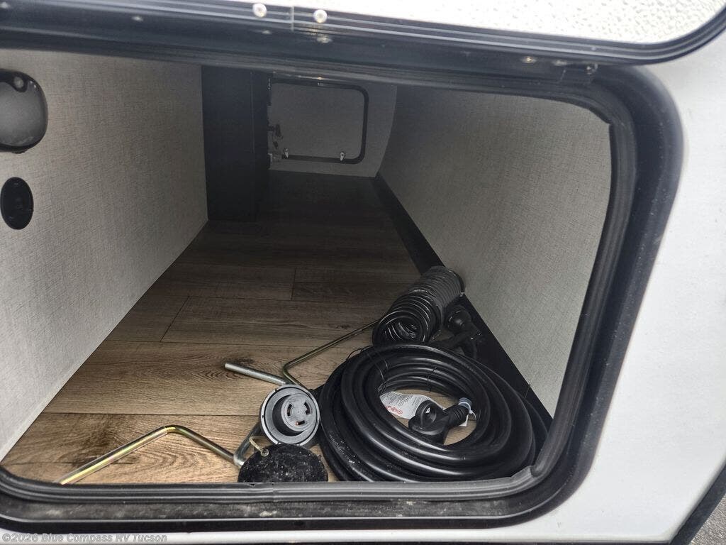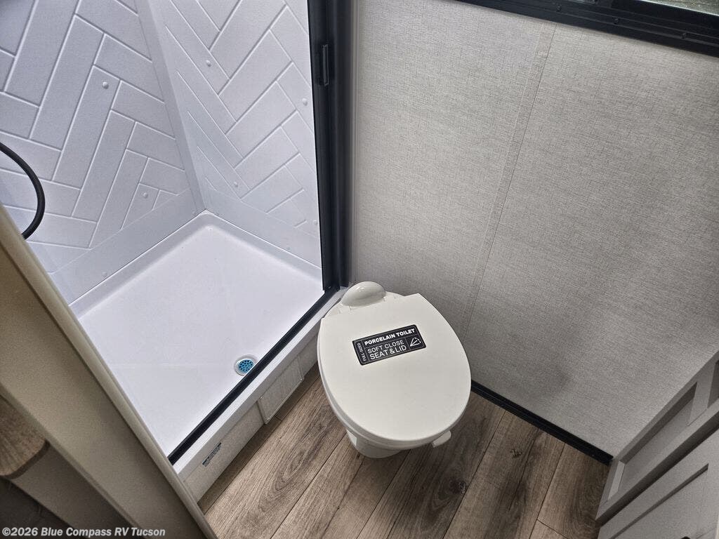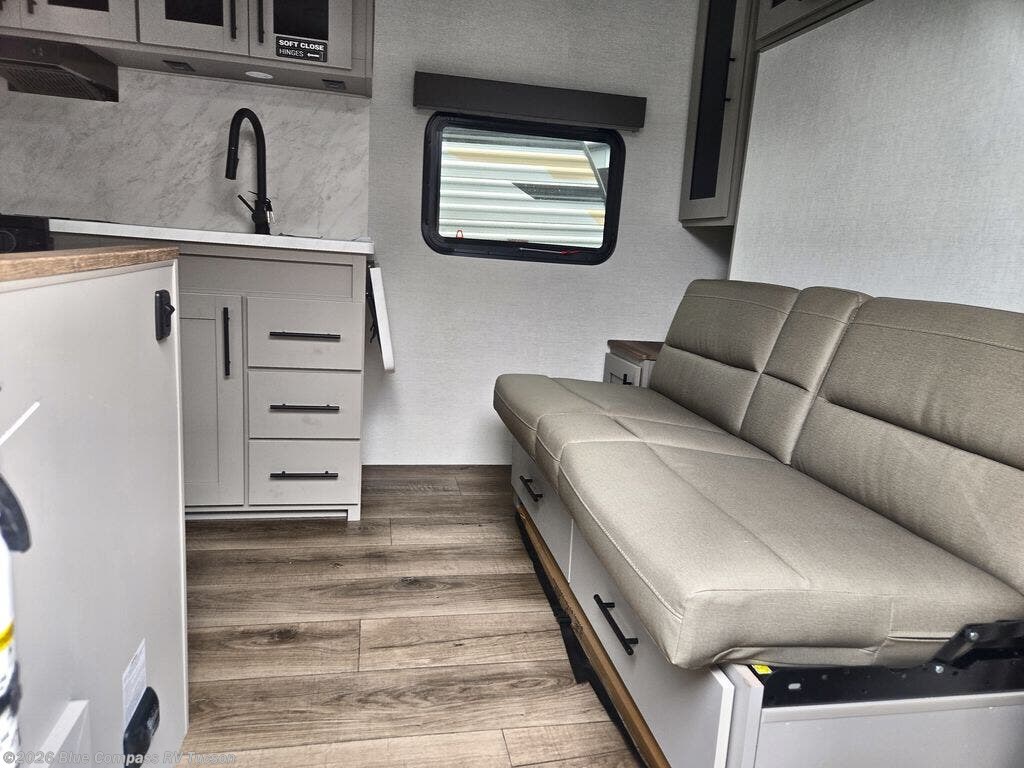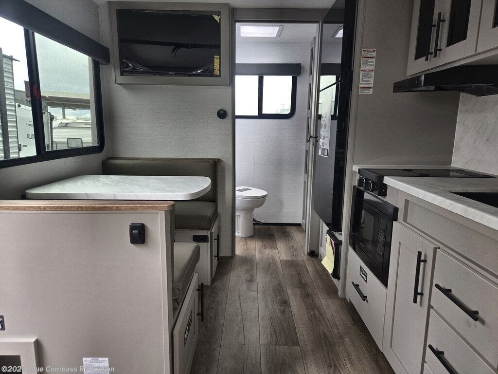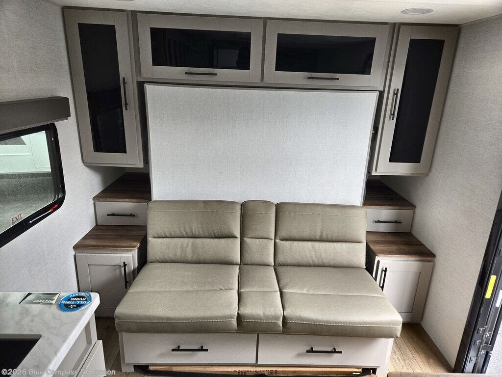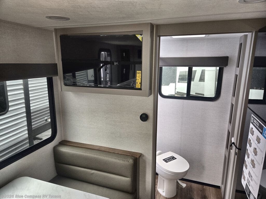 This compact, yet feature-packed travel trailer offers smart design and comfort throughout. Step inside through the 28" entry to find a front queen bed that easily converts into a 60" jackknife sofa, flanked by wardrobe nightstands for your clothes and essentials. The central kitchen is equipped with a 10-cu. ft. refrigerator, two-burner cooktop, sink, and overhead storage, while a booth dinette across from it offers dining space and a clear view of the 32-inch TV. At the rear, enjoy the convenience of a full bathroom with a spacious 30" x 36" shower, a sink with linen shelves, and additional overhead compartments for organized storage.