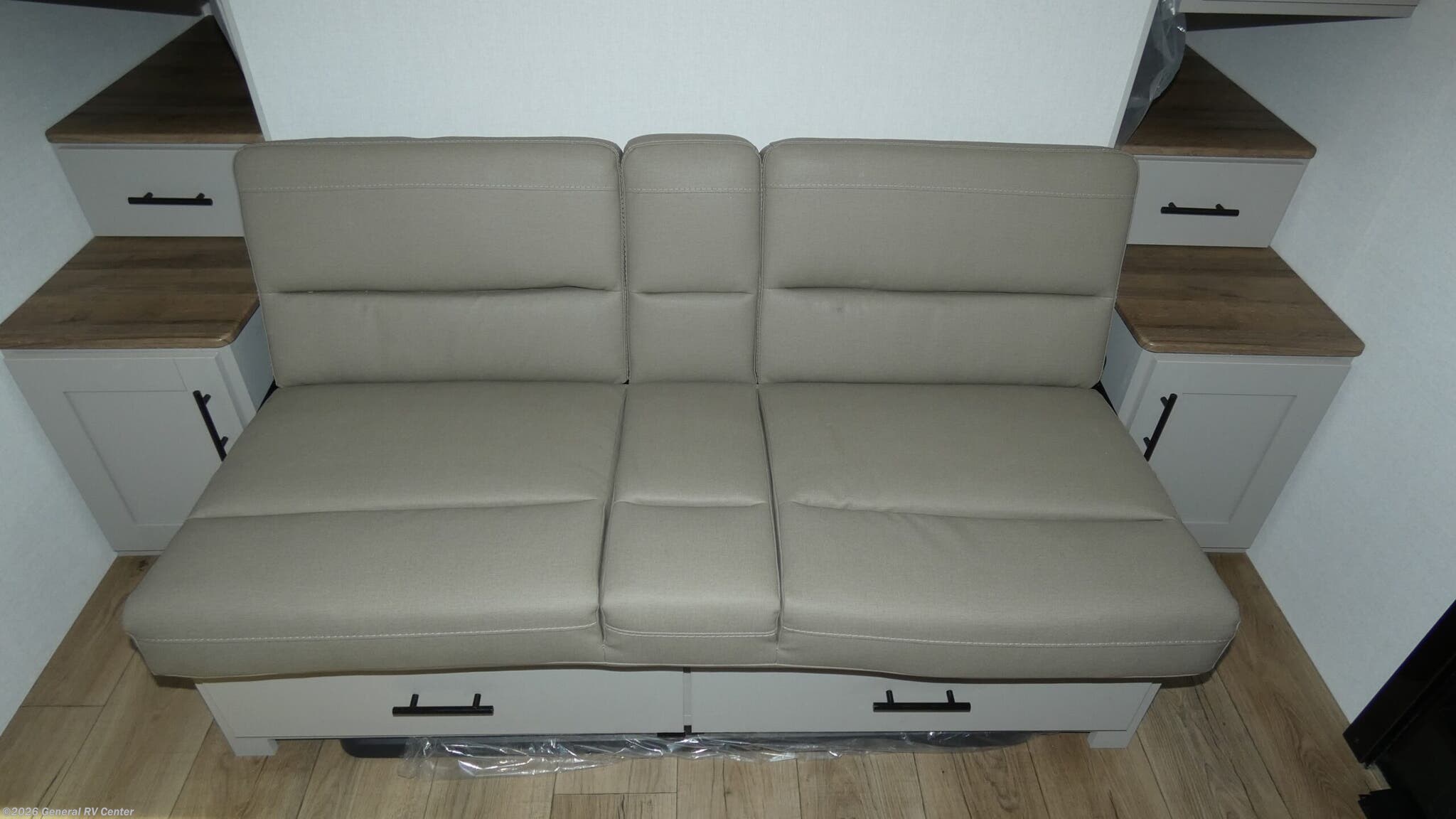 Alliance RV Delta Solo travel trailer RB152 highlights: Queen/Murphy Bed 13' Awning 28" Entry Full Rear Bathroom This compact, yet feature-packed travel trailer offers smart design and comfort throughout. Step inside through the 28" entry to find a front queen bed that easily converts into a 60" jackknife sofa, flanked by wardrobe nightstands for your clothes and essentials. The central kitchen is equipped with a 10-cu. ft. refrigerator, two-burner cooktop, sink, and overhead storage, while a booth dinette across from it offers dining space and a clear view of the 32-inch TV. At the rear, enjoy the convenience of a full bathroom with a spacious 30" x 36" shower, a sink with linen shelves, and additional overhead compartments for organized storage. Each Delta Solo Model Each is designed to provide both comfort and convenience in a compact footprint. Inside, you'll find residential-style touches like can-style LED ceiling lights, cabinet doors with magnetic catches, and commercial-grade vinyl flooring built to last. On the exterior, practical travel features include exterior switches for the slide-out and awning, sturdy Step Above fold-out entry steps, and color-coded, numbered wiring for simplified maintenance and troubleshooting.