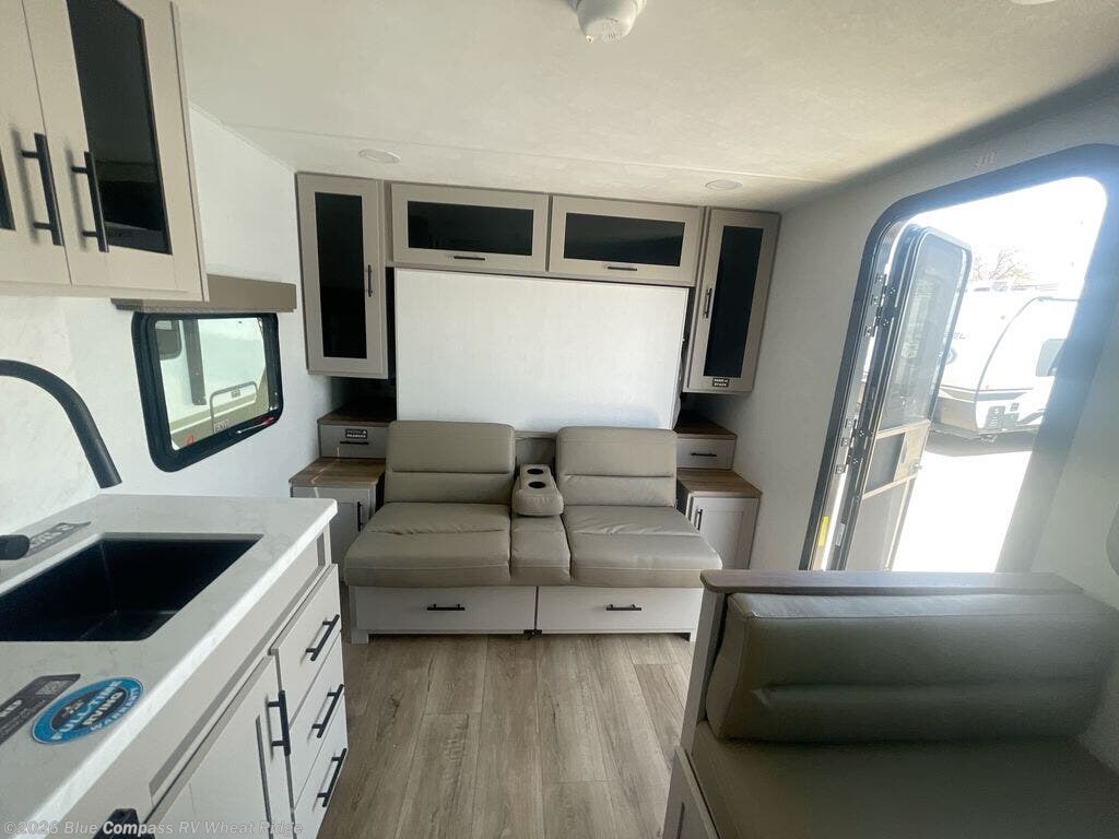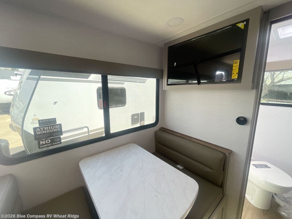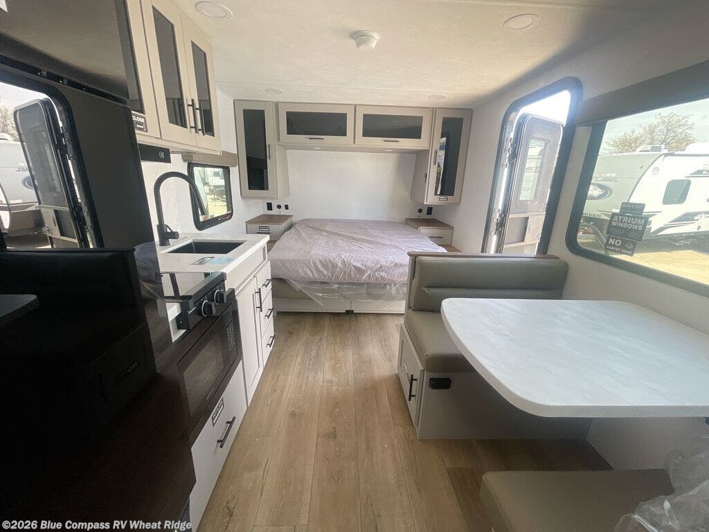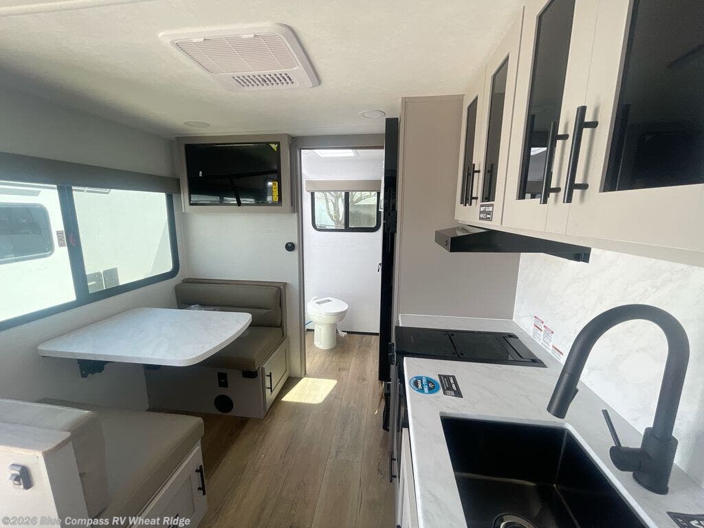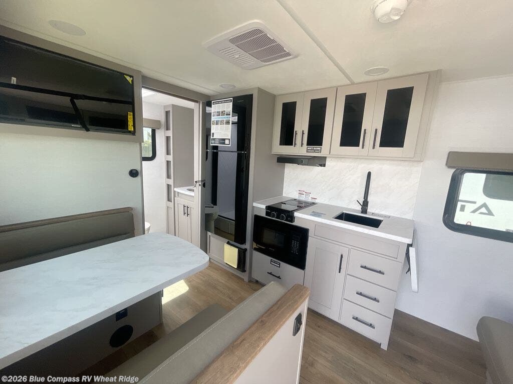 This compact, yet feature-packed travel trailer offers smart design and comfort throughout. Step inside through the 28" entry to find a front queen bed that easily converts into a 60" jackknife sofa, flanked by wardrobe nightstands for your clothes and essentials. The central kitchen is equipped with a 10-cu. ft. refrigerator, two-burner cooktop, sink, and overhead storage, while a booth dinette across from it offers dining space and a clear view of the 32-inch TV. At the rear, enjoy the convenience of a full bathroom with a spacious 30" x 36" shower, a sink with linen shelves, and additional overhead compartments for organized storage.
