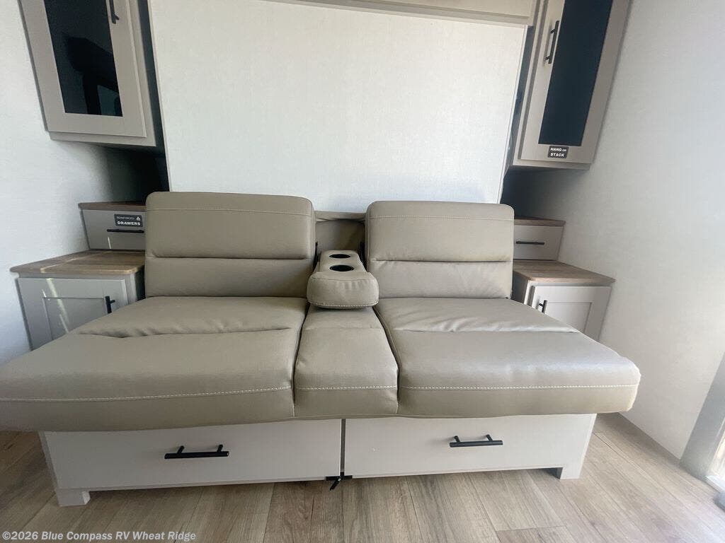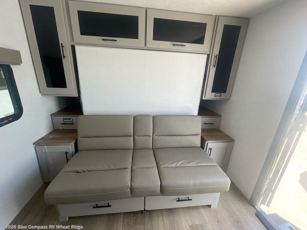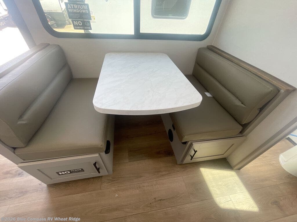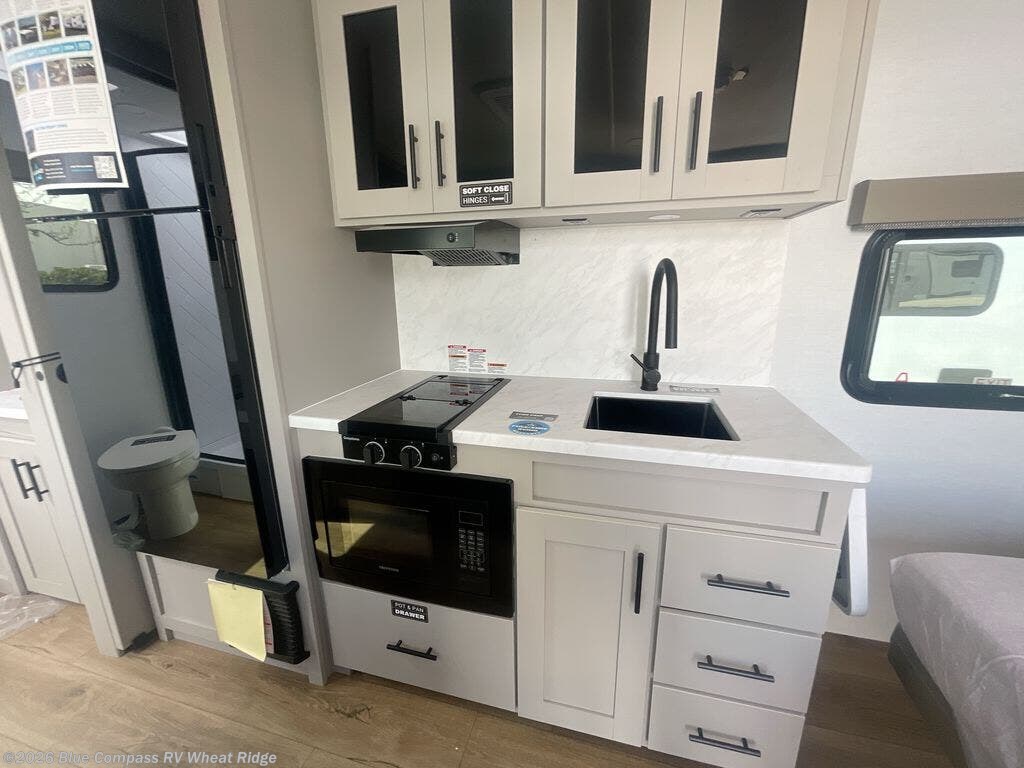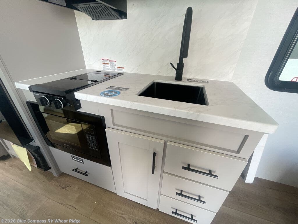 This compact, yet feature-packed travel trailer offers smart design and comfort throughout. Step inside through the 28" entry to find a front queen bed that easily converts into a 60" jackknife sofa, flanked by wardrobe nightstands for your clothes and essentials. The central kitchen is equipped with a 10-cu. ft. refrigerator, two-burner cooktop, sink, and overhead storage, while a booth dinette across from it offers dining space and a clear view of the 32-inch TV. At the rear, enjoy the convenience of a full bathroom with a spacious 30" x 36" shower, a sink with linen shelves, and additional overhead compartments for organized storage.