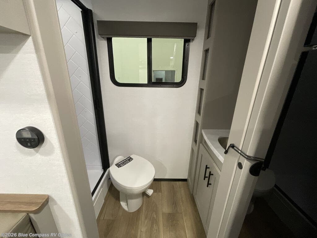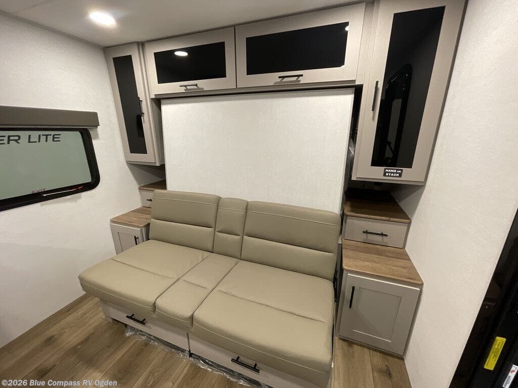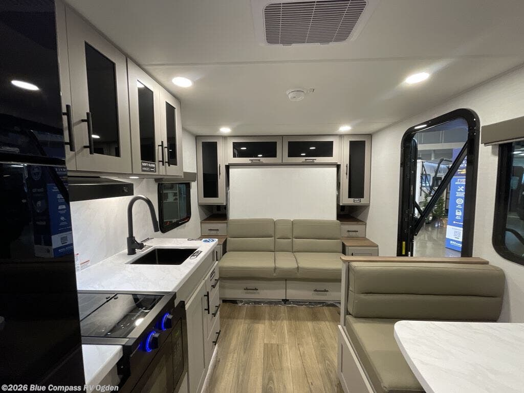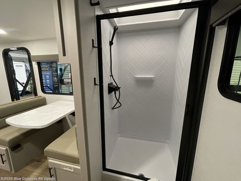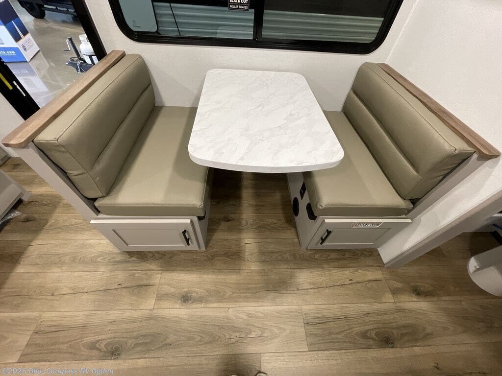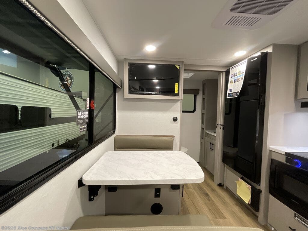This compact, yet feature-packed travel trailer offers smart design and comfort throughout. Step inside through the 28" entry to find a front queen bed that easily converts into a 60" jackknife sofa, flanked by wardrobe nightstands for your clothes and essentials. The central kitchen is equipped with a 10-cu. ft. refrigerator, two-burner cooktop, sink, and overhead storage, while a booth dinette across from it offers dining space and a clear view of the 32-inch TV. At the rear, enjoy the convenience of a full bathroom with a spacious 30" x 36" shower, a sink with linen shelves, and additional overhead compartments for organized storage.