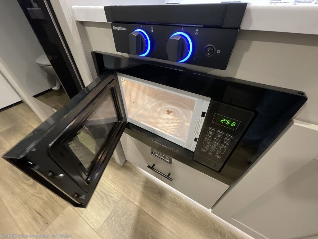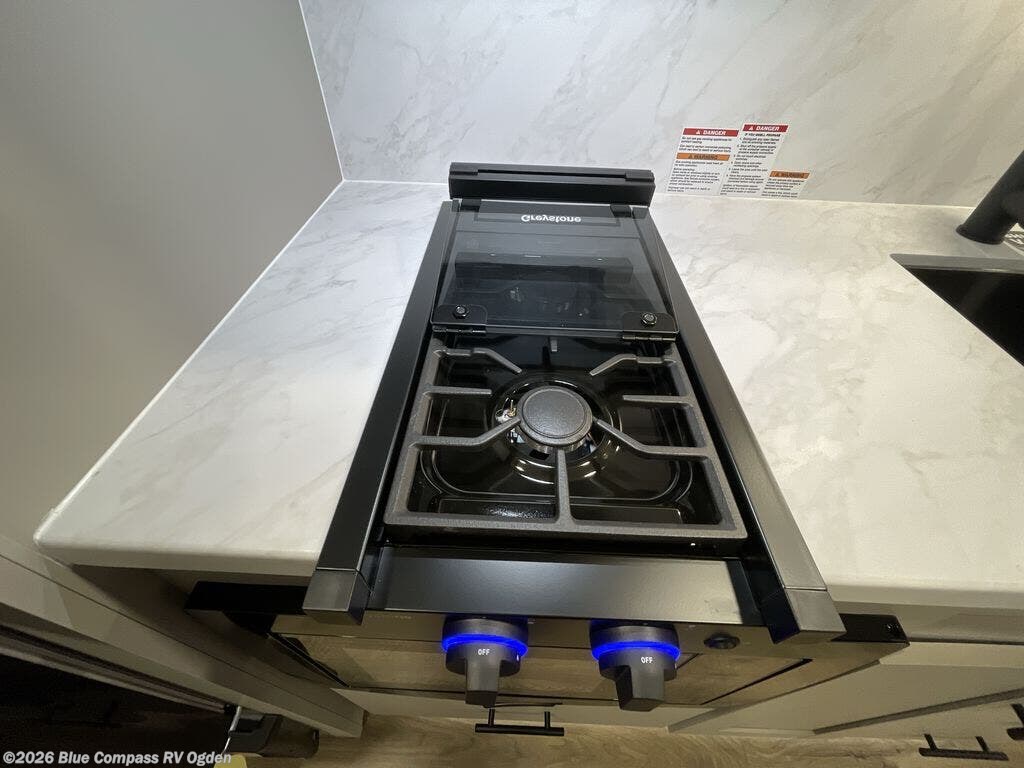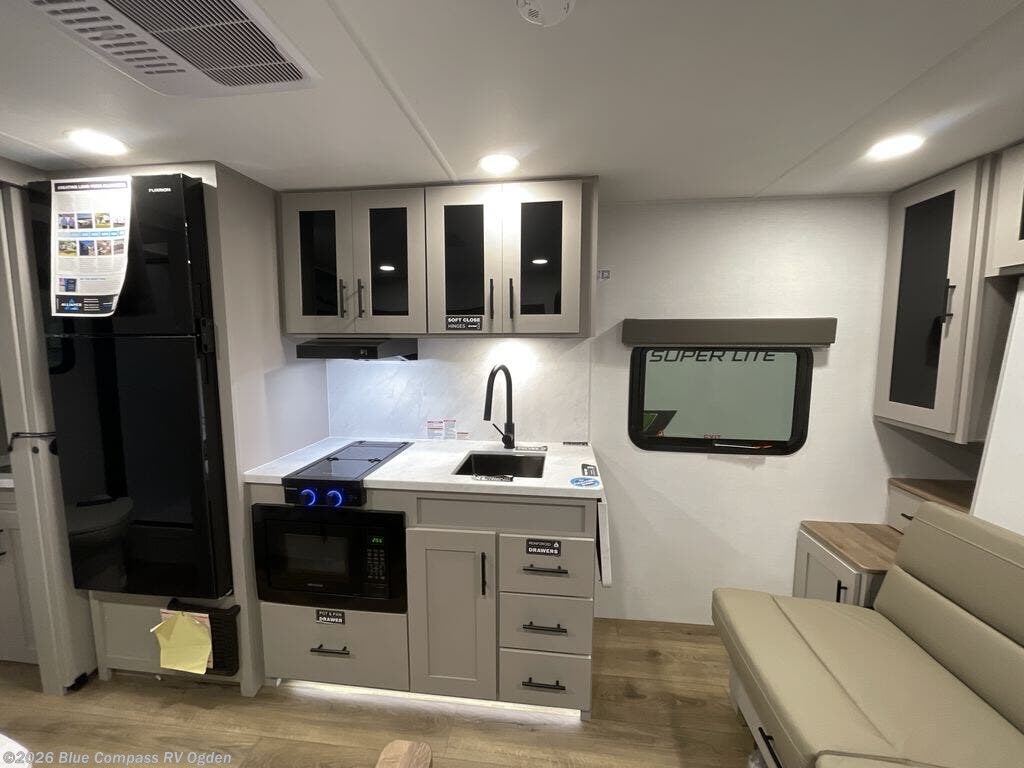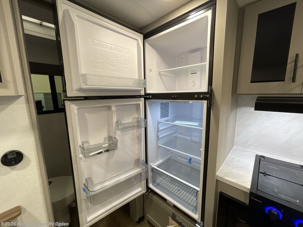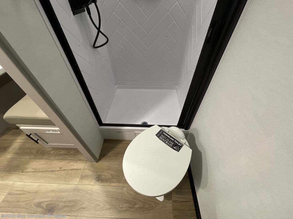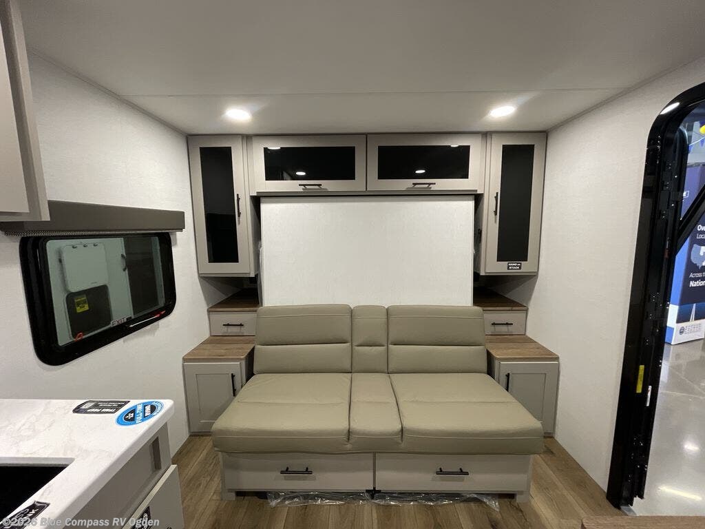 This compact, yet feature-packed travel trailer offers smart design and comfort throughout. Step inside through the 28" entry to find a front queen bed that easily converts into a 60" jackknife sofa, flanked by wardrobe nightstands for your clothes and essentials. The central kitchen is equipped with a 10-cu. ft. refrigerator, two-burner cooktop, sink, and overhead storage, while a booth dinette across from it offers dining space and a clear view of the 32-inch TV. At the rear, enjoy the convenience of a full bathroom with a spacious 30" x 36" shower, a sink with linen shelves, and additional overhead compartments for organized storage.