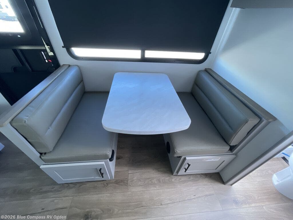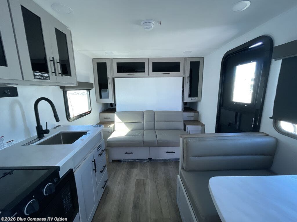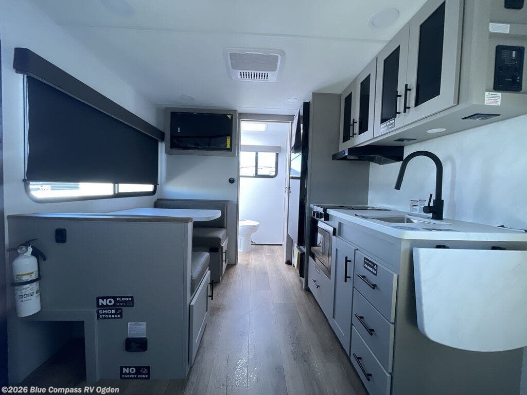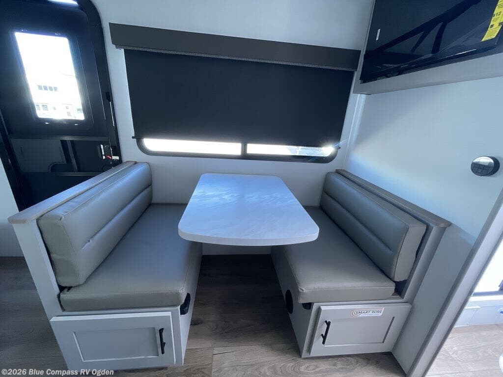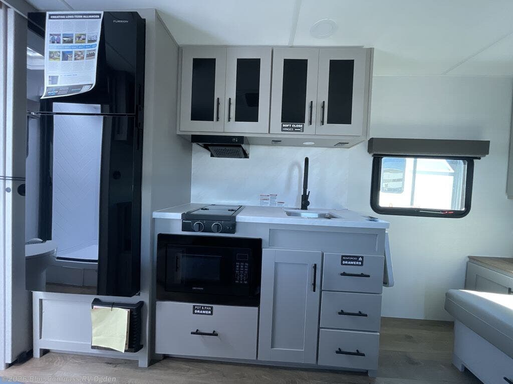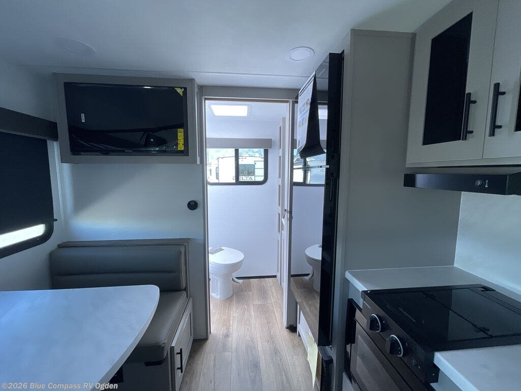 This compact, yet feature-packed travel trailer offers smart design and comfort throughout. Step inside through the 28" entry to find a front queen bed that easily converts into a 60" jackknife sofa, flanked by wardrobe nightstands for your clothes and essentials. The central kitchen is equipped with a 10-cu. ft. refrigerator, two-burner cooktop, sink, and overhead storage, while a booth dinette across from it offers dining space and a clear view of the 32-inch TV. At the rear, enjoy the convenience of a full bathroom with a spacious 30" x 36" shower, a sink with linen shelves, and additional overhead compartments for organized storage.