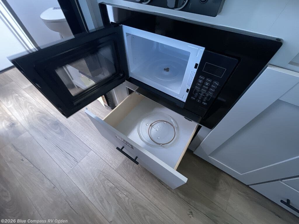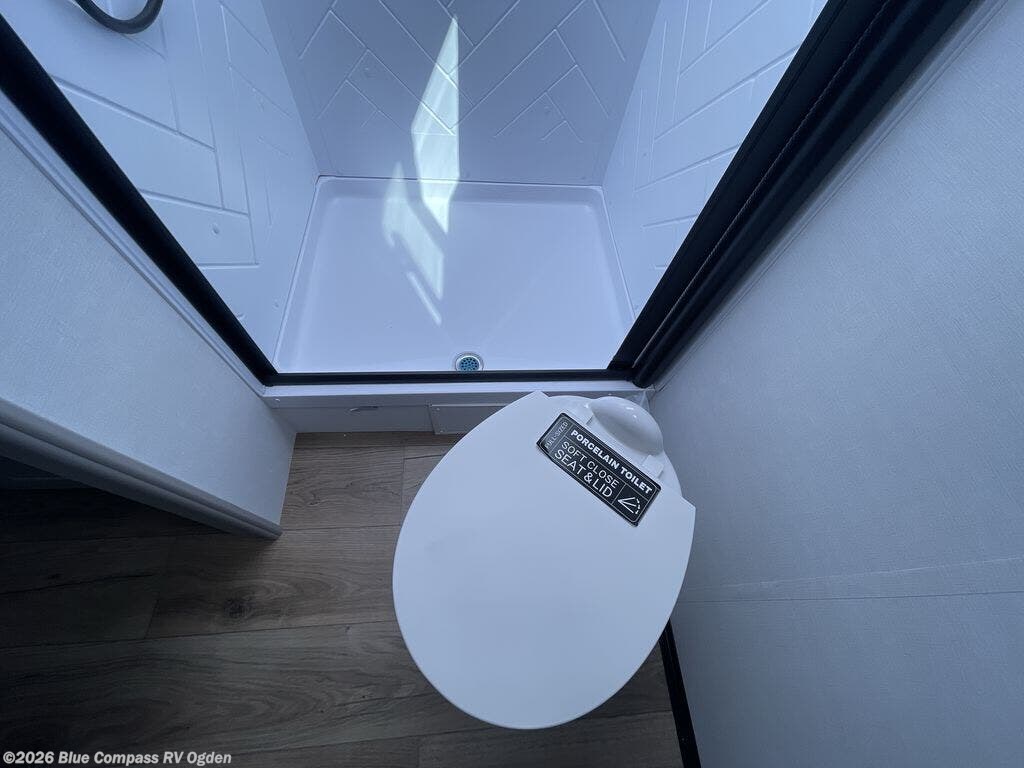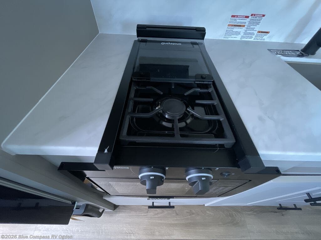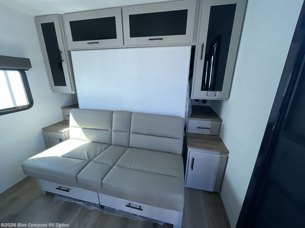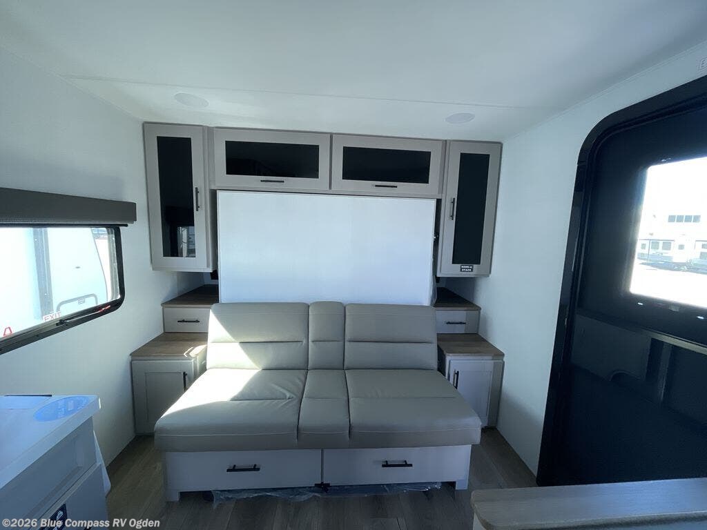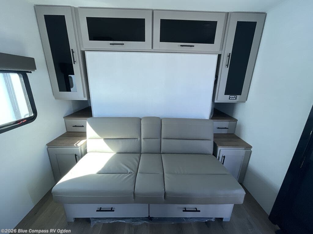 This compact, yet feature-packed travel trailer offers smart design and comfort throughout. Step inside through the 28" entry to find a front queen bed that easily converts into a 60" jackknife sofa, flanked by wardrobe nightstands for your clothes and essentials. The central kitchen is equipped with a 10-cu. ft. refrigerator, two-burner cooktop, sink, and overhead storage, while a booth dinette across from it offers dining space and a clear view of the 32-inch TV. At the rear, enjoy the convenience of a full bathroom with a spacious 30" x 36" shower, a sink with linen shelves, and additional overhead compartments for organized storage.