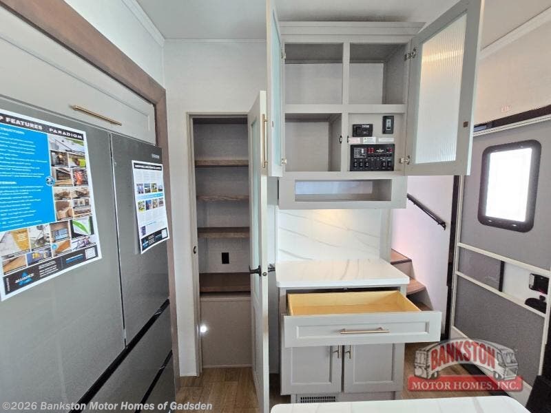 Search for the best views, the nicest RV park, or a place you haven't seen for years with this Paradigm in tow! There is a king bed slide in the master bedroom, a Smart TV, and a dresser with flip-up hidden storage for your belongings. The full bathroom offers a large residential shower, a porcelain toilet with a soft close seat, and storage for your linens, while the kitchen gives you two pantries, an island with a large undermount single basin sink and dishwasher prep if you want the option for easy clean up. You will also have a residential microwave and range, plus a 3.73 cu. ft. oven to make meals. When you're ready to relax for the evening, head to the rear living area to enjoy the dual recliner love seat across from the 50" Smart TV and fireplace!