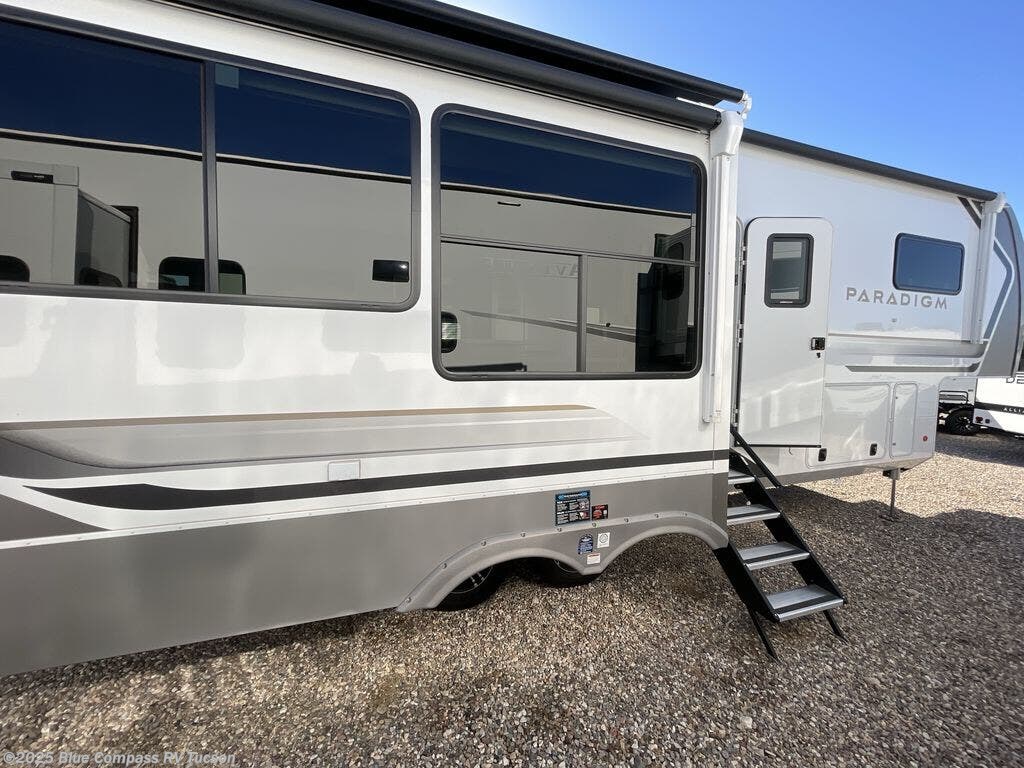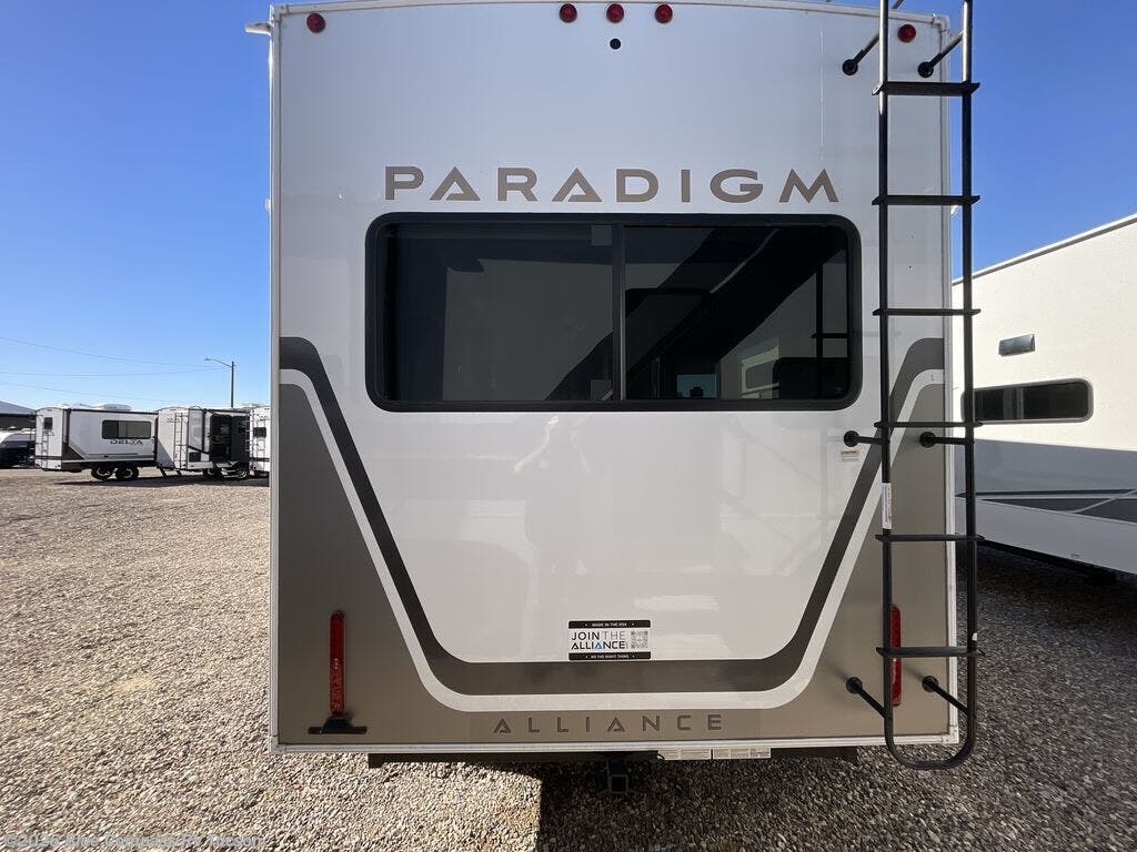 Search for the best views, the nicest RV park, or a place you haven't seen for years with this Paradigm in tow! There is a king bed slide in the master bedroom, a Smart TV, and a dresser with flip-up hidden storage for your belongings. The full bathroom offers a large residential shower, a porcelain toilet with a soft close seat, and storage for your linens, while the kitchen gives you two pantries, an island with a large undermount single basin sink and dishwasher prep if you want the option for easy clean up. You will also have a residential microwave and range, plus a 3.73 cu. ft. oven to make meals. When you're ready to relax for the evening, head to the rear living area to enjoy the dual recliner love seat across from the 50" Smart TV and fireplace!
