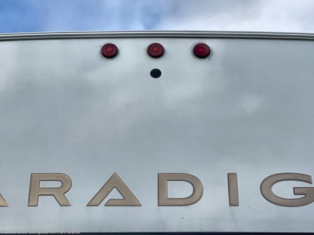Search for the best views, the nicest RV park, or a place you haven't seen for years with this Paradigm in tow! There is a king bed slide in the master bedroom, a Smart TV, and a dresser with flip-up hidden storage for your belongings. The full bathroom offers a large residential shower, a porcelain toilet with a soft close seat, and storage for your linens, while the kitchen gives you two pantries, an island with a large undermount single basin sink and dishwasher prep if you want the option for easy clean up. You will also have a residential microwave and range, plus a 3.73 cu. ft. oven to make meals. When you're ready to relax for the evening, head to the rear living area to enjoy the dual recliner love seat across from the 50" Smart TV and fireplace!