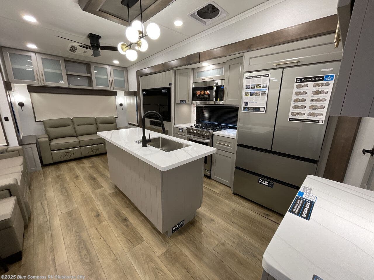 Search for the best views, the nicest RV park, or a place you haven't seen for years with this Paradigm in tow! There is a king bed slide in the master bedroom, a Smart TV, and a dresser with flip-up hidden storage for your belongings. The full bathroom offers a large residential shower, a porcelain toilet with a soft close seat, and storage for your linens, while the kitchen gives you two pantries, an island with a large undermount single basin sink and dishwasher prep if you want the option for easy clean up. You will also have a residential microwave and range, plus a 3.73 cu. ft. oven to make meals. When you're ready to relax for the evening, head to the rear living area to enjoy the dual recliner love seat across from the 50" Smart TV and fireplace!