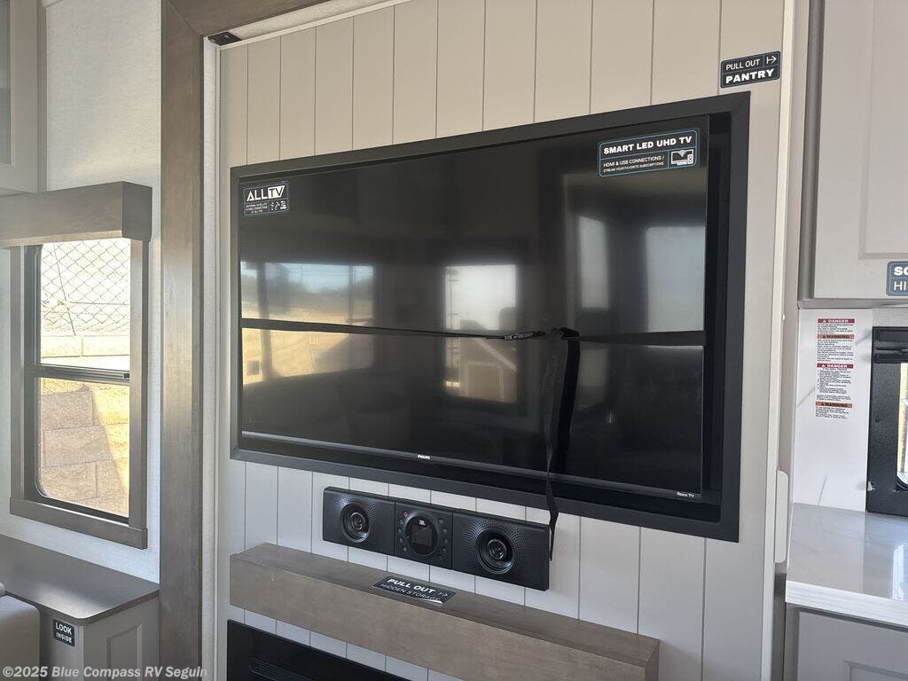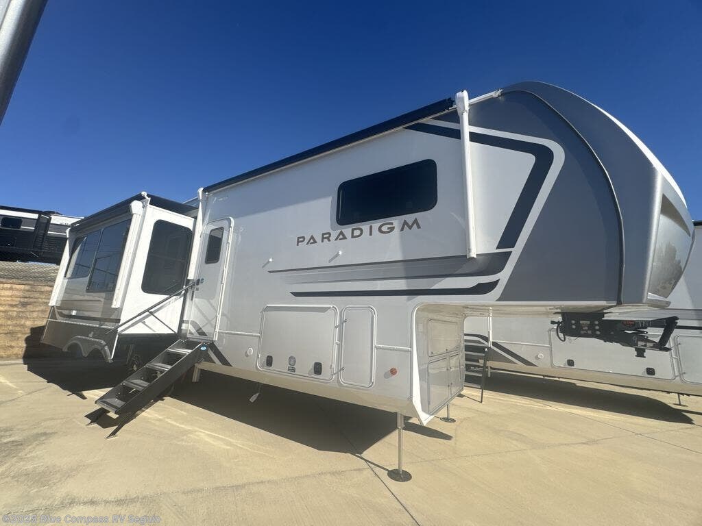 Search for the best views, the nicest RV park, or a place you haven't seen for years with this Paradigm in tow! There is a king bed slide in the master bedroom, a Smart TV, and a dresser with flip-up hidden storage for your belongings. The full bathroom offers a large residential shower, a porcelain toilet with a soft close seat, and storage for your linens, while the kitchen gives you two pantries, an island with a large undermount single basin sink and dishwasher prep if you want the option for easy clean up. You will also have a residential microwave and range, plus a 3.73 cu. ft. oven to make meals. When you're ready to relax for the evening, head to the rear living area to enjoy the dual recliner love seat across from the 50" Smart TV and fireplace!