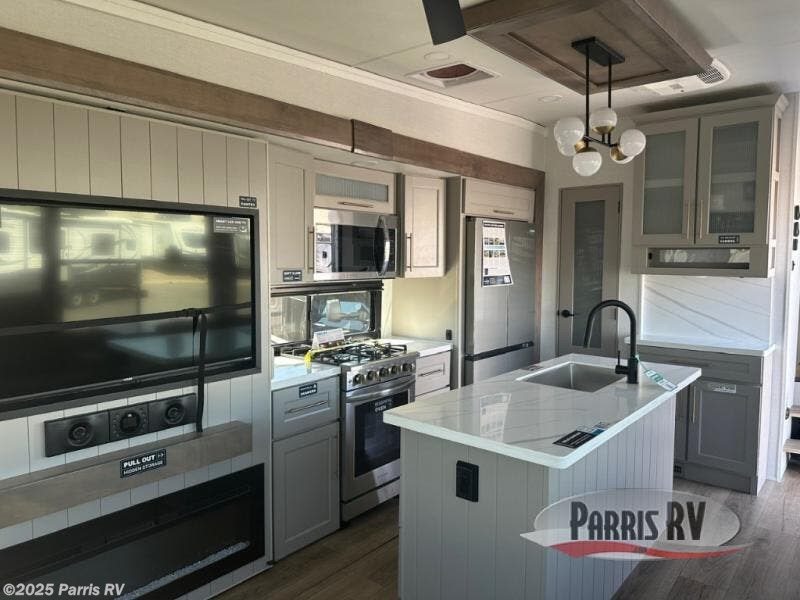 Search for the best views, the nicest RV park, or a place you haven't seen for years with this Paradigm in tow! There is a king bed slide in the master bedroom, a Smart TV, and a dresser with flip-up hidden storage for your belongings. The full bathroom offers a large residential shower, a porcelain toilet with a soft close seat, and storage for your linens, while the kitchen gives you two pantries, an island with a large undermount single basin sink and dishwasher prep if you want the option for easy clean up. You will also have a residential microwave and range, plus a 3.73 cu. ft. oven to make meals. When you're ready to relax for the evening, head to the rear living area to enjoy the dual recliner love seat across from the 50" Smart TV and fireplace!