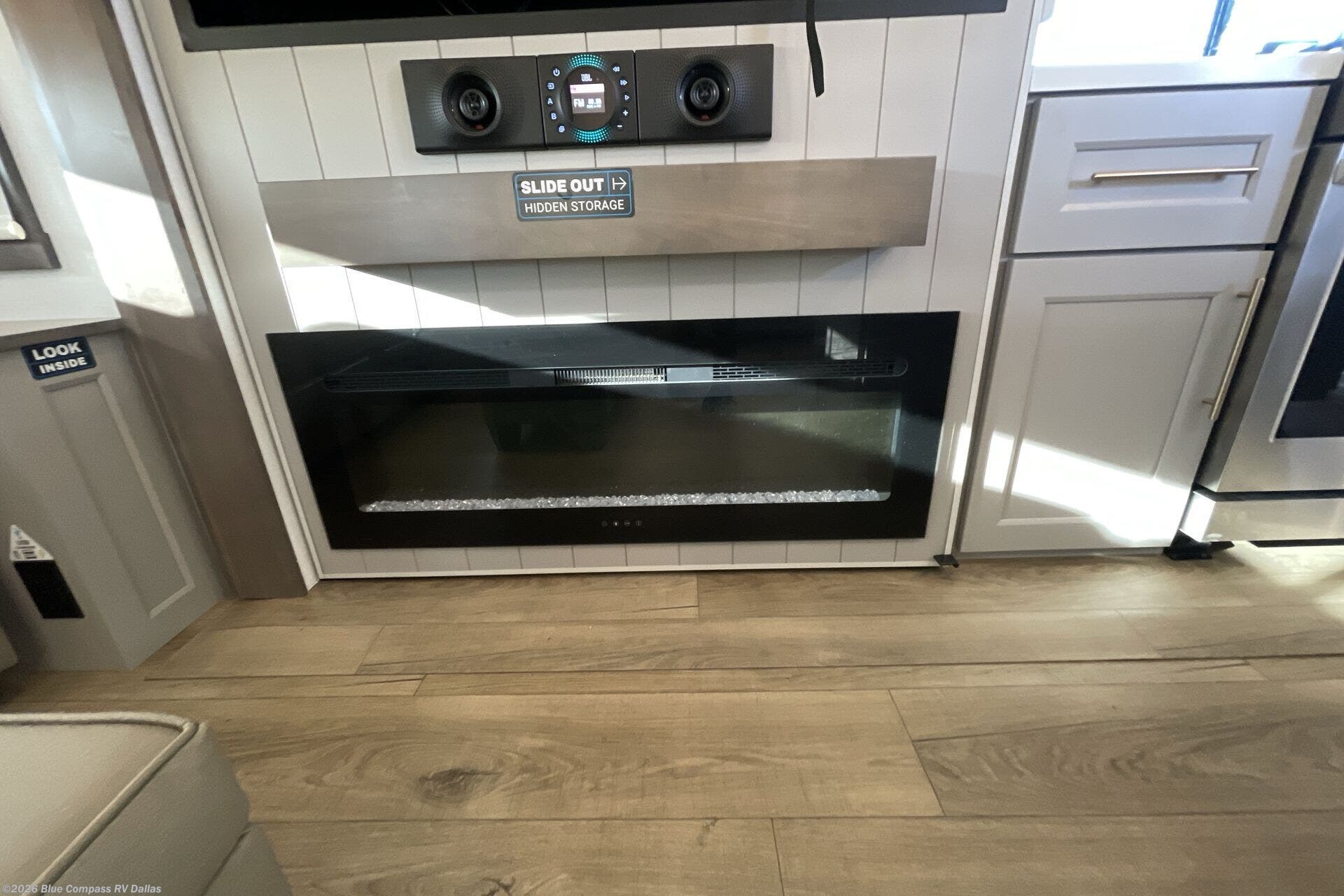 Search for the best views, the nicest RV park, or a place you haven't seen for years with this Paradigm in tow! There is a king bed slide in the master bedroom, a Smart TV, and a dresser with flip-up hidden storage for your belongings. The full bathroom offers a large residential shower, a porcelain toilet with a soft close seat, and storage for your linens, while the kitchen gives you two pantries, an island with a large undermount single basin sink and dishwasher prep if you want the option for easy clean up. You will also have a residential microwave and range, plus a 3.73 cu. ft. oven to make meals. When you're ready to relax for the evening, head to the rear living area to enjoy the dual recliner love seat across from the 50" Smart TV and fireplace!