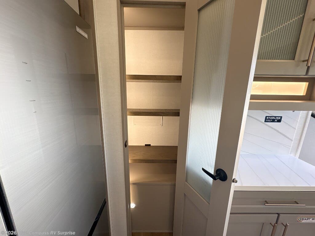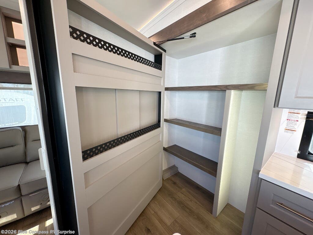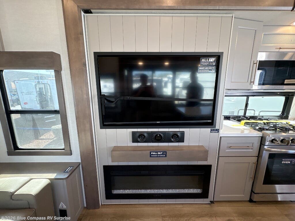 Search for the best views, the nicest RV park, or a place you haven't seen for years with this Paradigm in tow! There is a king bed slide in the master bedroom, a Smart TV, and a dresser with flip-up hidden storage for your belongings. The full bathroom offers a large residential shower, a porcelain toilet with a soft close seat, and storage for your linens, while the kitchen gives you two pantries, an island with a large undermount single basin sink and dishwasher prep if you want the option for easy clean up. You will also have a residential microwave and range, plus a 3.73 cu. ft. oven to make meals. When you're ready to relax for the evening, head to the rear living area to enjoy the dual recliner love seat across from the 50" Smart TV and fireplace!