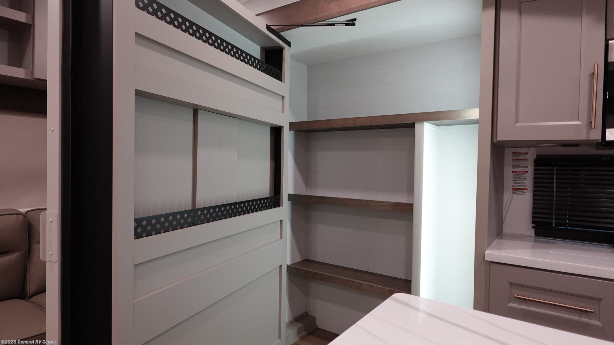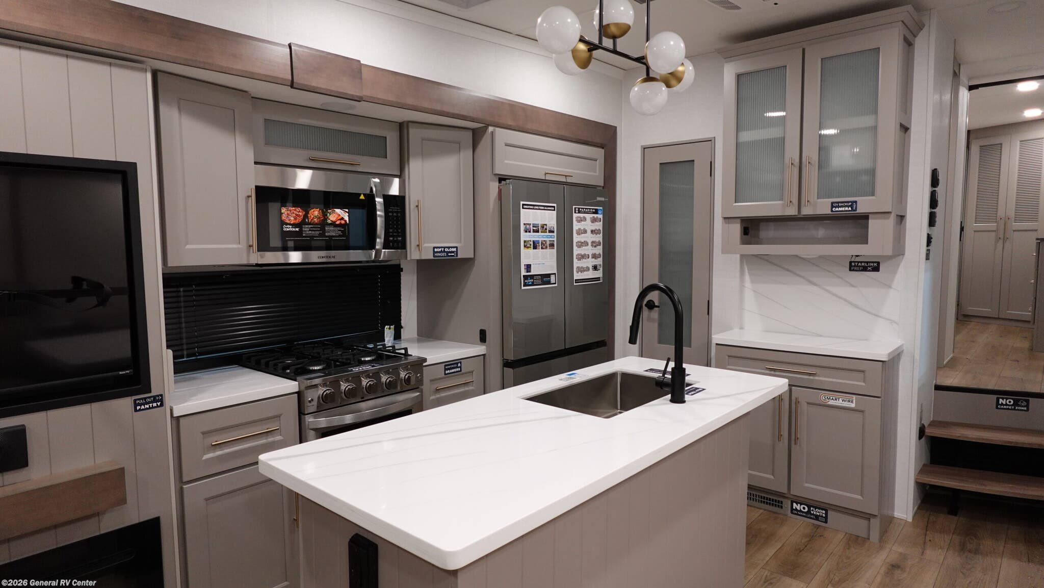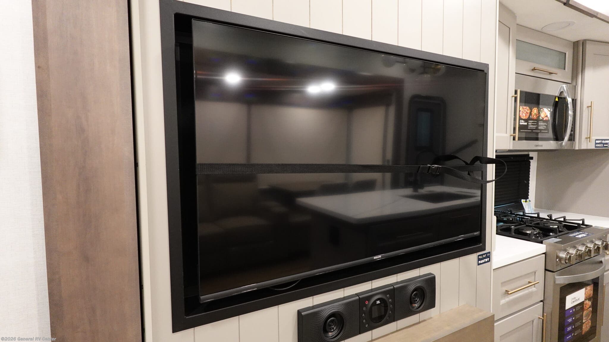Alliance RV Paradigm fifth wheel 310RL highlights: Rear Living Area Kitchen Island Flush-Floor Kitchen Slide Swivel Table and Desk Hidden Pantry Behind Fireplace Search for the best views, the nicest RV park, or a place you haven't seen for years with this Paradigm in tow! There is a king bed slide in the master bedroom, a Smart TV, and a dresser with flip-up hidden storage for your belongings. The full bathroom offers a large residential shower, a porcelain toilet with a soft close seat, and storage for your linens, while the kitchen gives you two pantries, an island with a large undermount single basin sink and dishwasher prep if you want the option for easy clean up. You will also have a residential microwave and range, plus a 3.73 cu. ft. oven to make meals. When you're ready to relax for the evening, head to the rear living area to enjoy the dual recliner love seat across from the 50" Smart TV and fireplace! The Paradigm fifth wheels by Alliance RV are functional, high-quality, and luxurious for an unforgettable camping experience. There are three A/C units and a 40K BTU furnace to keep you comfortable year around, and you'll appreciate additional convenient amenities, like the all-in-one enclosed/heated utility center and the color coded and numbered wiring. A Helux Series coil spring pin box comes standard for hassle-free towing, along with Curt 8,000 lb. axles. You'll love the kitchen with its LG solid surface countertops and Lusso range, plus there is LED motion lighting in the pantry and a Maxx fan with a rain sensor to keep everything fresh when making dinner. Each model also includes an HD Smart TV in the living room and bedroom.