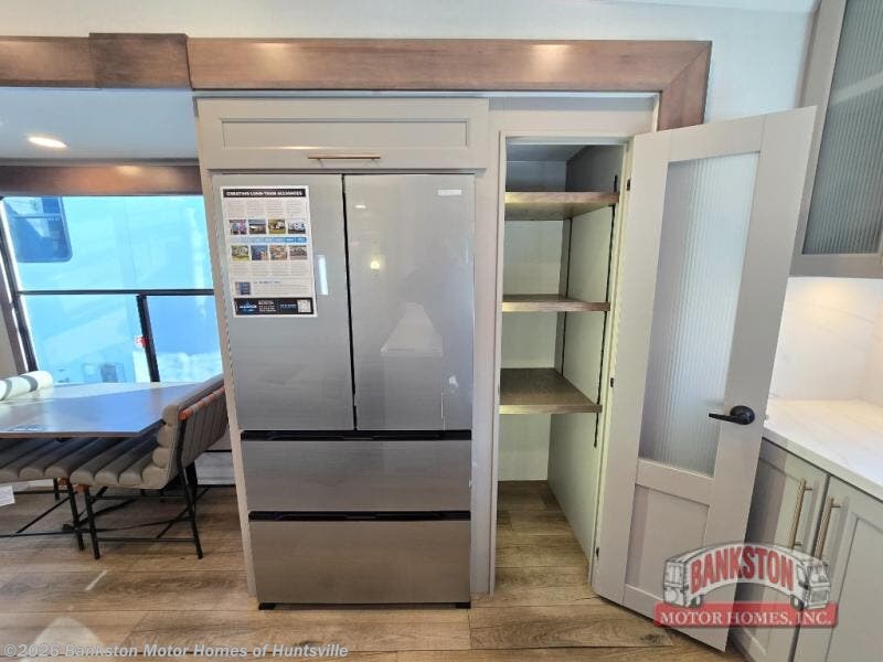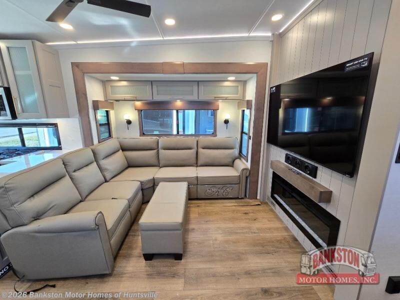 Escape the ordinary and experience the ultimate in luxury travel with this stunning fifth wheel! The rear kitchen is the heart of this fifth wheel, featuring a spacious pantry, 12V refrigerator, microwave, and overhead cabinets. Prepare delicious meals with ease and enjoy the convenience of a fully-equipped kitchen. Unwind in the spacious living area, featuring a plush trifold sofa, L-shape sofa, and a dual recliner love seat. Gather around the turntable dinette or relax in front of the stunning 65” TV. The full bathroom provides a serene space for personal care, while the front bedroom is a peaceful retreat with a comfortable queen bed and a flip-top dresser. Enjoy your favorite shows on the smart TV, perfect for relaxing after a day of adventure.