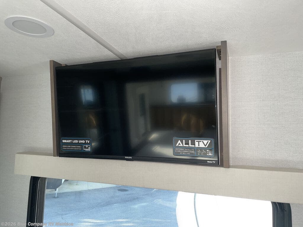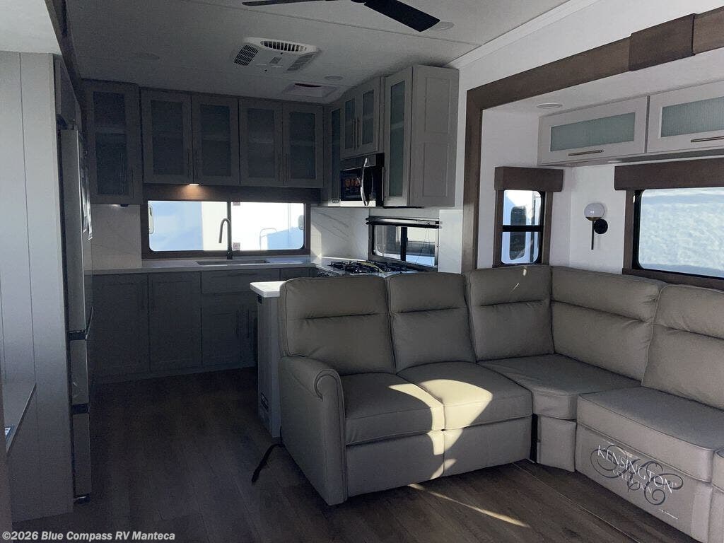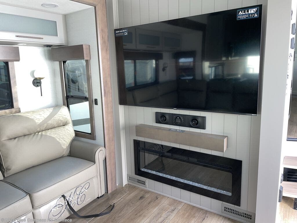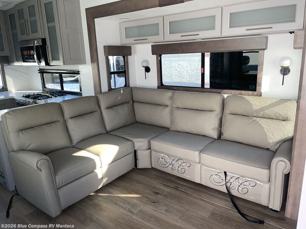 Escape the ordinary and experience the ultimate in luxury travel with this stunning fifth wheel! The rear kitchen is the heart of this fifth wheel, featuring a spacious pantry, 12V refrigerator, microwave, and overhead cabinets. Prepare delicious meals with ease and enjoy the convenience of a fully-equipped kitchen. Unwind in the spacious living area, featuring a plush trifold sofa, L-shape sofa, and a dual recliner love seat. Gather around the turntable dinette or relax in front of the stunning 65” TV. The full bathroom provides a serene space for personal care, while the front bedroom is a peaceful retreat with a comfortable queen bed and a flip-top dresser. Enjoy your favorite shows on the smart TV, perfect for relaxing after a day of adventure.