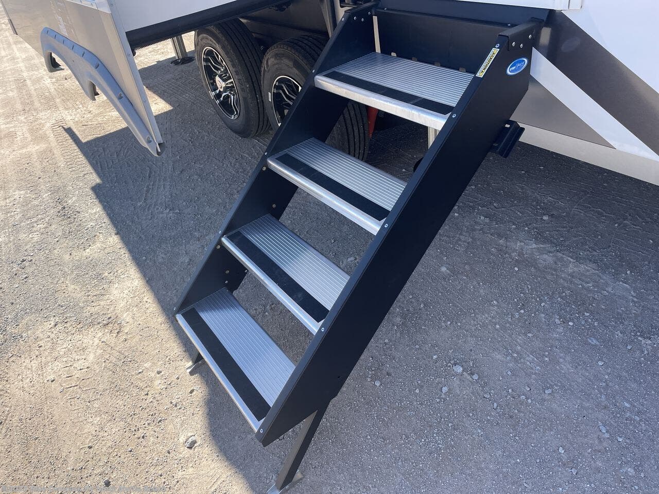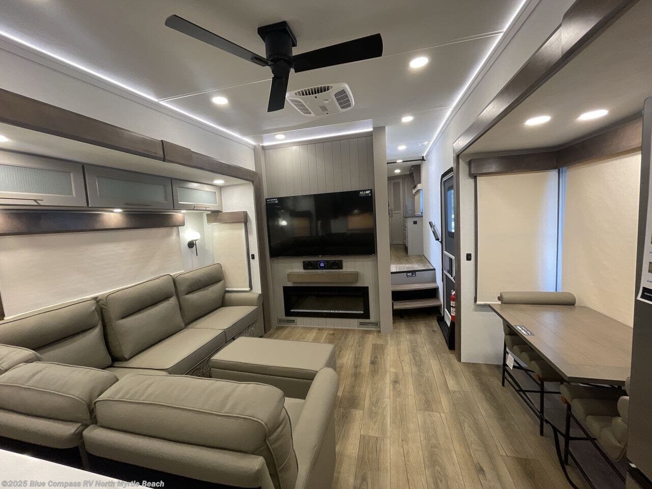 Escape the ordinary and experience the ultimate in luxury travel with this stunning fifth wheel! The rear kitchen is the heart of this fifth wheel, featuring a spacious pantry, 12V refrigerator, microwave, and overhead cabinets. Prepare delicious meals with ease and enjoy the convenience of a fully-equipped kitchen. Unwind in the spacious living area, featuring a plush trifold sofa, L-shape sofa, and a dual recliner love seat. Gather around the turntable dinette or relax in front of the stunning 65” TV. The full bathroom provides a serene space for personal care, while the front bedroom is a peaceful retreat with a comfortable queen bed and a flip-top dresser. Enjoy your favorite shows on the smart TV, perfect for relaxing after a day of adventure.