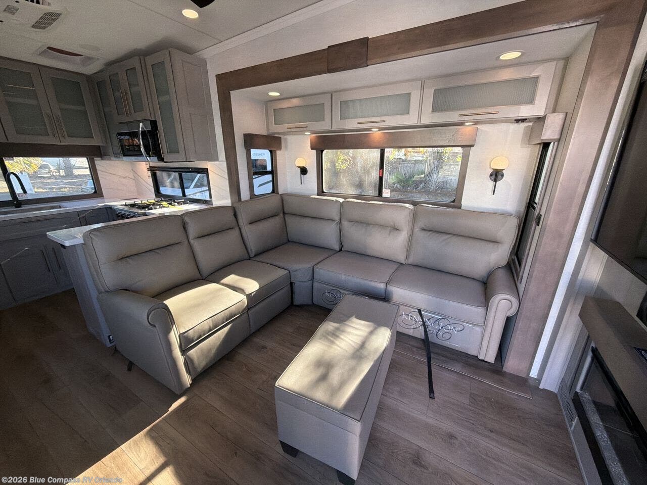 Escape the ordinary and experience the ultimate in luxury travel with this stunning fifth wheel! The rear kitchen is the heart of this fifth wheel, featuring a spacious pantry, 12V refrigerator, microwave, and overhead cabinets. Prepare delicious meals with ease and enjoy the convenience of a fully-equipped kitchen. Unwind in the spacious living area, featuring a plush trifold sofa, L-shape sofa, and a dual recliner love seat. Gather around the turntable dinette or relax in front of the stunning 65” TV. The full bathroom provides a serene space for personal care, while the front bedroom is a peaceful retreat with a comfortable queen bed and a flip-top dresser. Enjoy your favorite shows on the smart TV, perfect for relaxing after a day of adventure.