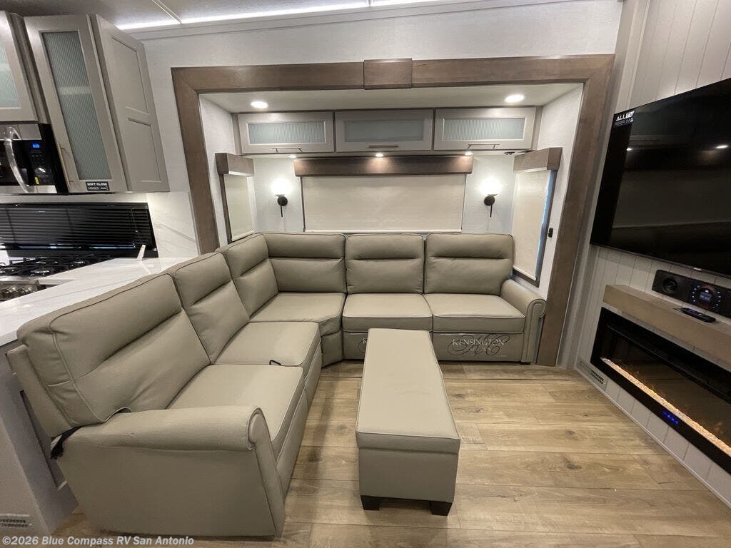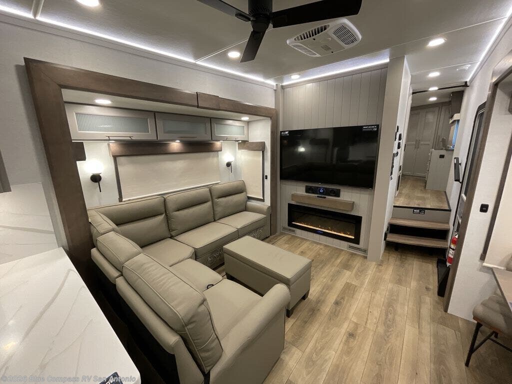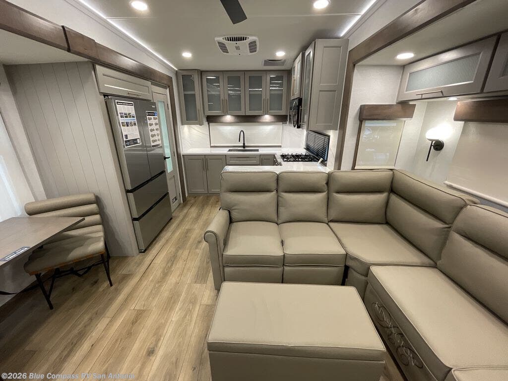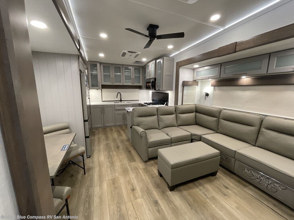 Escape the ordinary and experience the ultimate in luxury travel with this stunning fifth wheel! The rear kitchen is the heart of this fifth wheel, featuring a spacious pantry, 12V refrigerator, microwave, and overhead cabinets. Prepare delicious meals with ease and enjoy the convenience of a fully-equipped kitchen. Unwind in the spacious living area, featuring a plush trifold sofa, L-shape sofa, and a dual recliner love seat. Gather around the turntable dinette or relax in front of the stunning 65” TV. The full bathroom provides a serene space for personal care, while the front bedroom is a peaceful retreat with a comfortable queen bed and a flip-top dresser. Enjoy your favorite shows on the smart TV, perfect for relaxing after a day of adventure.