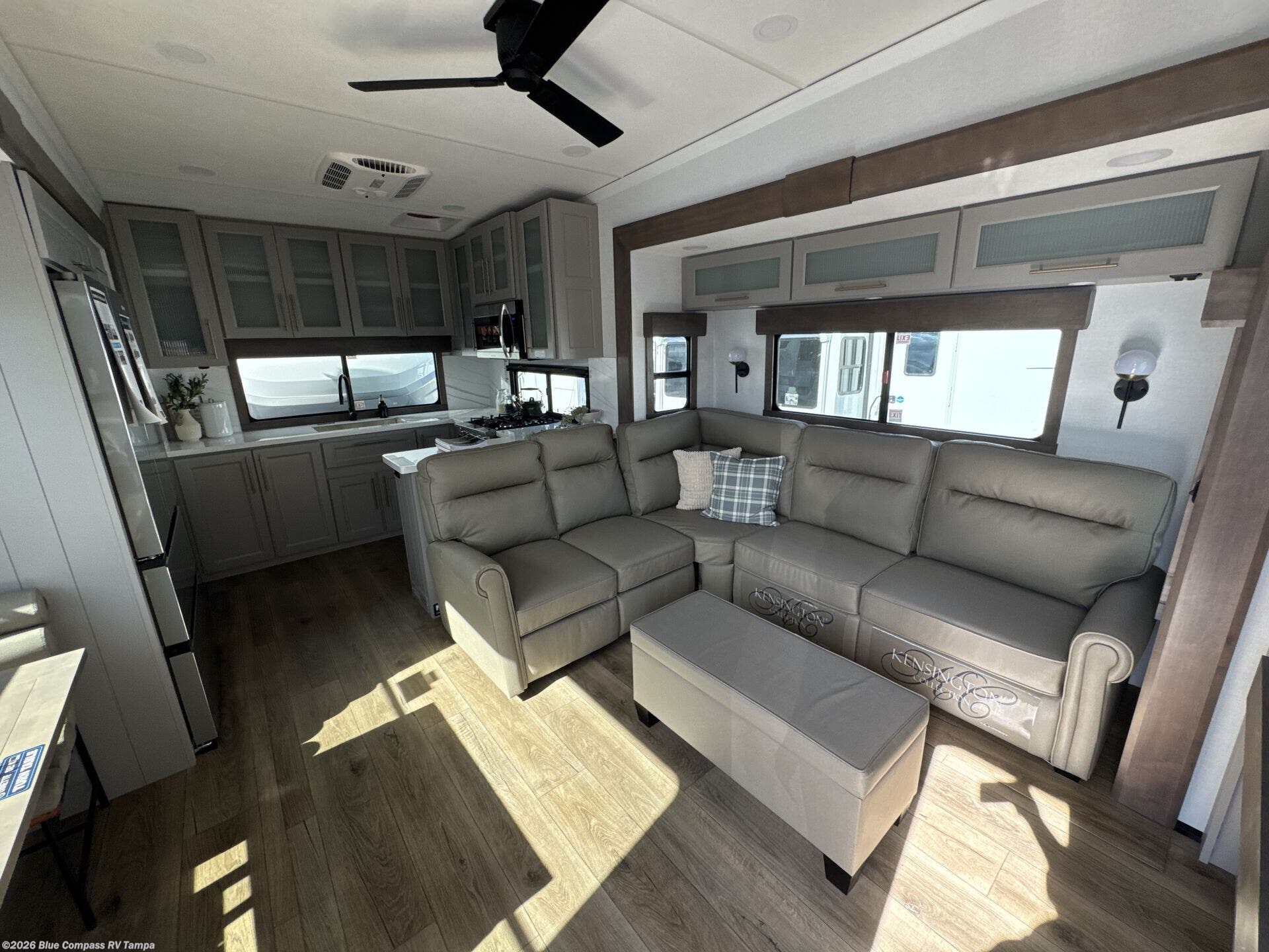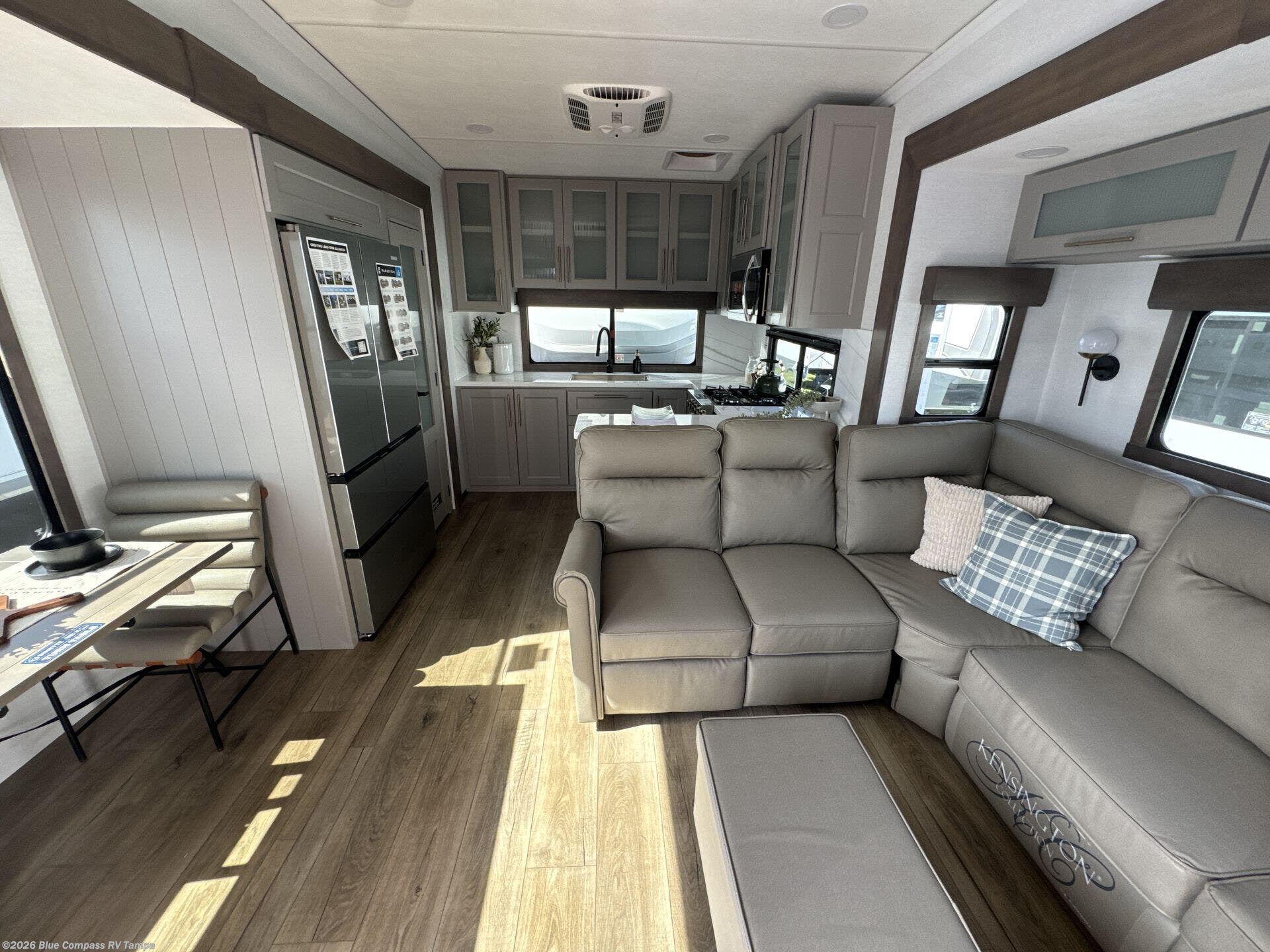 Escape the ordinary and experience the ultimate in luxury travel with this stunning fifth wheel! The rear kitchen is the heart of this fifth wheel, featuring a spacious pantry, 12V refrigerator, microwave, and overhead cabinets. Prepare delicious meals with ease and enjoy the convenience of a fully-equipped kitchen. Unwind in the spacious living area, featuring a plush trifold sofa, L-shape sofa, and a dual recliner love seat. Gather around the turntable dinette or relax in front of the stunning 65” TV. The full bathroom provides a serene space for personal care, while the front bedroom is a peaceful retreat with a comfortable queen bed and a flip-top dresser. Enjoy your favorite shows on the smart TV, perfect for relaxing after a day of adventure.