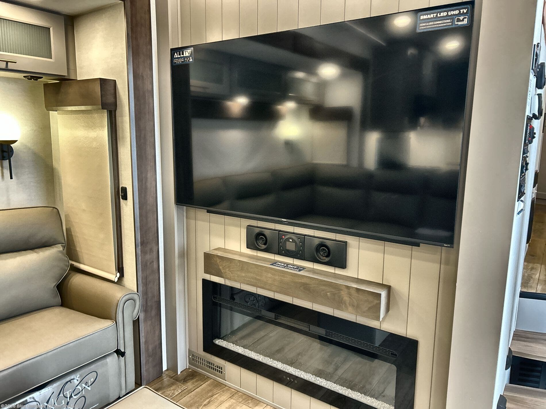 Escape the ordinary and experience the ultimate in luxury travel with this stunning fifth wheel! The rear kitchen is the heart of this fifth wheel, featuring a spacious pantry, 12V refrigerator, microwave, and overhead cabinets. Prepare delicious meals with ease and enjoy the convenience of a fully-equipped kitchen. Unwind in the spacious living area, featuring a plush trifold sofa, L-shape sofa, and a dual recliner love seat. Gather around the turntable dinette or relax in front of the stunning 65” TV. The full bathroom provides a serene space for personal care, while the front bedroom is a peaceful retreat with a comfortable queen bed and a flip-top dresser. Enjoy your favorite shows on the smart TV, perfect for relaxing after a day of adventure.