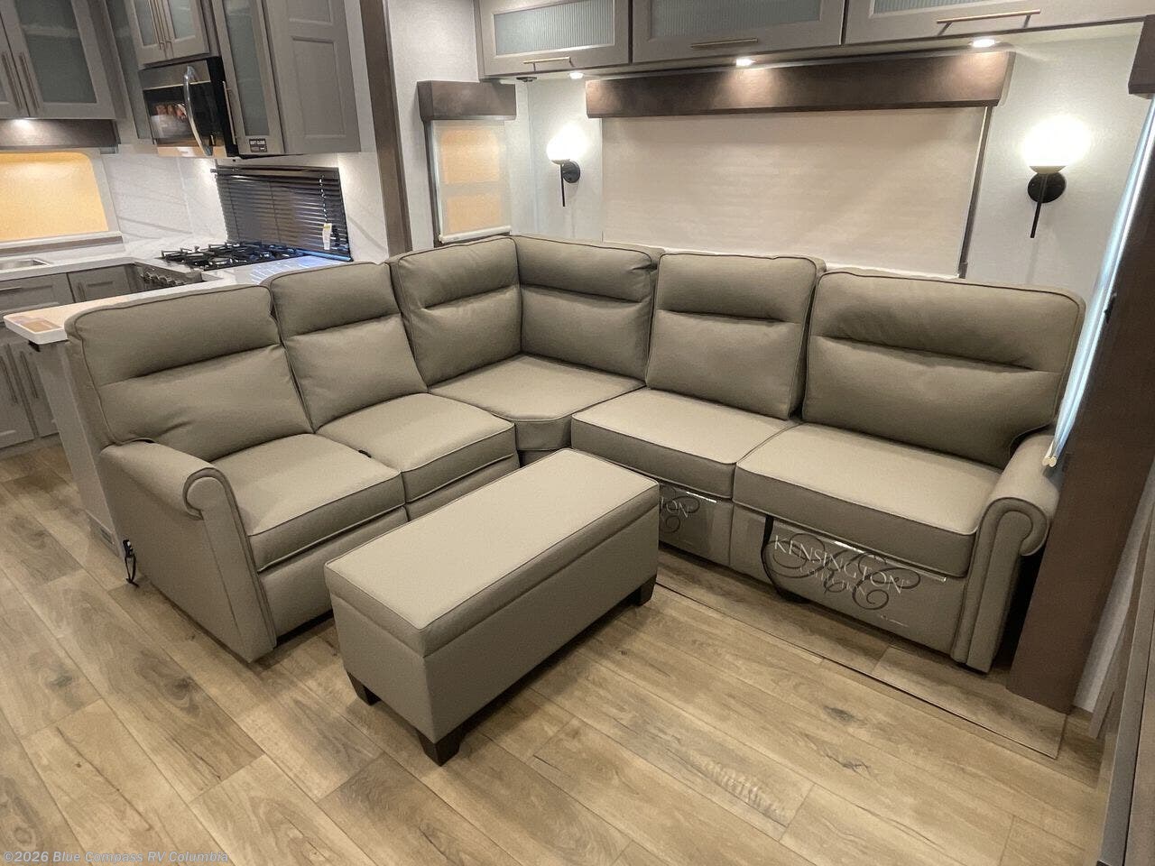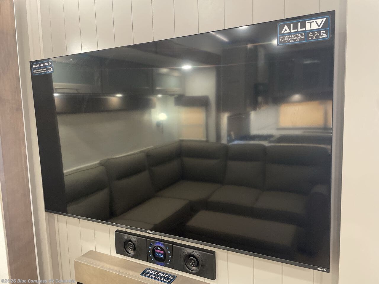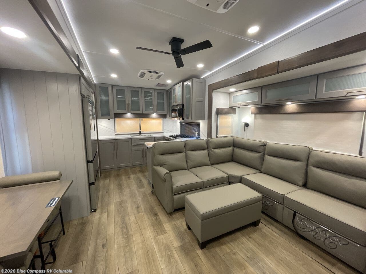 Escape the ordinary and experience the ultimate in luxury travel with this stunning fifth wheel! The rear kitchen is the heart of this fifth wheel, featuring a spacious pantry, 12V refrigerator, microwave, and overhead cabinets. Prepare delicious meals with ease and enjoy the convenience of a fully-equipped kitchen. Unwind in the spacious living area, featuring a plush trifold sofa, L-shape sofa, and a dual recliner love seat. Gather around the turntable dinette or relax in front of the stunning 65” TV. The full bathroom provides a serene space for personal care, while the front bedroom is a peaceful retreat with a comfortable queen bed and a flip-top dresser. Enjoy your favorite shows on the smart TV, perfect for relaxing after a day of adventure.