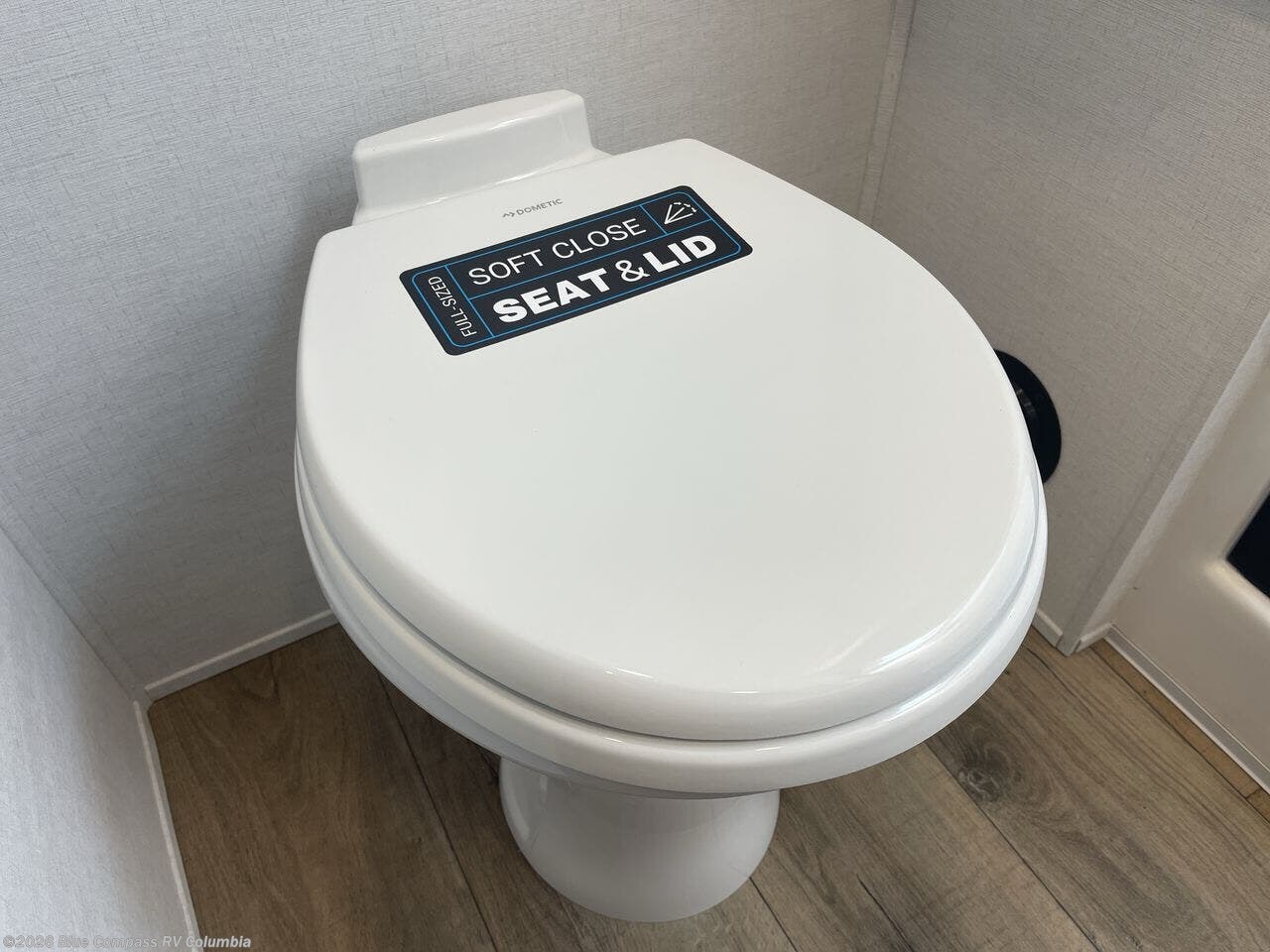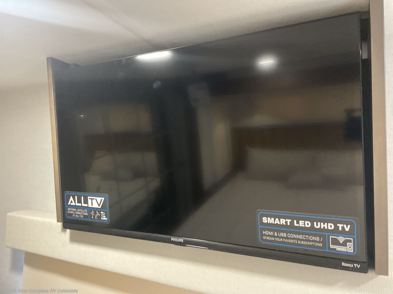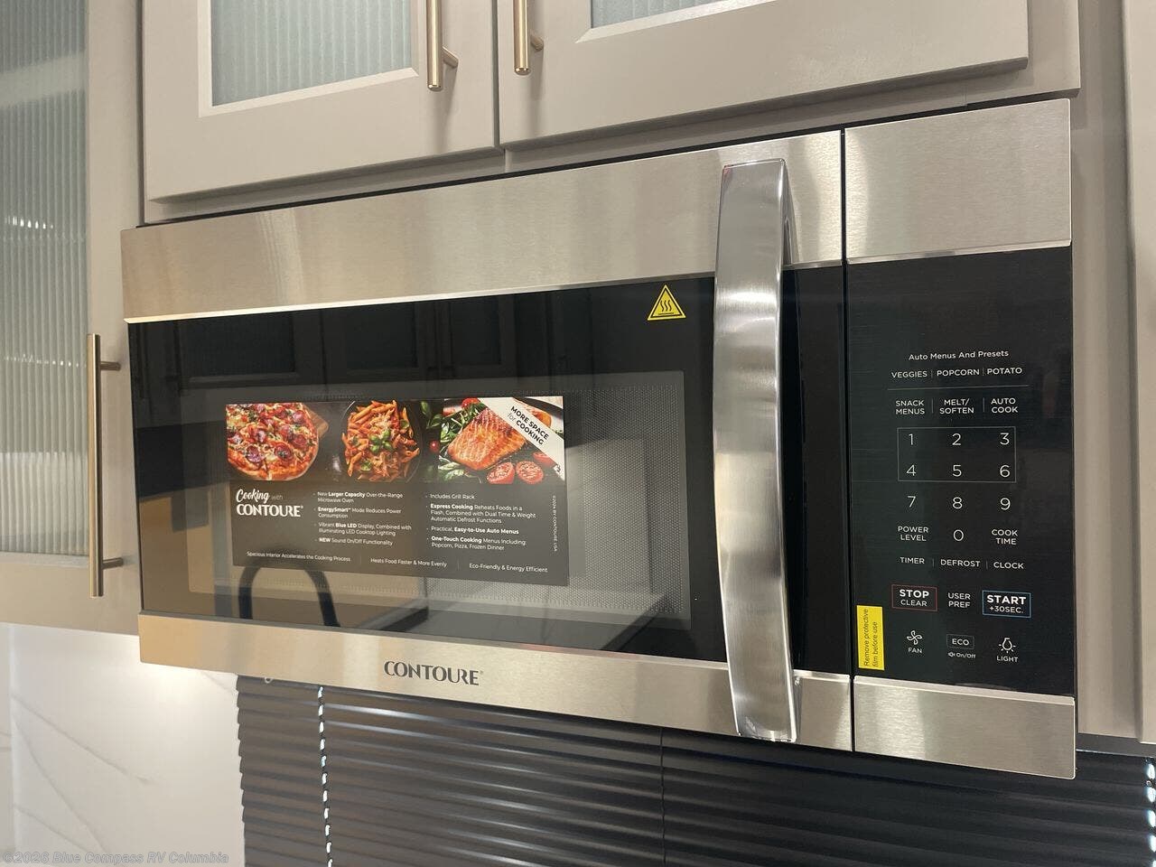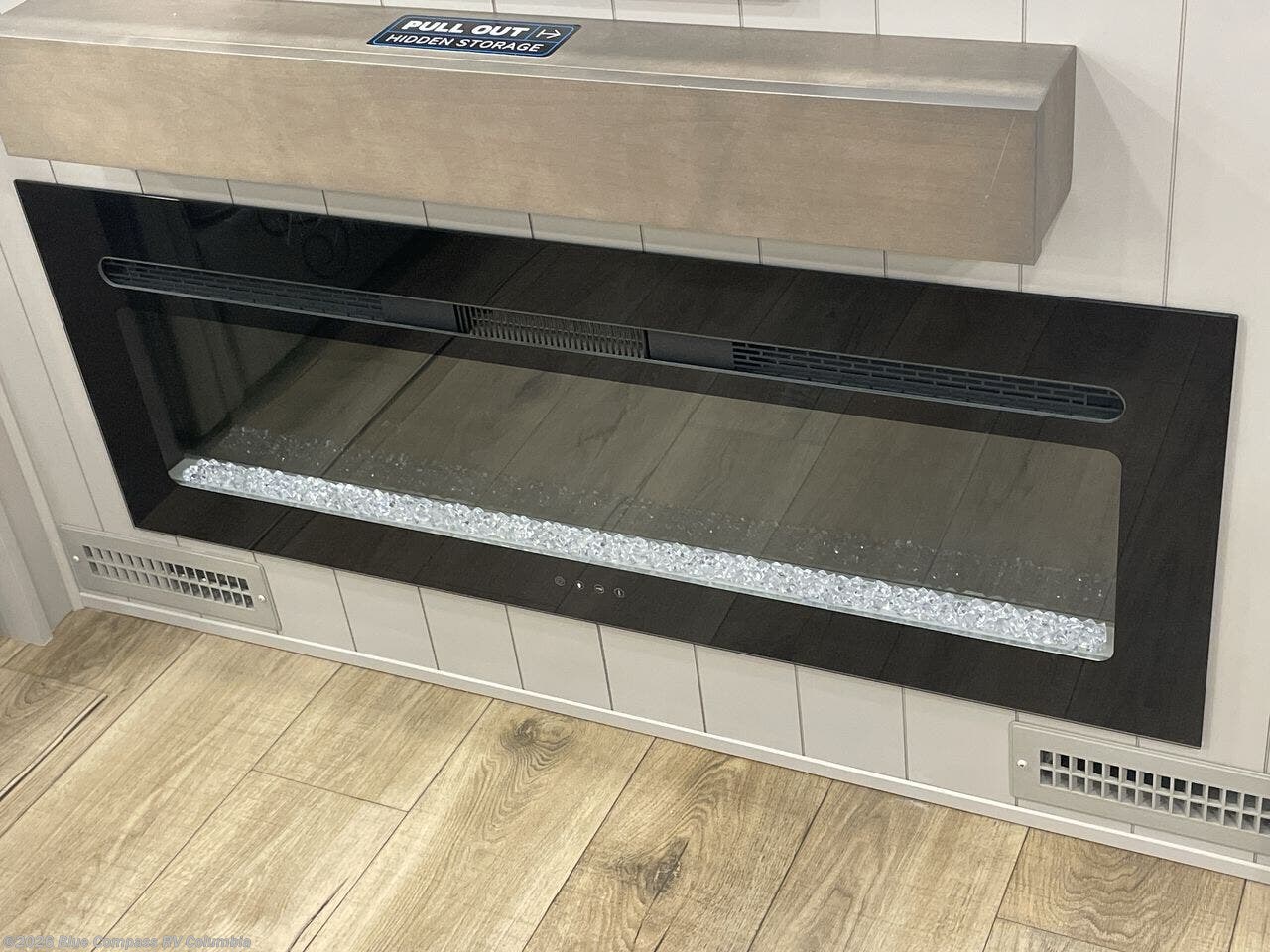 Escape the ordinary and experience the ultimate in luxury travel with this stunning fifth wheel! The rear kitchen is the heart of this fifth wheel, featuring a spacious pantry, 12V refrigerator, microwave, and overhead cabinets. Prepare delicious meals with ease and enjoy the convenience of a fully-equipped kitchen. Unwind in the spacious living area, featuring a plush trifold sofa, L-shape sofa, and a dual recliner love seat. Gather around the turntable dinette or relax in front of the stunning 65” TV. The full bathroom provides a serene space for personal care, while the front bedroom is a peaceful retreat with a comfortable queen bed and a flip-top dresser. Enjoy your favorite shows on the smart TV, perfect for relaxing after a day of adventure.