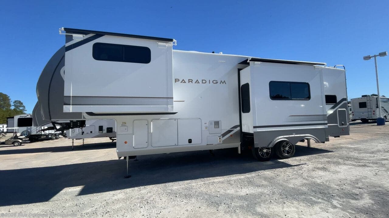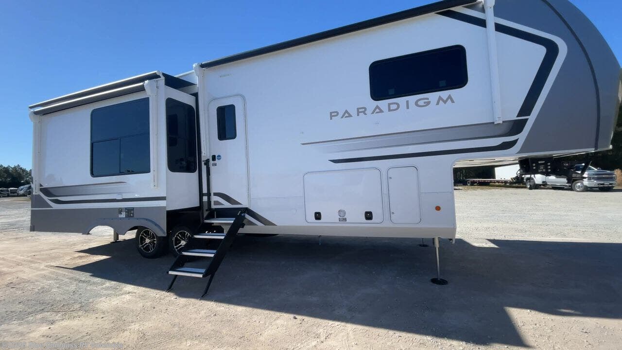 The Paradigm fifth wheels by Alliance RV are functional, high-quality, and luxurious for an unforgettable camping experience. There are three A/C units and a 40K BTU furnace to keep you comfortable year around, and you'll appreciate additional convenient amenities, like the all-in-one enclosed/heated utility center and the color coded and numbered wiring. A Helux Series coil spring pin box comes standard for hassle-free towing, along with Curt 8,000 lb. axles. You'll love the kitchen with its LG solid surface countertops and Lusso range, plus there is LED motion lighting in the pantry and a Maxx fan with a rain sensor to keep everything fresh when making dinner. Each model also includes an HD Smart TV in the living room and bedroom. And of course there are a variety of options you can choose from to further customize your fifth wheel; dual pane windows, Super Solar Plus, slide out awning toppers, and generator prep or a generator to name a few!