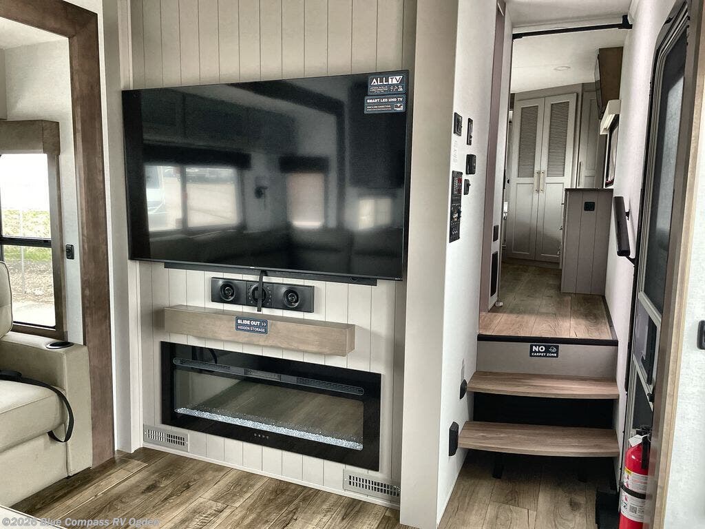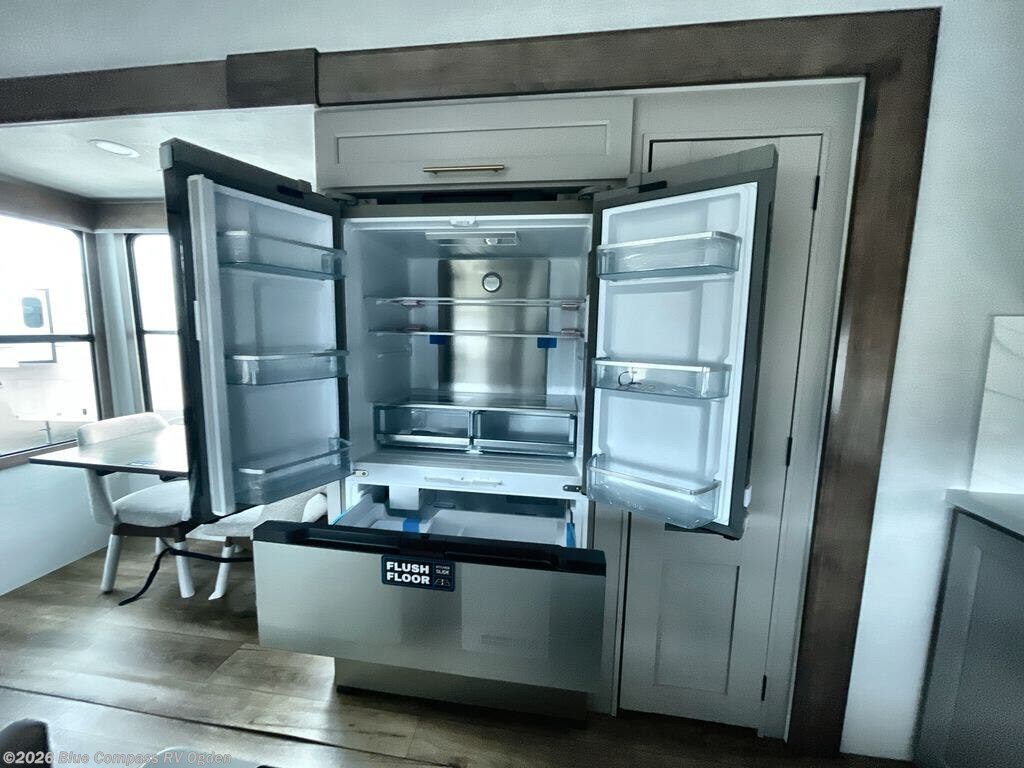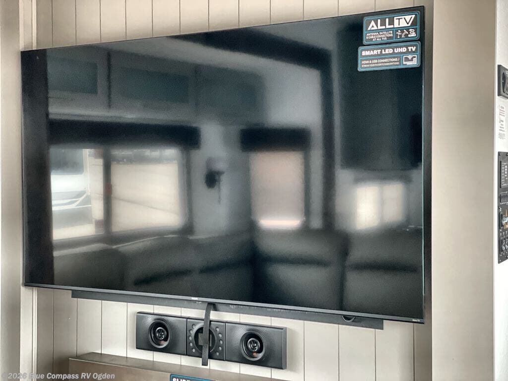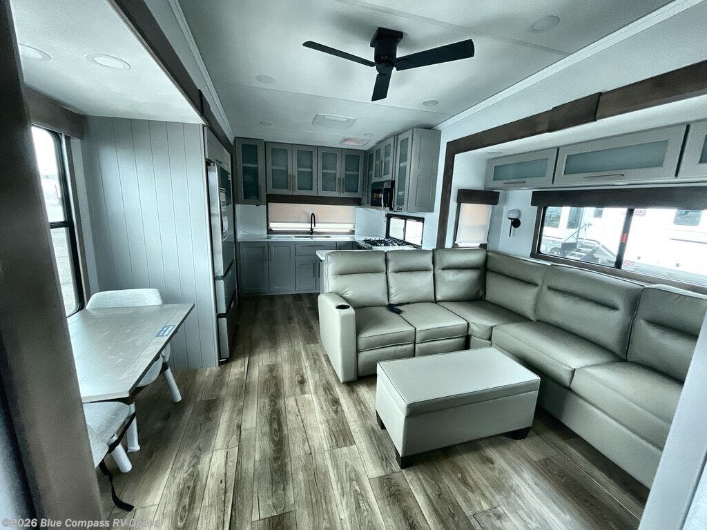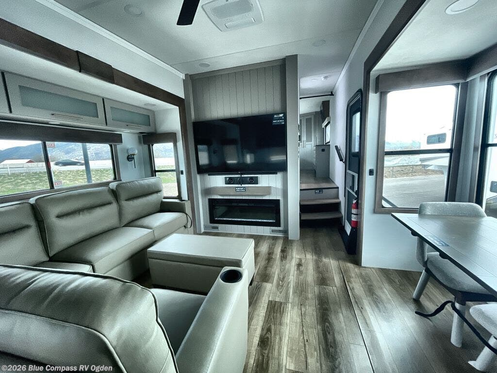 Escape the ordinary and experience the ultimate in luxury travel with this stunning fifth wheel! The rear kitchen is the heart of this fifth wheel, featuring a spacious pantry, 12V refrigerator, microwave, and overhead cabinets. Prepare delicious meals with ease and enjoy the convenience of a fully-equipped kitchen. Unwind in the spacious living area, featuring a plush trifold sofa, L-shape sofa, and a dual recliner love seat. Gather around the turntable dinette or relax in front of the stunning 65” TV. The full bathroom provides a serene space for personal care, while the front bedroom is a peaceful retreat with a comfortable queen bed and a flip-top dresser. Enjoy your favorite shows on the smart TV, perfect for relaxing after a day of adventure.
