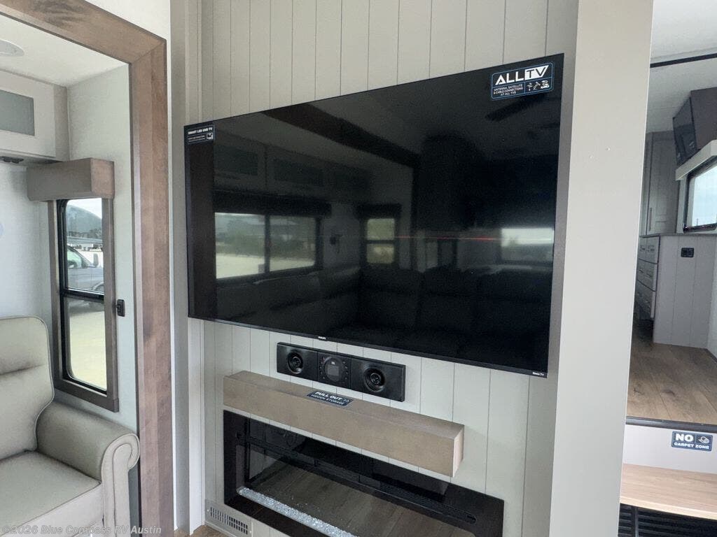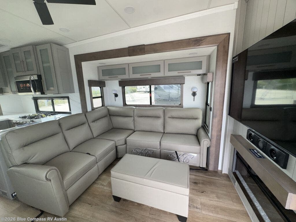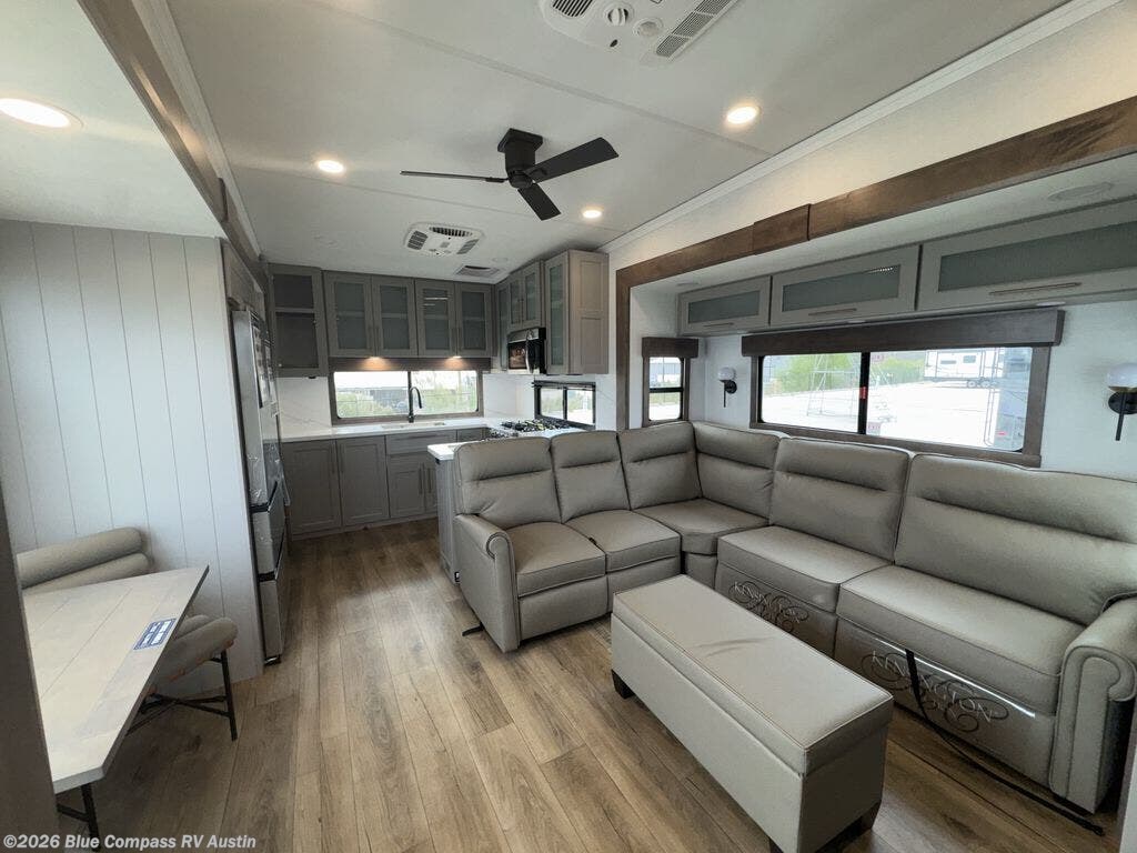 Escape the ordinary and experience the ultimate in luxury travel with this stunning fifth wheel! The rear kitchen is the heart of this fifth wheel, featuring a spacious pantry, 12V refrigerator, microwave, and overhead cabinets. Prepare delicious meals with ease and enjoy the convenience of a fully-equipped kitchen. Unwind in the spacious living area, featuring a plush trifold sofa, L-shape sofa, and a dual recliner love seat. Gather around the turntable dinette or relax in front of the stunning 65” TV. The full bathroom provides a serene space for personal care, while the front bedroom is a peaceful retreat with a comfortable queen bed and a flip-top dresser. Enjoy your favorite shows on the smart TV, perfect for relaxing after a day of adventure.