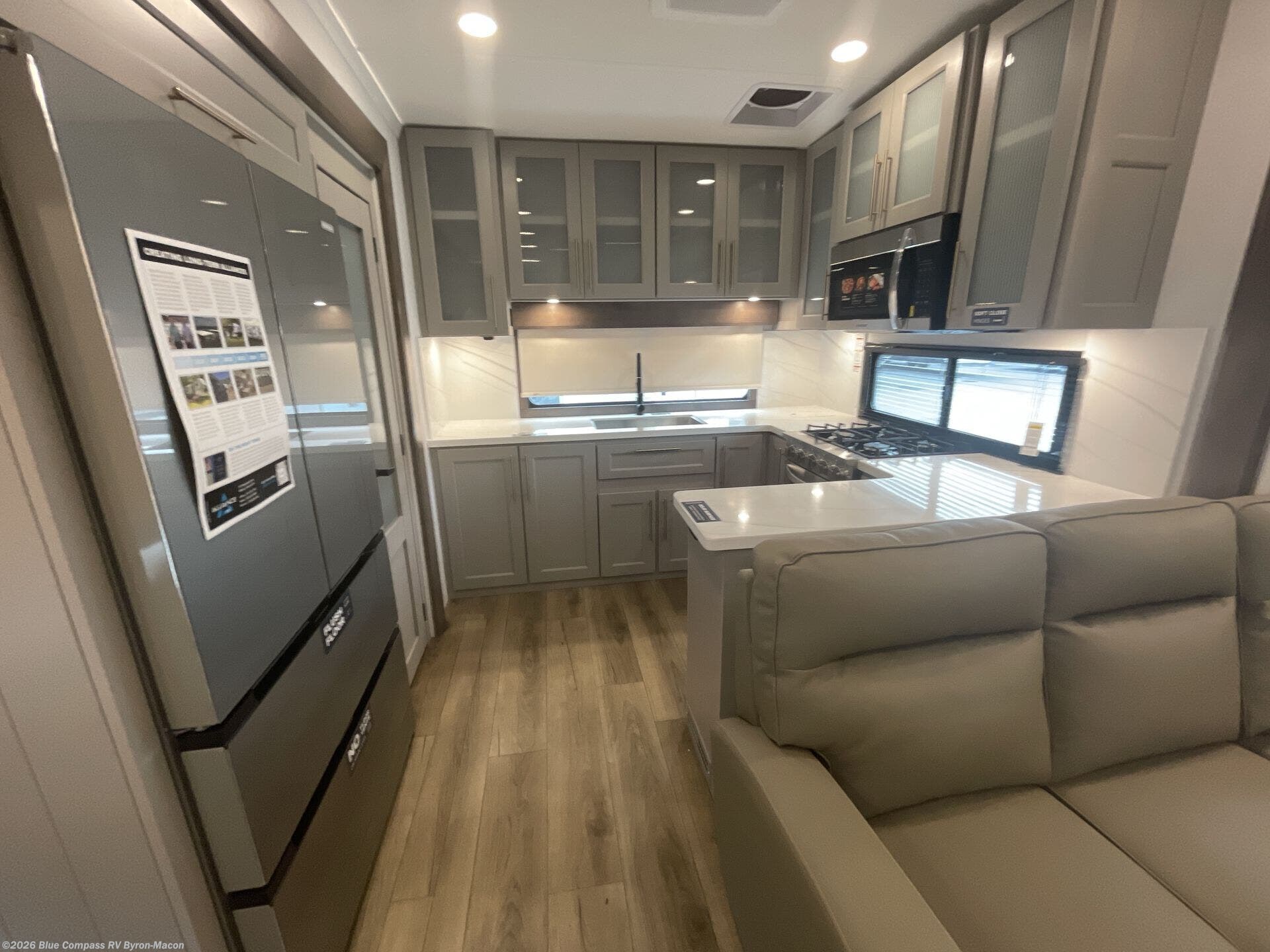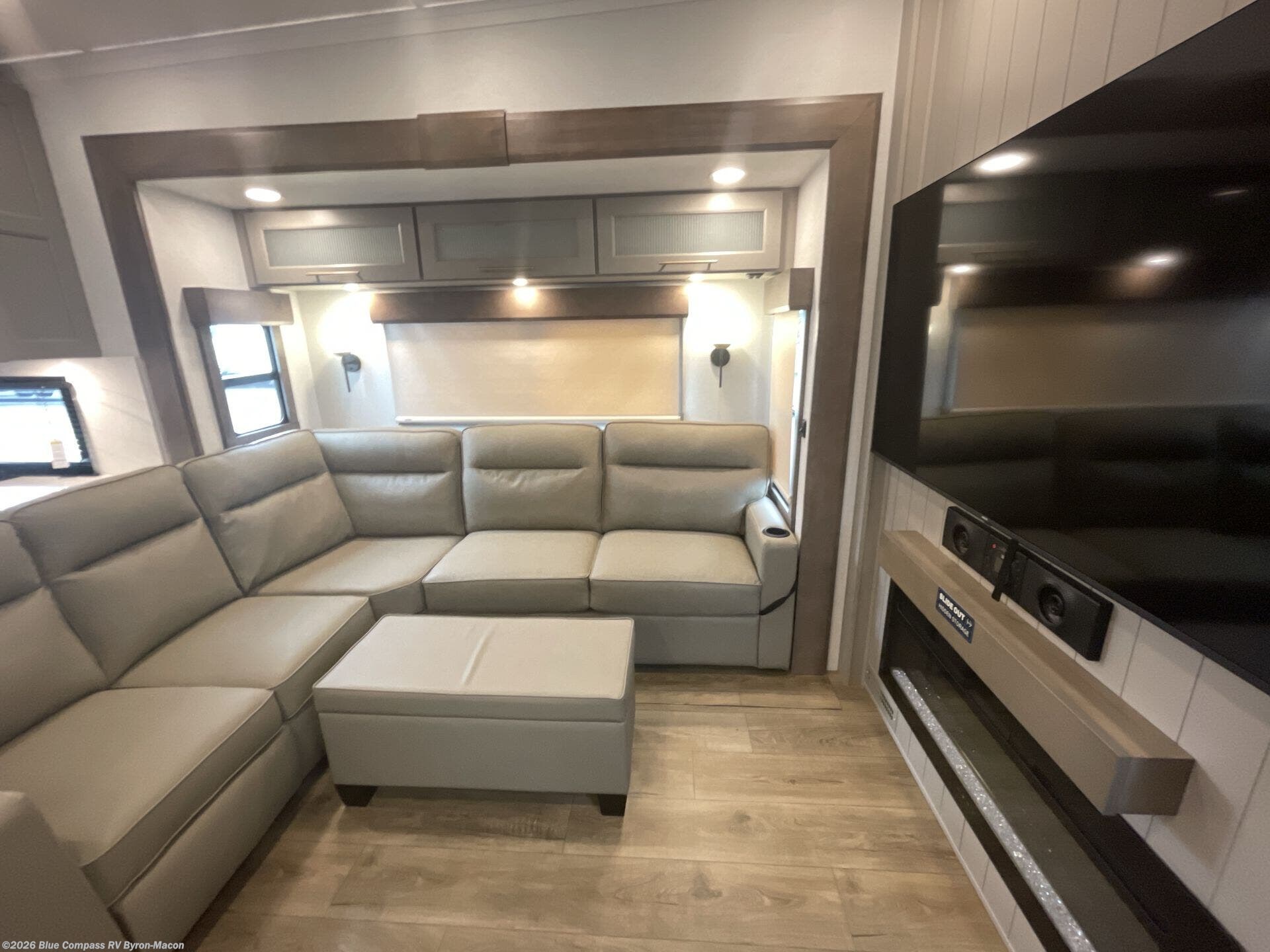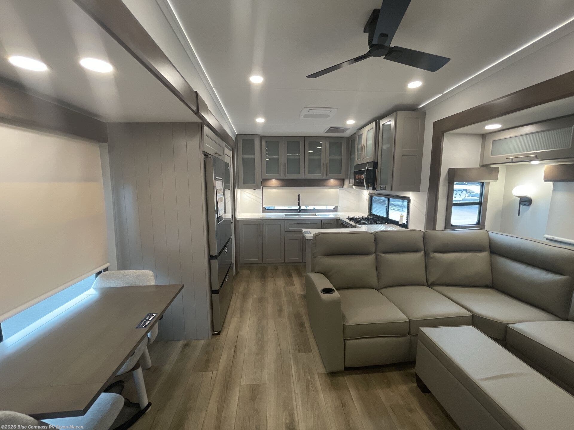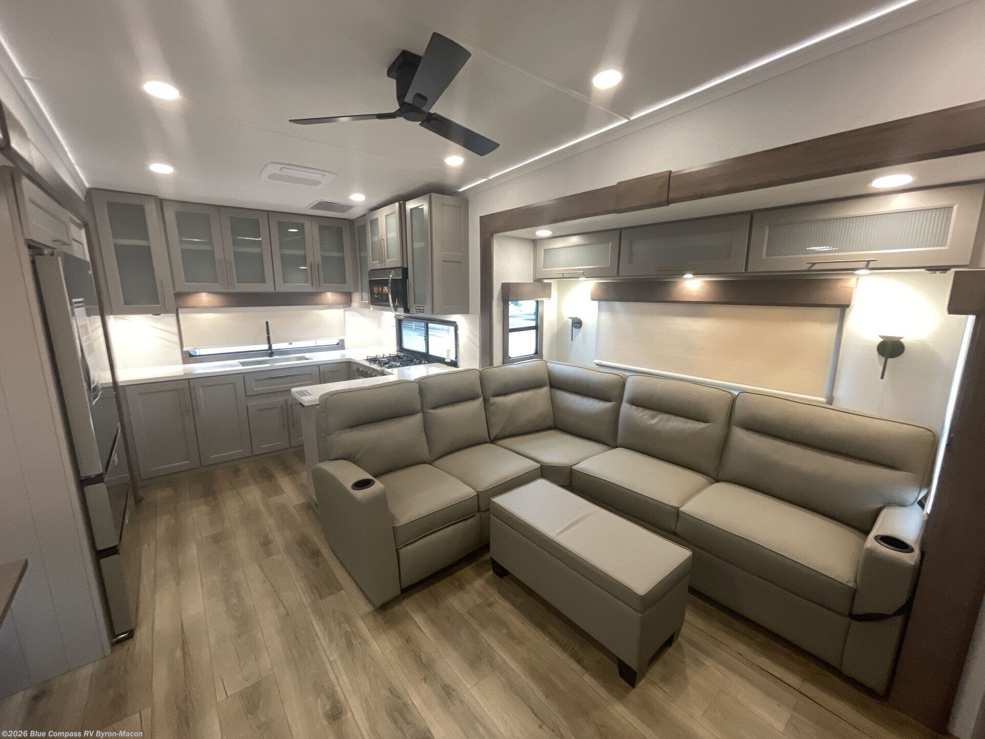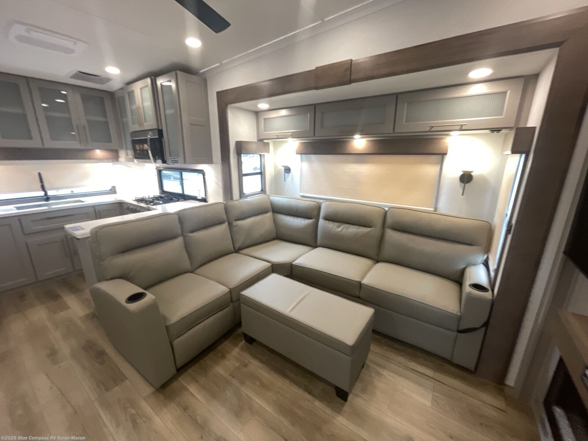 Escape the ordinary and experience the ultimate in luxury travel with this stunning fifth wheel! The rear kitchen is the heart of this fifth wheel, featuring a spacious pantry, 12V refrigerator, microwave, and overhead cabinets. Prepare delicious meals with ease and enjoy the convenience of a fully-equipped kitchen. Unwind in the spacious living area, featuring a plush trifold sofa, L-shape sofa, and a dual recliner love seat. Gather around the turntable dinette or relax in front of the stunning 65” TV. The full bathroom provides a serene space for personal care, while the front bedroom is a peaceful retreat with a comfortable queen bed and a flip-top dresser. Enjoy your favorite shows on the smart TV, perfect for relaxing after a day of adventure.