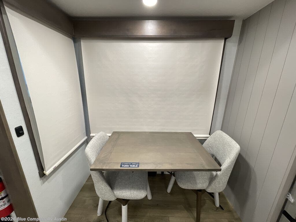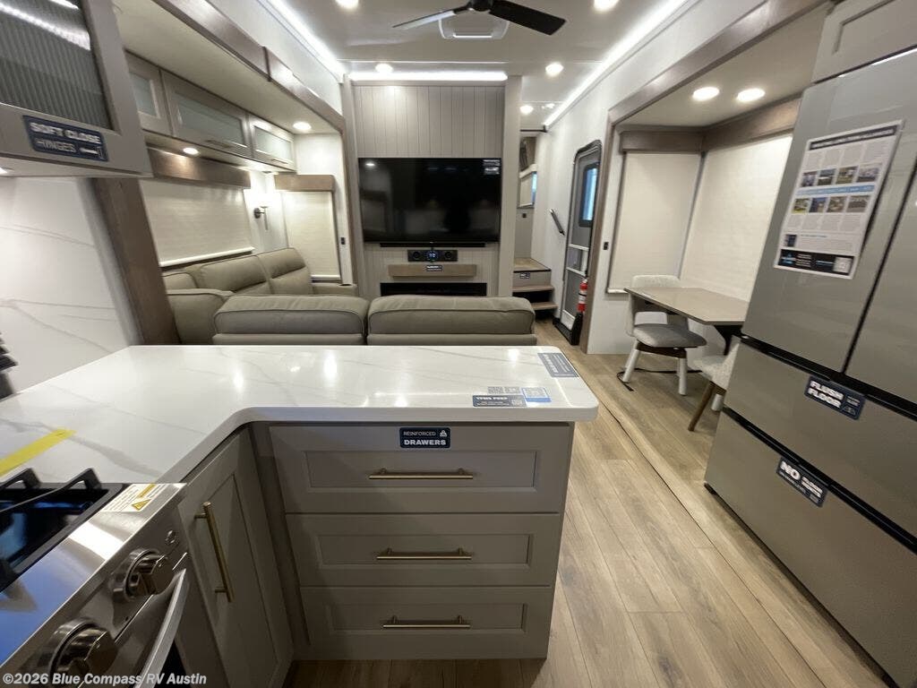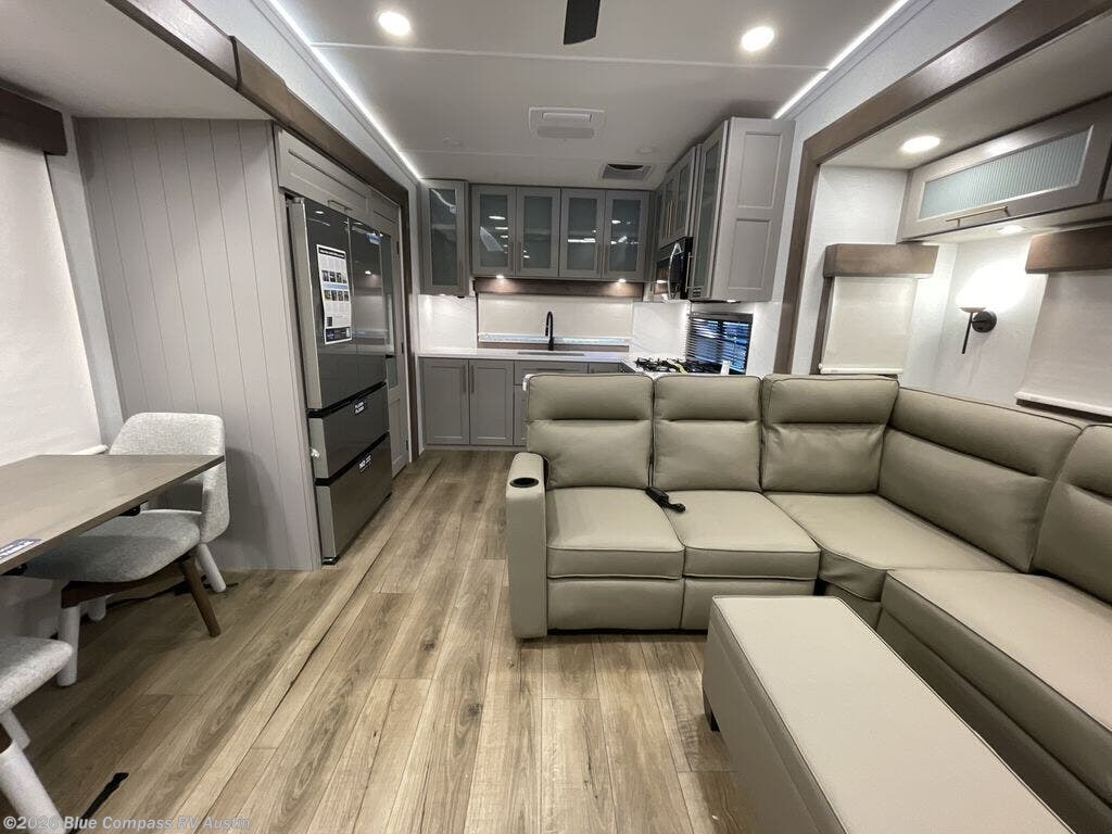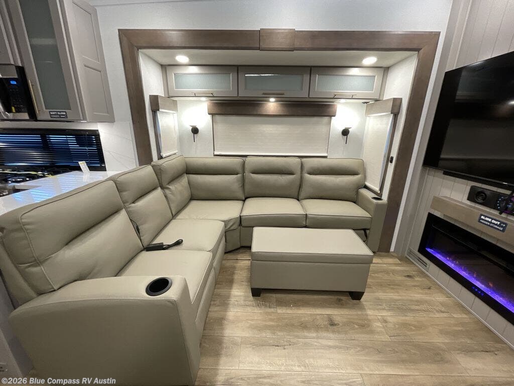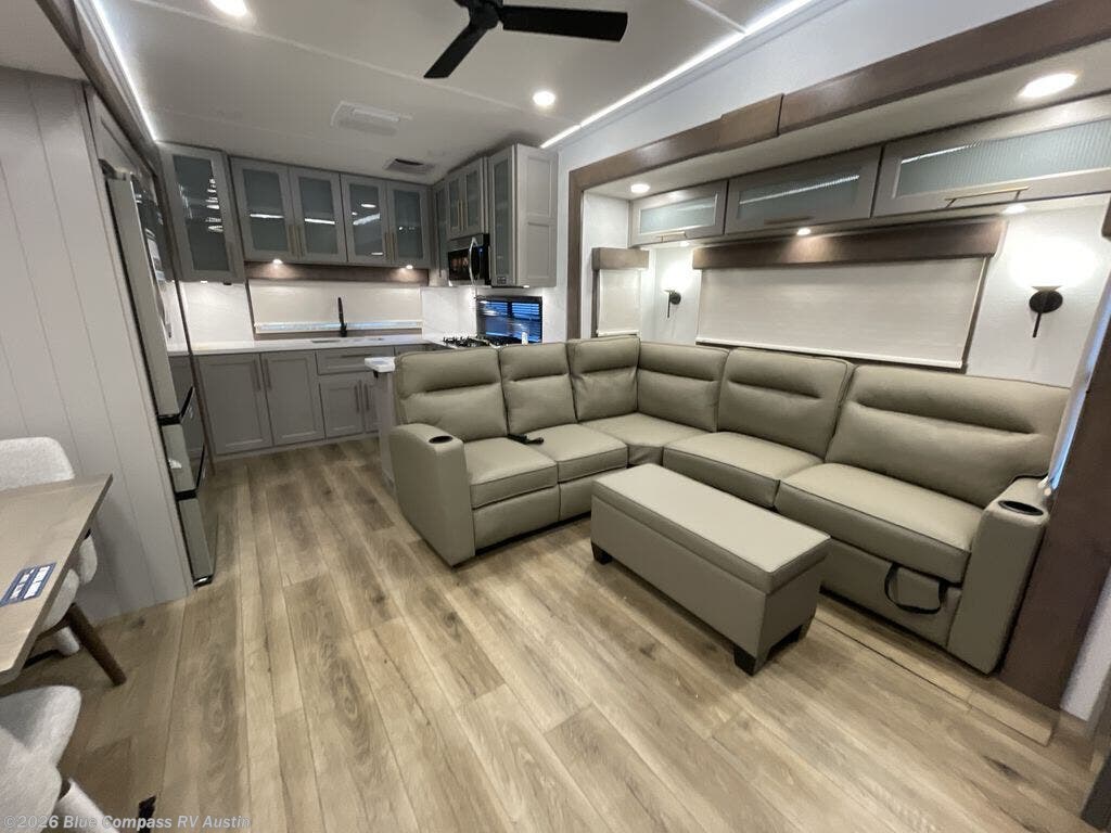 Escape the ordinary and experience the ultimate in luxury travel with this stunning fifth wheel! The rear kitchen is the heart of this fifth wheel, featuring a spacious pantry, 12V refrigerator, microwave, and overhead cabinets. Prepare delicious meals with ease and enjoy the convenience of a fully-equipped kitchen. Unwind in the spacious living area, featuring a plush trifold sofa, L-shape sofa, and a dual recliner love seat. Gather around the turntable dinette or relax in front of the stunning 65” TV. The full bathroom provides a serene space for personal care, while the front bedroom is a peaceful retreat with a comfortable queen bed and a flip-top dresser. Enjoy your favorite shows on the smart TV, perfect for relaxing after a day of adventure.