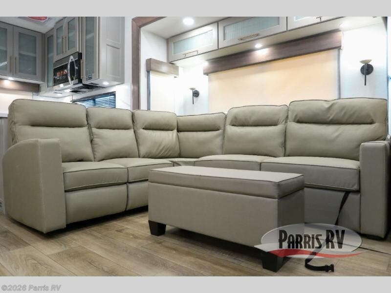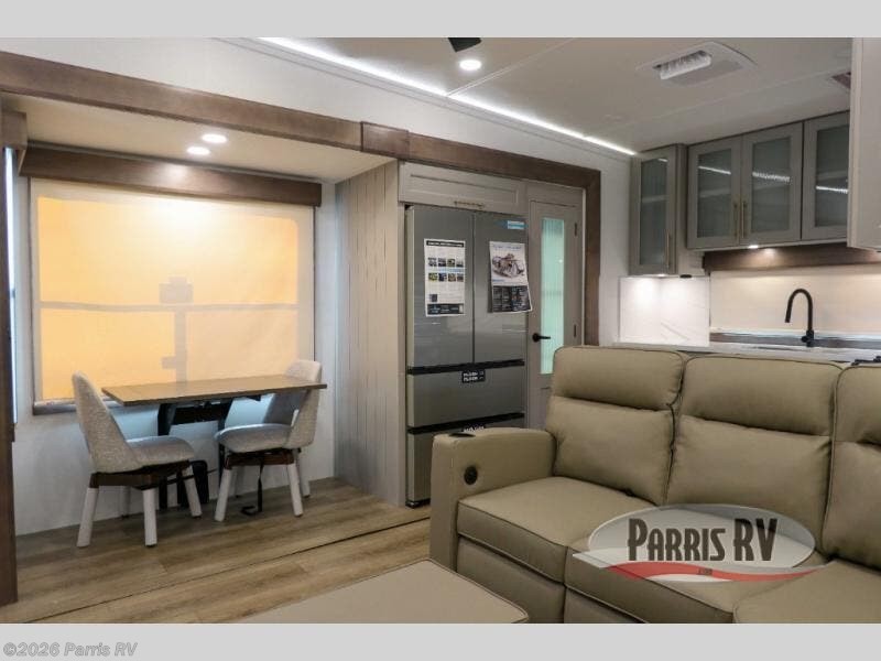 Escape the ordinary and experience the ultimate in luxury travel with this stunning fifth wheel! The rear kitchen is the heart of this fifth wheel, featuring a spacious pantry, 12V refrigerator, microwave, and overhead cabinets. Prepare delicious meals with ease and enjoy the convenience of a fully-equipped kitchen. Unwind in the spacious living area, featuring a plush trifold sofa, L-shape sofa, and a dual recliner love seat. Gather around the turntable dinette or relax in front of the stunning 65” TV. The full bathroom provides a serene space for personal care, while the front bedroom is a peaceful retreat with a comfortable queen bed and a flip-top dresser. Enjoy your favorite shows on the smart TV, perfect for relaxing after a day of adventure.