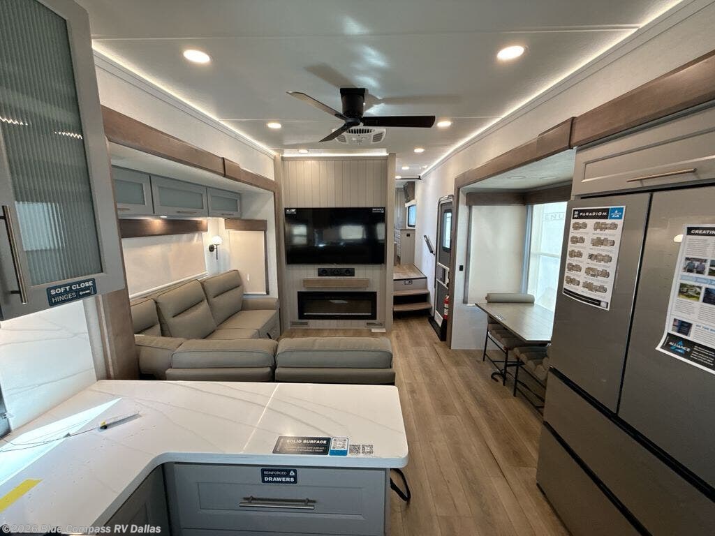 The Paradigm fifth wheels by Alliance RV are functional, high-quality, and luxurious for an unforgettable camping experience. There are three A/C units and a 40K BTU furnace to keep you comfortable year around, and you'll appreciate additional convenient amenities, like the all-in-one enclosed/heated utility center and the color coded and numbered wiring. A Helux Series coil spring pin box comes standard for hassle-free towing, along with Curt 8,000 lb. axles. You'll love the kitchen with its LG solid surface countertops and Lusso range, plus there is LED motion lighting in the pantry and a Maxx fan with a rain sensor to keep everything fresh when making dinner. Each model also includes an HD Smart TV in the living room and bedroom. And of course there are a variety of options you can choose from to further customize your fifth wheel; dual pane windows, Super Solar Plus, slide out awning toppers, and generator prep or a generator to name a few!