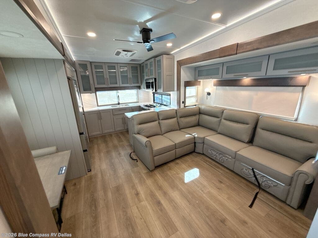 Escape the ordinary and experience the ultimate in luxury travel with this stunning fifth wheel! The rear kitchen is the heart of this fifth wheel, featuring a spacious pantry, 12V refrigerator, microwave, and overhead cabinets. Prepare delicious meals with ease and enjoy the convenience of a fully-equipped kitchen. Unwind in the spacious living area, featuring a plush trifold sofa, L-shape sofa, and a dual recliner love seat. Gather around the turntable dinette or relax in front of the stunning 65” TV. The full bathroom provides a serene space for personal care, while the front bedroom is a peaceful retreat with a comfortable queen bed and a flip-top dresser. Enjoy your favorite shows on the smart TV, perfect for relaxing after a day of adventure.
