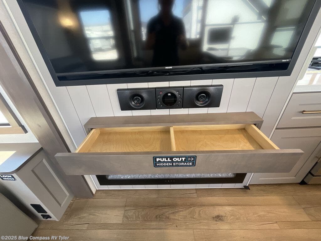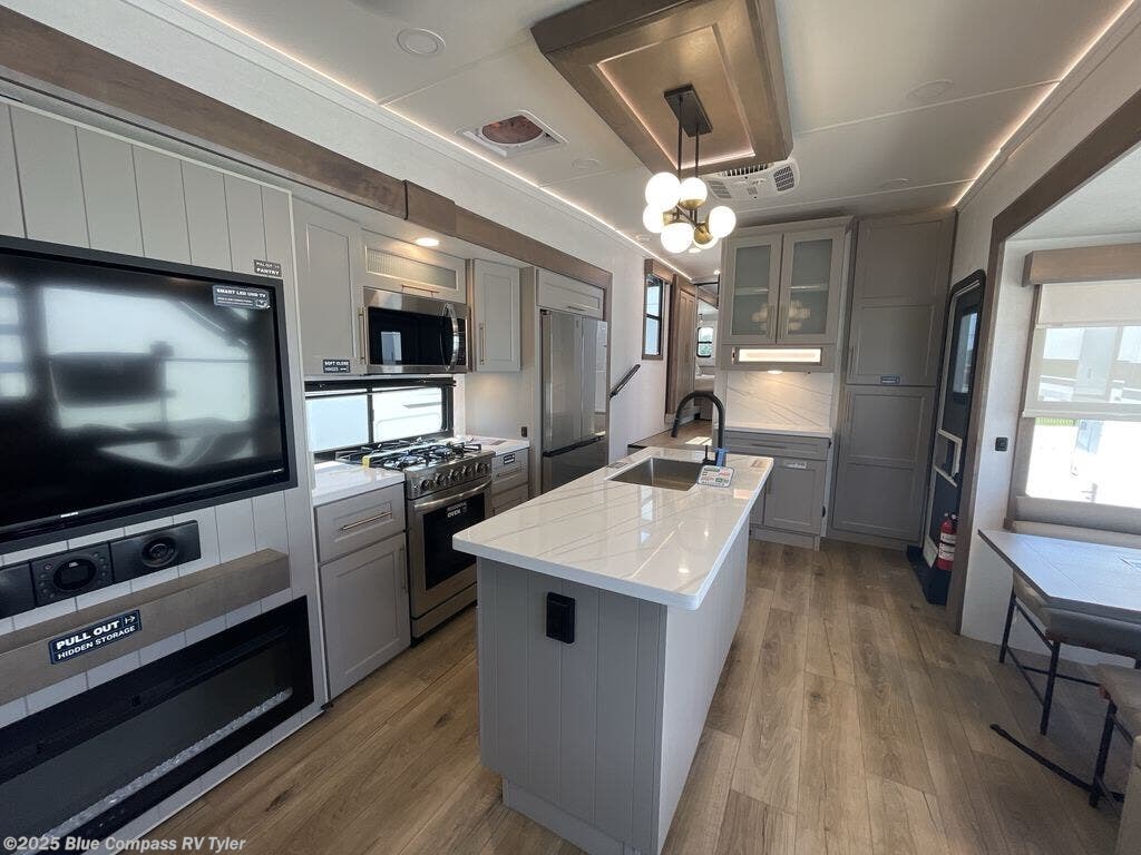 Travel to see family and friends while living in this RV or while on vacation! You will love the spacious rear living area thanks to the dual opposing slides which include the kitchen amenities and the 50" Smart TV with a fireplace. There is also a hidden pantry storage behind the TV for smart storage spaces! You can get comfortable on the dual recliner love seat or dine at the swivel table and desk. The kitchen island includes a sink and counter space to utilize many ways, plus there is dishwasher prep if you want to add that option. The full bathroom is up the steps towards the front bedroom and includes a spacious 61" x 30" shower. You even have more floor space in the hallway thanks to the third slide out which includes shelf storage, plus more shelves and a king bed in the bedroom.