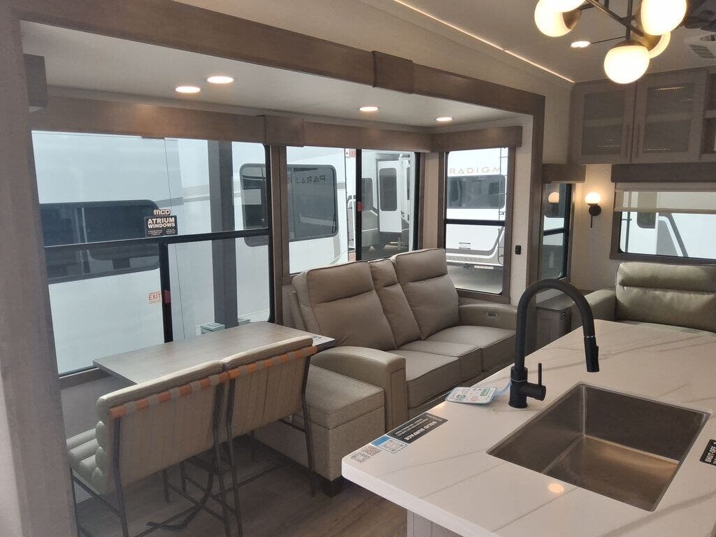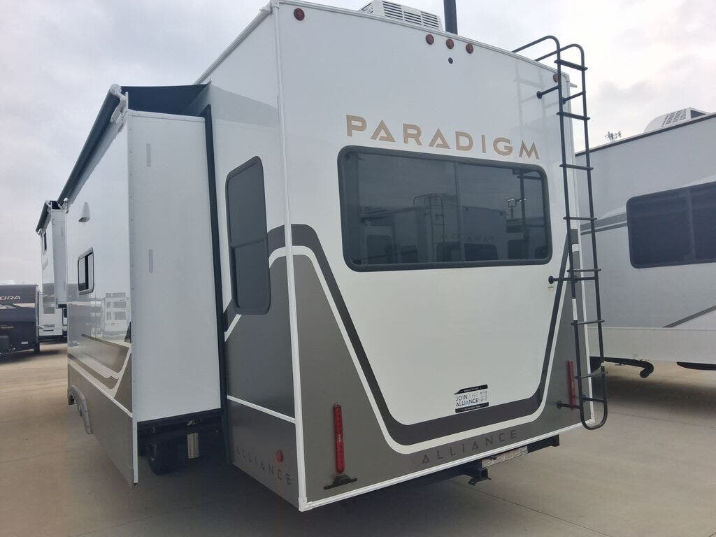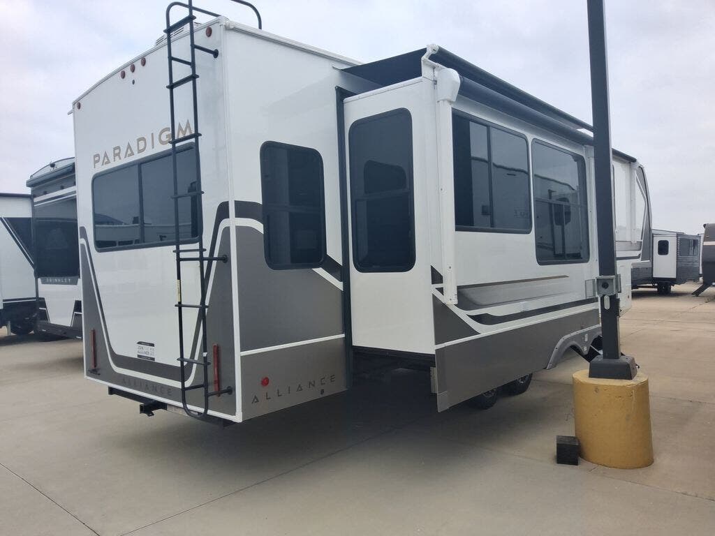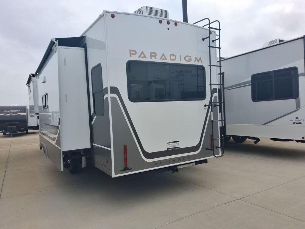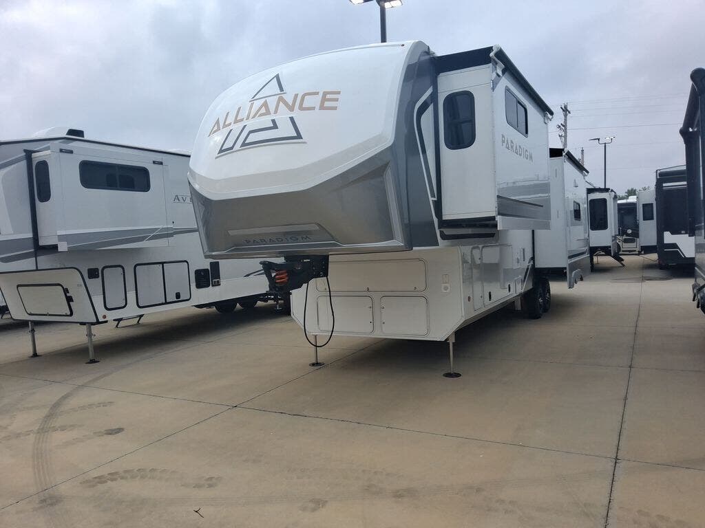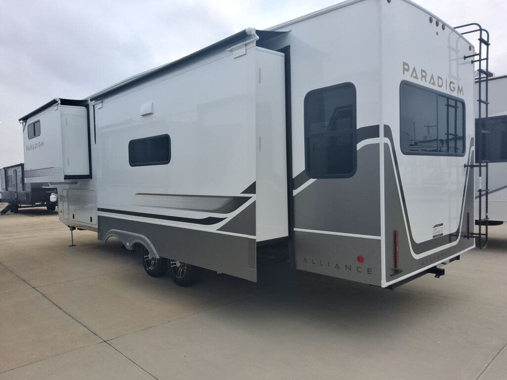 The Paradigm fifth wheels by Alliance RV are functional, high-quality, and luxurious for an unforgettable camping experience. There are three A/C units and a 40K BTU furnace to keep you comfortable year around, and you'll appreciate additional convenient amenities, like the all-in-one enclosed/heated utility center and the color coded and numbered wiring. A Rota-Flex pin box comes standard for hassle-free towing, along with Super-G 4,400 lb. rated tires and Dexter 7,000 lb. axles. You'll love the kitchen with its LG solid surface countertops and Lusso range, plus there is LED motion lighting in the pantry and a Maxx fan with a rain sensor to keep everything fresh when making dinner. Each model also includes an HD Smart TV in the living room and bedroom, plus a Winegard Air 360 antenna to keep you connected to the outside world. And of course there are a variety of options you can choose from to further customize your fifth wheel; dual pane windows, Super Solar Plus, slide out awning toppers, and generator prep or a generator to name a few!