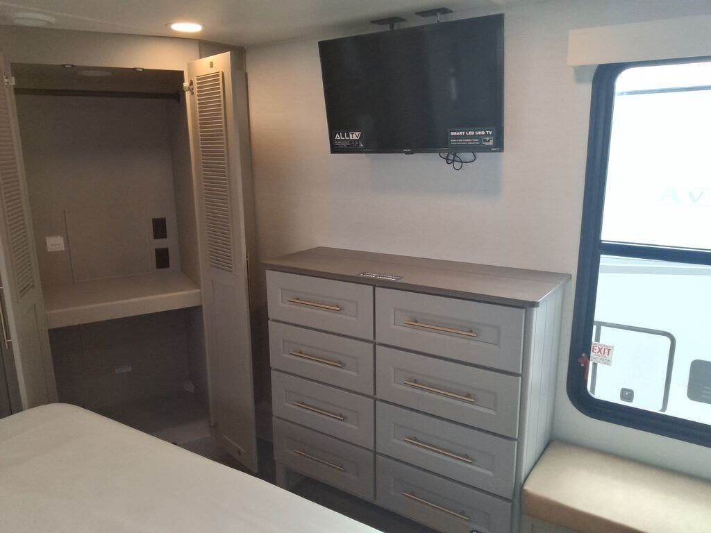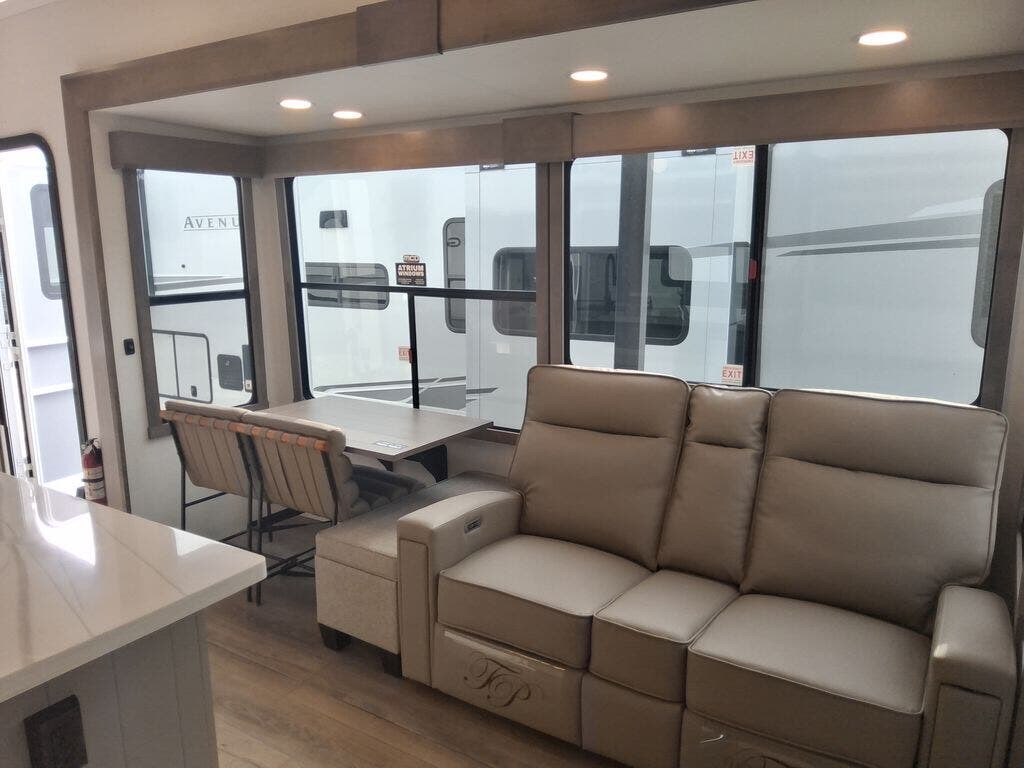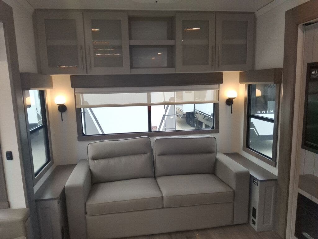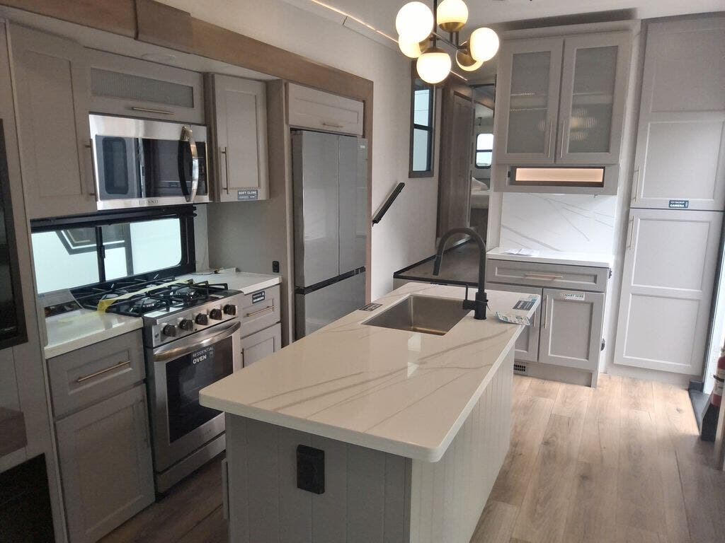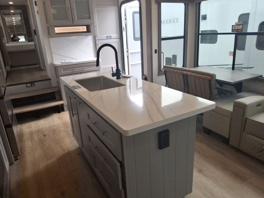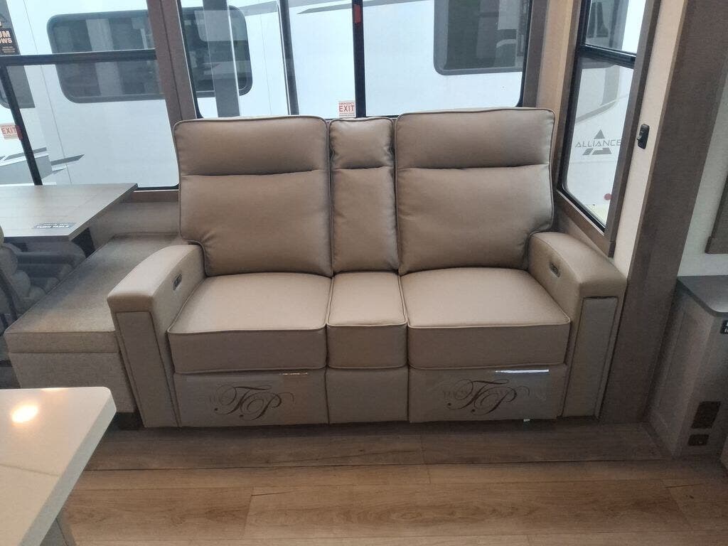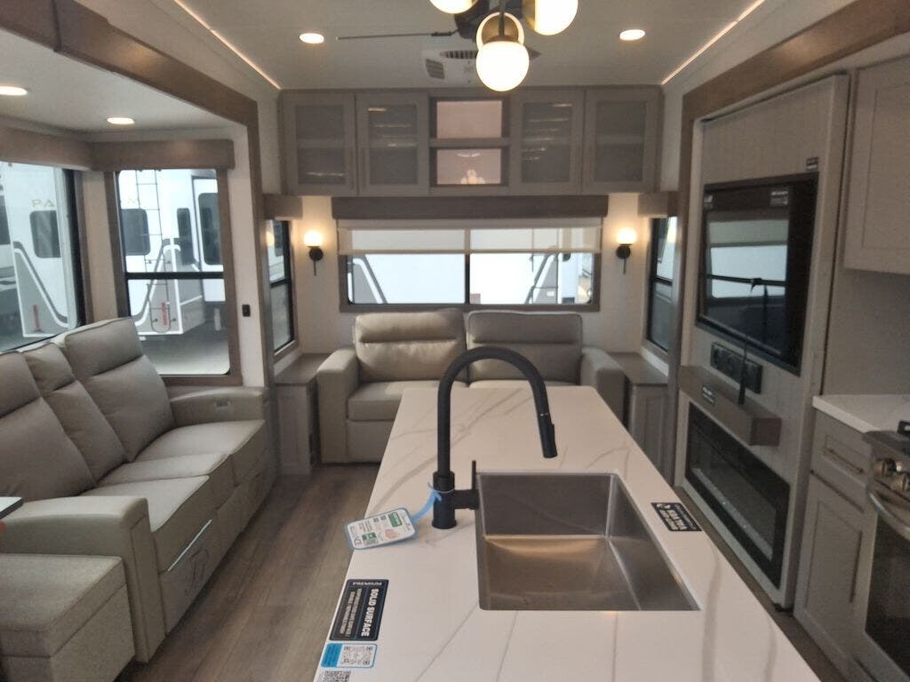 The Paradigm fifth wheels by Alliance RV are functional, high-quality, and luxurious for an unforgettable camping experience. There are three A/C units and a 40K BTU furnace to keep you comfortable year around, and you'll appreciate additional convenient amenities, like the all-in-one enclosed/heated utility center and the color coded and numbered wiring. A Rota-Flex pin box comes standard for hassle-free towing, along with Super-G 4,400 lb. rated tires and Dexter 7,000 lb. axles. You'll love the kitchen with its LG solid surface countertops and Lusso range, plus there is LED motion lighting in the pantry and a Maxx fan with a rain sensor to keep everything fresh when making dinner. Each model also includes an HD Smart TV in the living room and bedroom, plus a Winegard Air 360 antenna to keep you connected to the outside world. And of course there are a variety of options you can choose from to further customize your fifth wheel; dual pane windows, Super Solar Plus, slide out awning toppers, and generator prep or a generator to name a few!