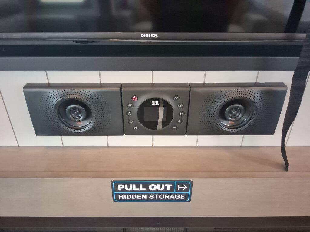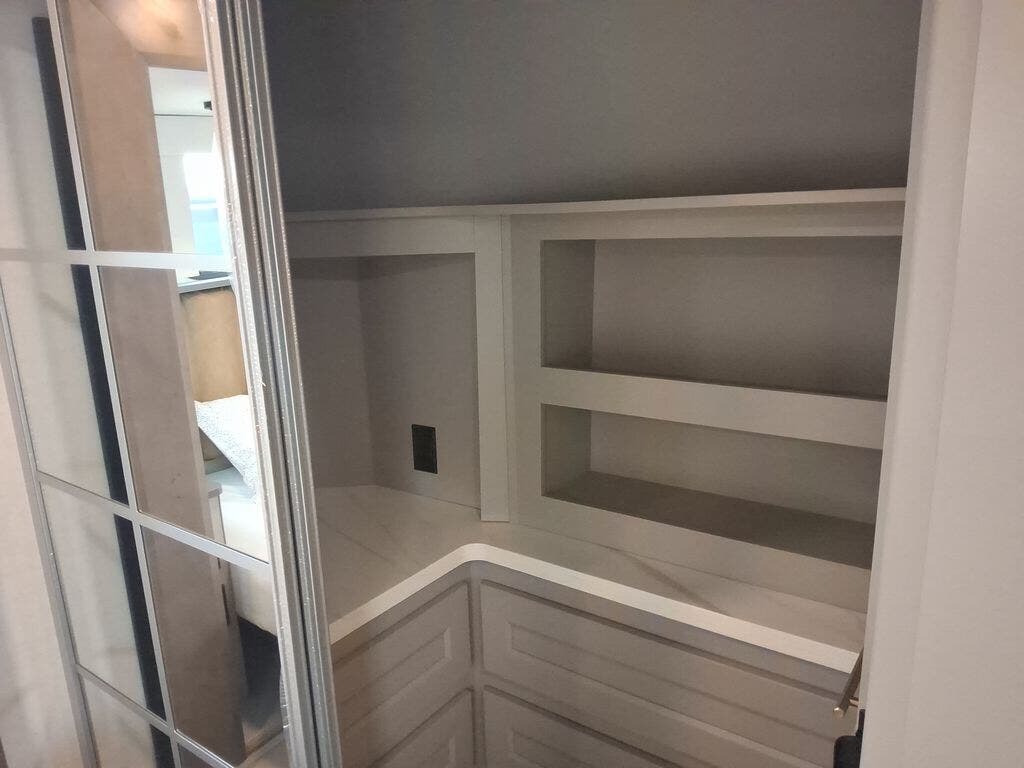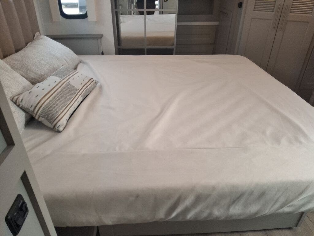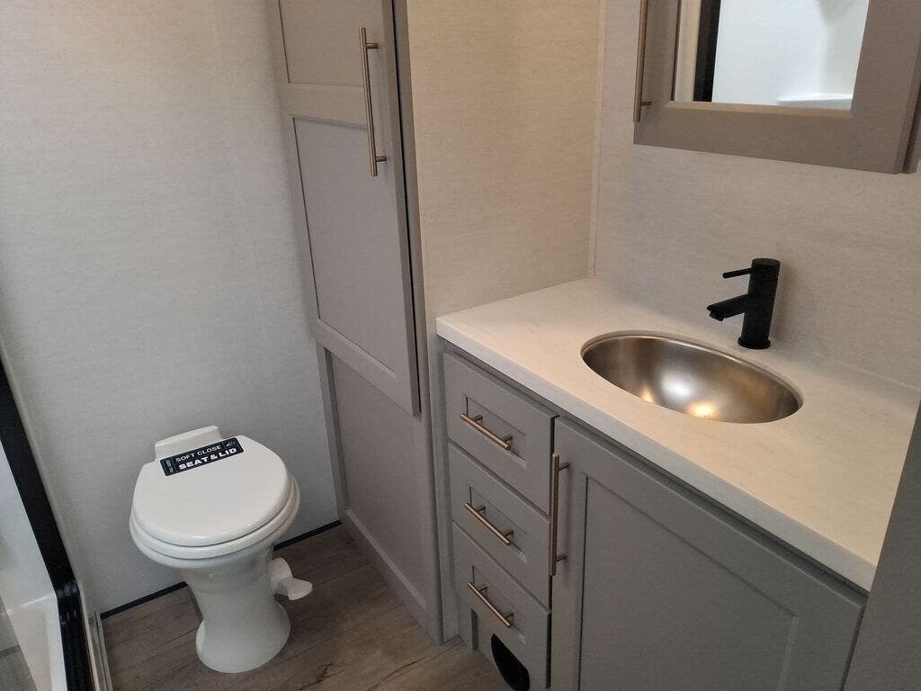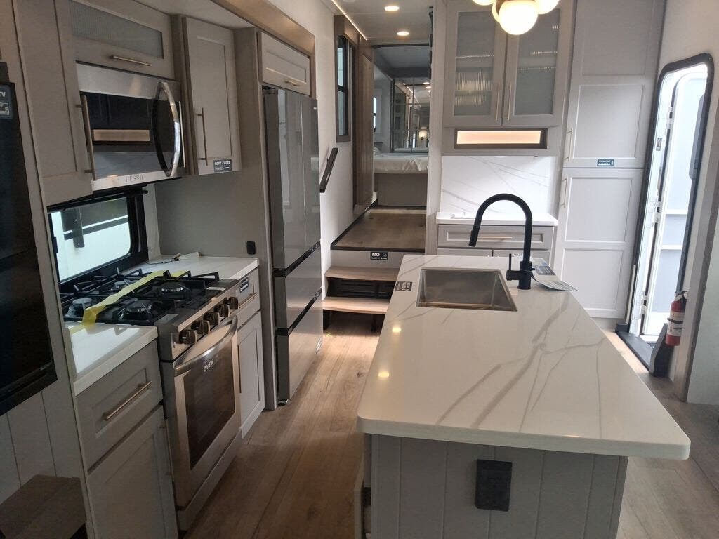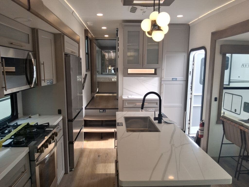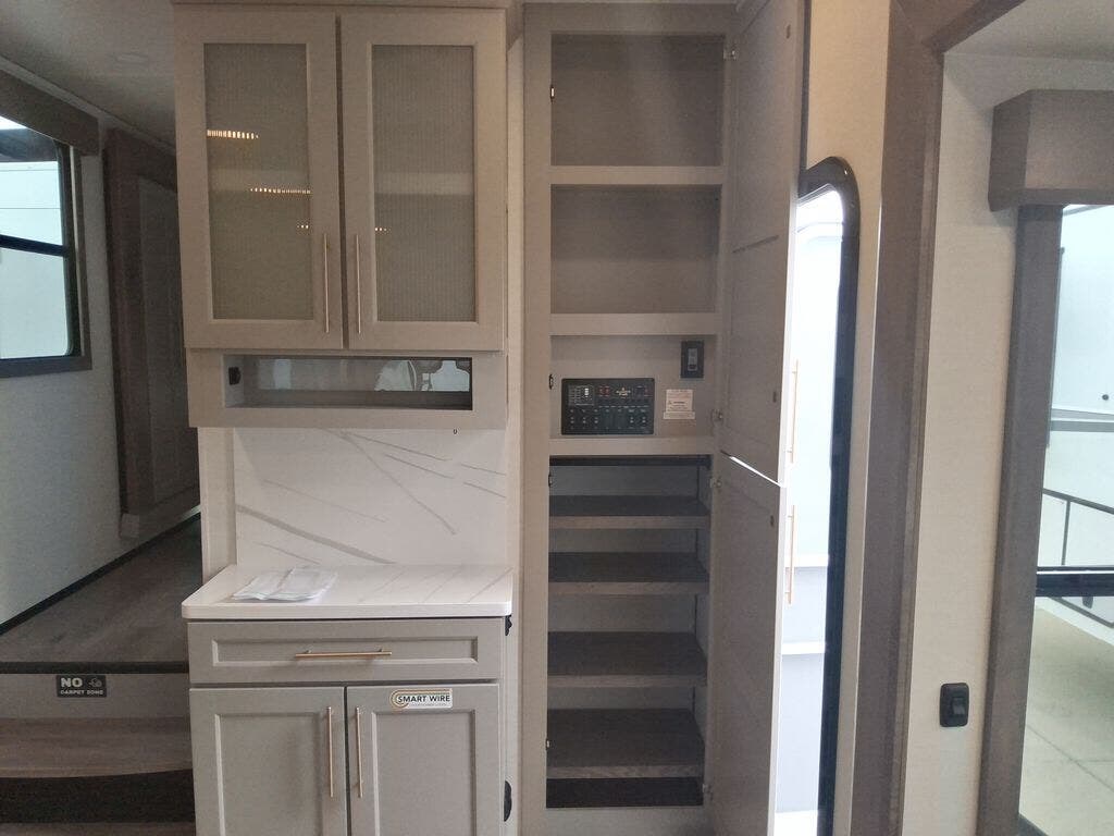 Travel to see family and friends while living in this RV or while on vacation! You will love the spacious rear living area thanks to the dual opposing slides which include the kitchen amenities and the 50" Smart TV with a fireplace. There is also a hidden pantry storage behind the TV for smart storage spaces! You can get comfortable on the dual recliner love seat or dine at the swivel table and desk. The kitchen island includes a sink and counter space to utilize many ways, plus there is dishwasher prep if you want to add that option. The full bathroom is up the steps towards the front bedroom and includes a spacious 61" x 30" shower. You even have more floor space in the hallway thanks to the third slide out which includes shelf storage, plus more shelves and a king bed in the bedroom.