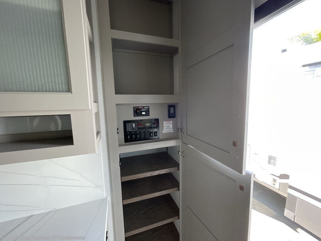 Travel to see family and friends while living in this RV or while on vacation! You will love the spacious rear living area thanks to the dual opposing slides which include the kitchen amenities and the 50" Smart TV with a fireplace. There is also a hidden pantry storage behind the TV for smart storage spaces! You can get comfortable on the dual recliner love seat or dine at the swivel table and desk. The kitchen island includes a sink and counter space to utilize many ways, plus there is dishwasher prep if you want to add that option. The full bathroom is up the steps towards the front bedroom and includes a spacious 61" x 30" shower. You even have more floor space in the hallway thanks to the third slide out which includes shelf storage, plus more shelves and a king bed in the bedroom.