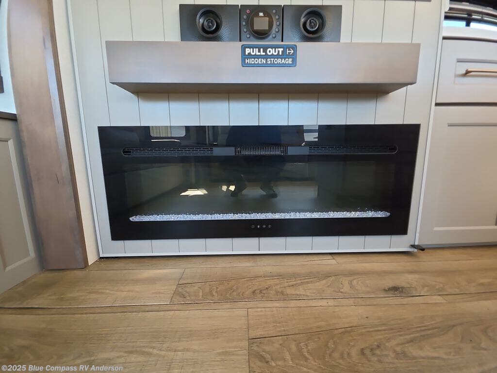 Travel to see family and friends while living in this RV or while on vacation! You will love the spacious rear living area thanks to the dual opposing slides which include the kitchen amenities and the 50" Smart TV with a fireplace. There is also a hidden pantry storage behind the TV for smart storage spaces! You can get comfortable on the dual recliner love seat or dine at the swivel table and desk. The kitchen island includes a sink and counter space to utilize many ways, plus there is dishwasher prep if you want to add that option. The full bathroom is up the steps towards the front bedroom and includes a spacious 61" x 30" shower. You even have more floor space in the hallway thanks to the third slide out which includes shelf storage, plus more shelves and a king bed in the bedroom.