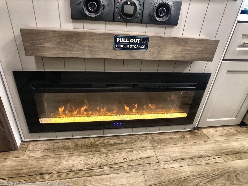 Travel to see family and friends while living in this RV or while on vacation! You will love the spacious rear living area thanks to the dual opposing slides which include the kitchen amenities and the 50" Smart TV with a fireplace. There is also a hidden pantry storage behind the TV for smart storage spaces! You can get comfortable on the dual recliner love seat or dine at the swivel table and desk. The kitchen island includes a sink and counter space to utilize many ways, plus there is dishwasher prep if you want to add that option. The full bathroom is up the steps towards the front bedroom and includes a spacious 61" x 30" shower. You even have more floor space in the hallway thanks to the third slide out which includes shelf storage, plus more shelves and a king bed in the bedroom.