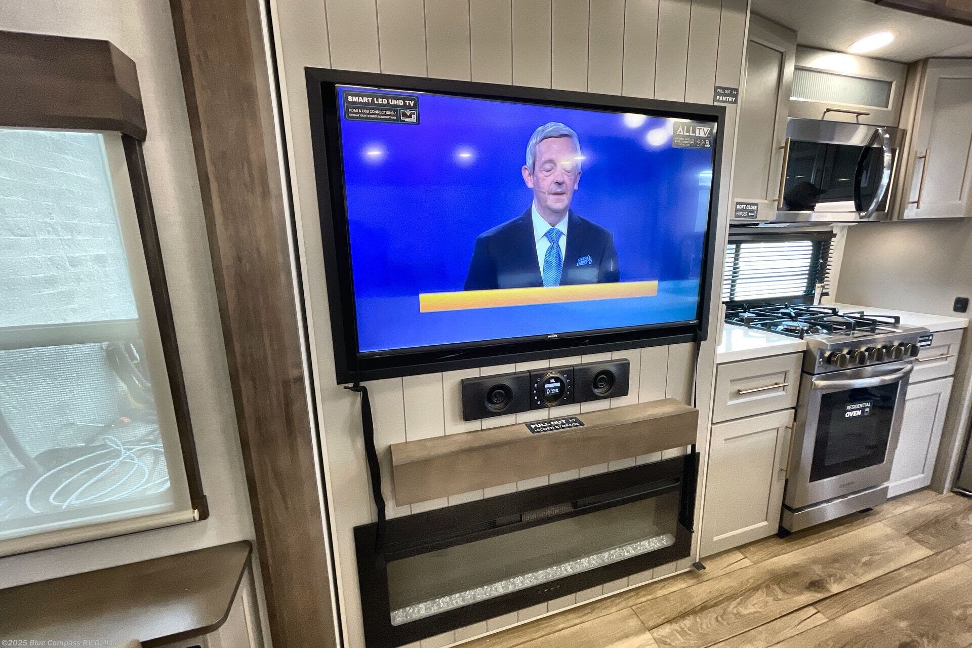 Travel to see family and friends while living in this RV or while on vacation! You will love the spacious rear living area thanks to the dual opposing slides which include the kitchen amenities and the 50" Smart TV with a fireplace. There is also a hidden pantry storage behind the TV for smart storage spaces! You can get comfortable on the dual recliner love seat or dine at the swivel table and desk. The kitchen island includes a sink and counter space to utilize many ways, plus there is dishwasher prep if you want to add that option. The full bathroom is up the steps towards the front bedroom and includes a spacious 61" x 30" shower. You even have more floor space in the hallway thanks to the third slide out which includes shelf storage, plus more shelves and a king bed in the bedroom.