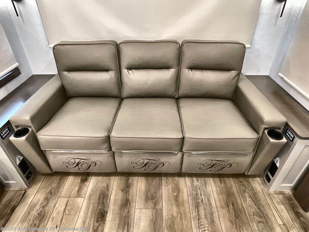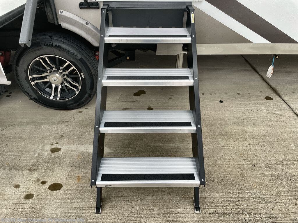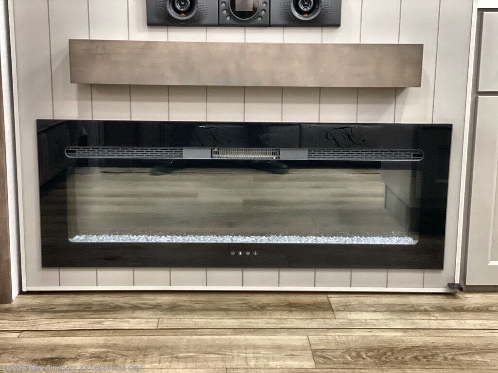 Travel to see family and friends while living in this RV or while on vacation! You will love the spacious rear living area thanks to the dual opposing slides which include the kitchen amenities and the 50" Smart TV with a fireplace. There is also a hidden pantry storage behind the TV for smart storage spaces! You can get comfortable on the dual recliner love seat or dine at the swivel table and desk. The kitchen island includes a sink and counter space to utilize many ways, plus there is dishwasher prep if you want to add that option. The full bathroom is up the steps towards the front bedroom and includes a spacious 61" x 30" shower. You even have more floor space in the hallway thanks to the third slide out which includes shelf storage, plus more shelves and a king bed in the bedroom.