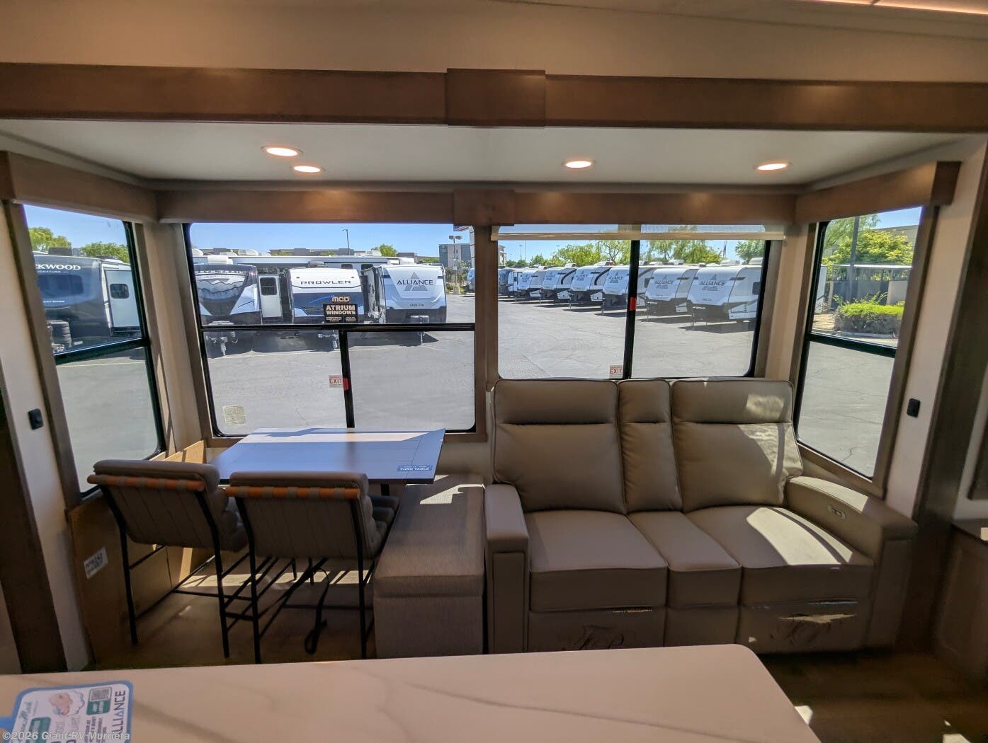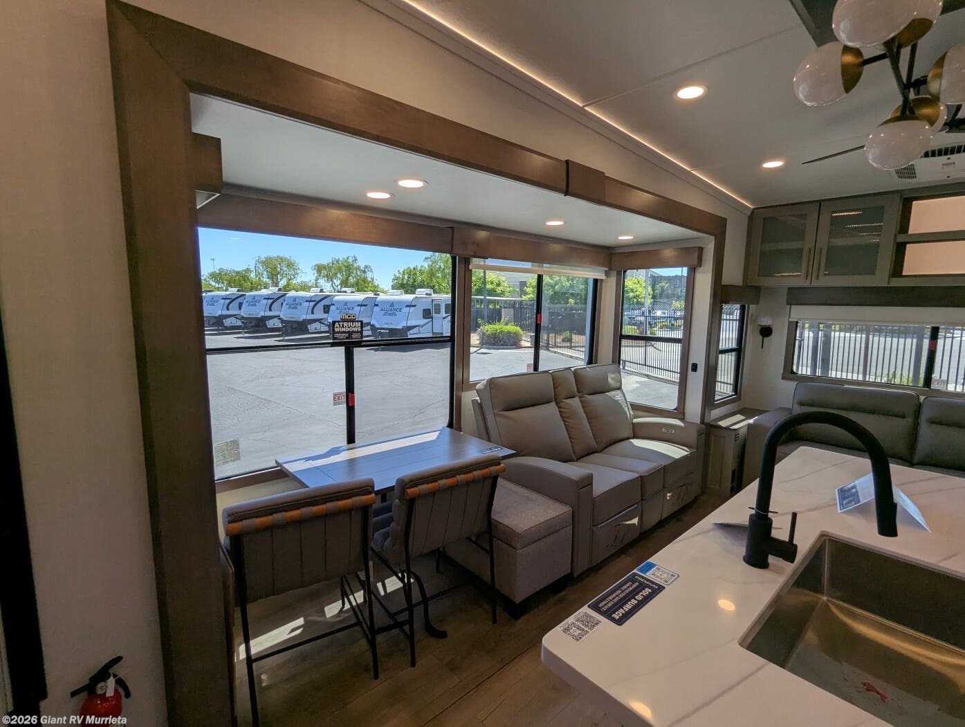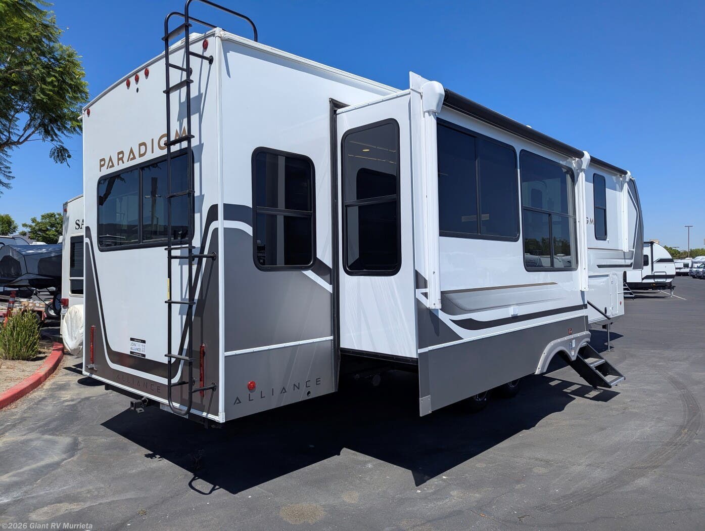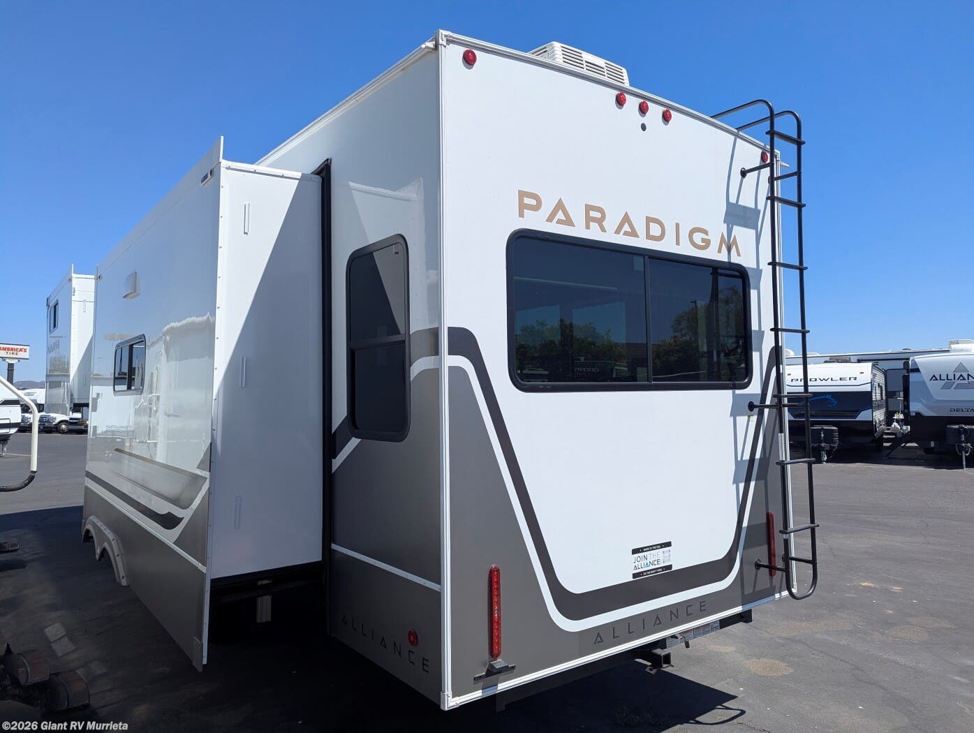 Experience premium RV camping with the 2025 Alliance RV Paradigm 340RL fifth wheel at Giant RV in California! Ideal for couples, this RV features a rear living area with dual opposing slide-outs, theater seating, a tri-fold sofa, and 50” LED TV, plus a front king bedroom. The kitchen boasts a 19 cu. ft. fridge, Insignia range, and island. A full bath with shower ensures comfort. Enjoy a 16’ power awning, exterior storage, and a 98.3-gal fresh water tank. Equipped with three 13,500 BTU A/Cs, a 40,000 BTU furnace, and 6-point hydraulic leveling for off-grid luxury.