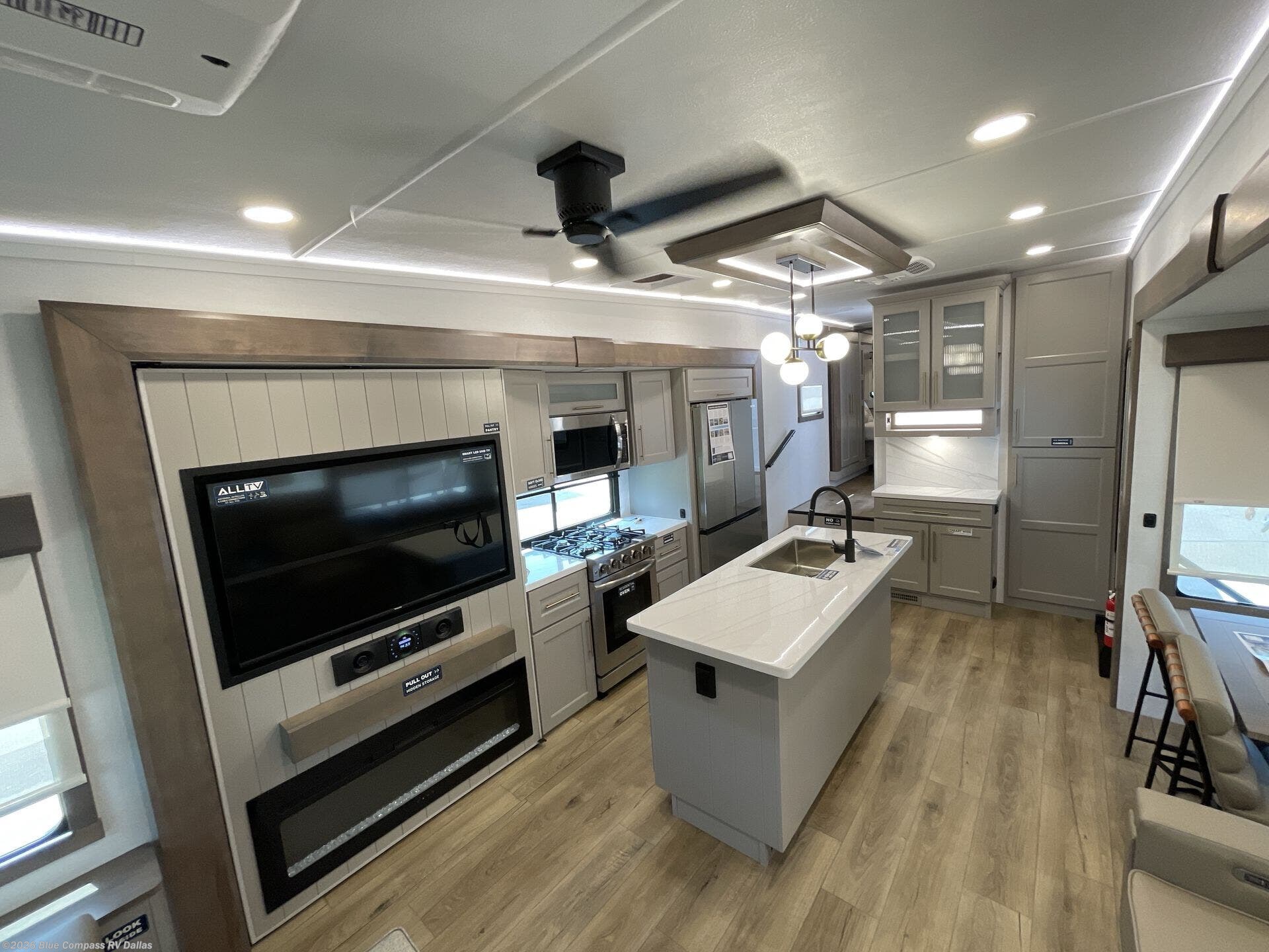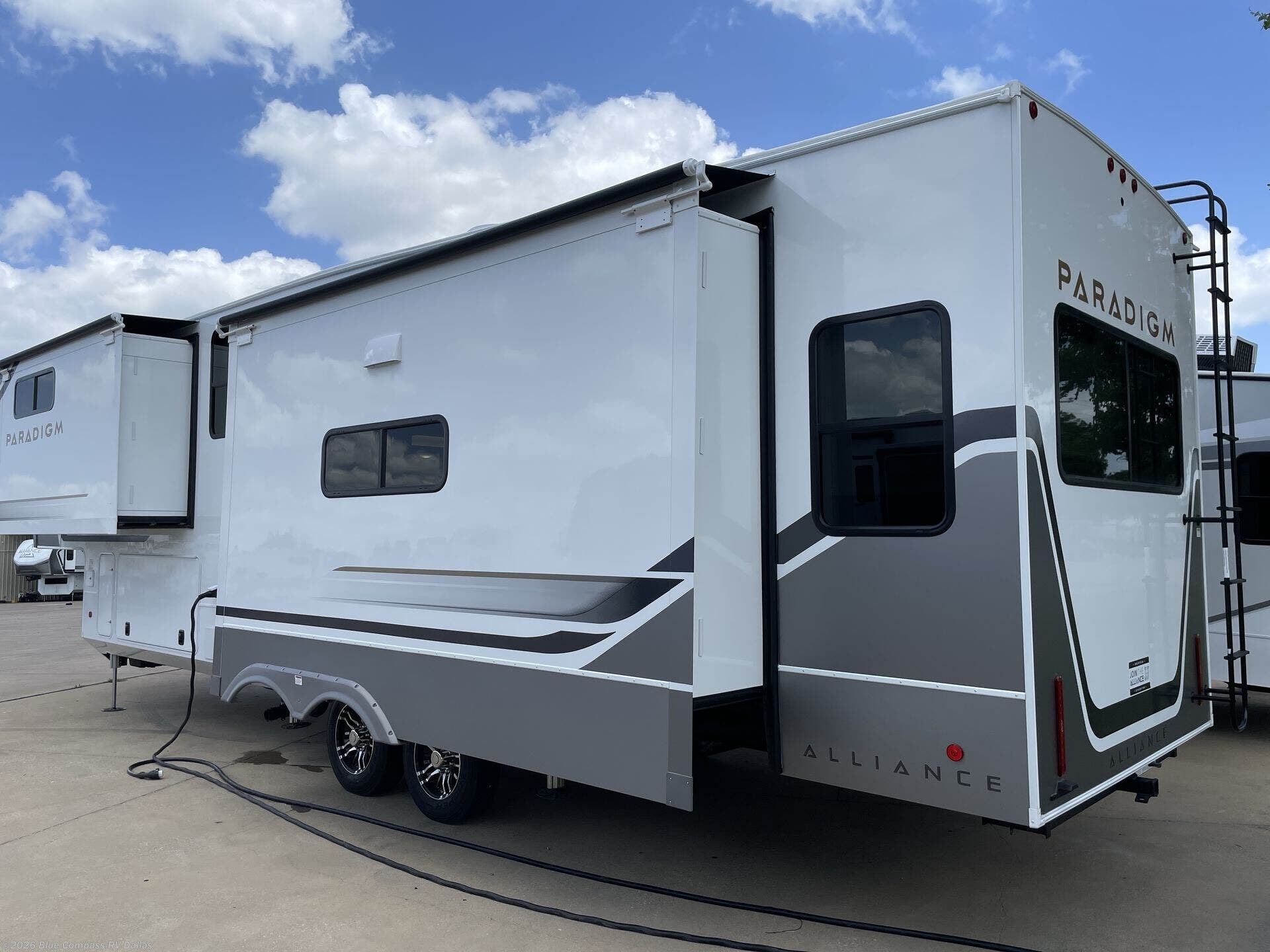 The Paradigm fifth wheels by Alliance RV are functional, high-quality, and luxurious for an unforgettable camping experience. There are three A/C units and a 40K BTU furnace to keep you comfortable year around, and you'll appreciate additional convenient amenities, like the all-in-one enclosed/heated utility center and the color coded and numbered wiring. A Helux Series coil spring pin box comes standard for hassle-free towing, along with Super-G 4,400 lb. rated tires and Dexter 7,000 lb. axles. You'll love the kitchen with its LG solid surface countertops and Lusso range, plus there is LED motion lighting in the pantry and a Maxx fan with a rain sensor to keep everything fresh when making dinner. Each model also includes an HD Smart TV in the living room and bedroom, plus a Winegard Air 360 antenna to keep you connected to the outside world. And of course there are a variety of options you can choose from to further customize your fifth wheel; dual pane windows, Super Solar Plus, slide out awning toppers, and generator prep or a generator to name a few!