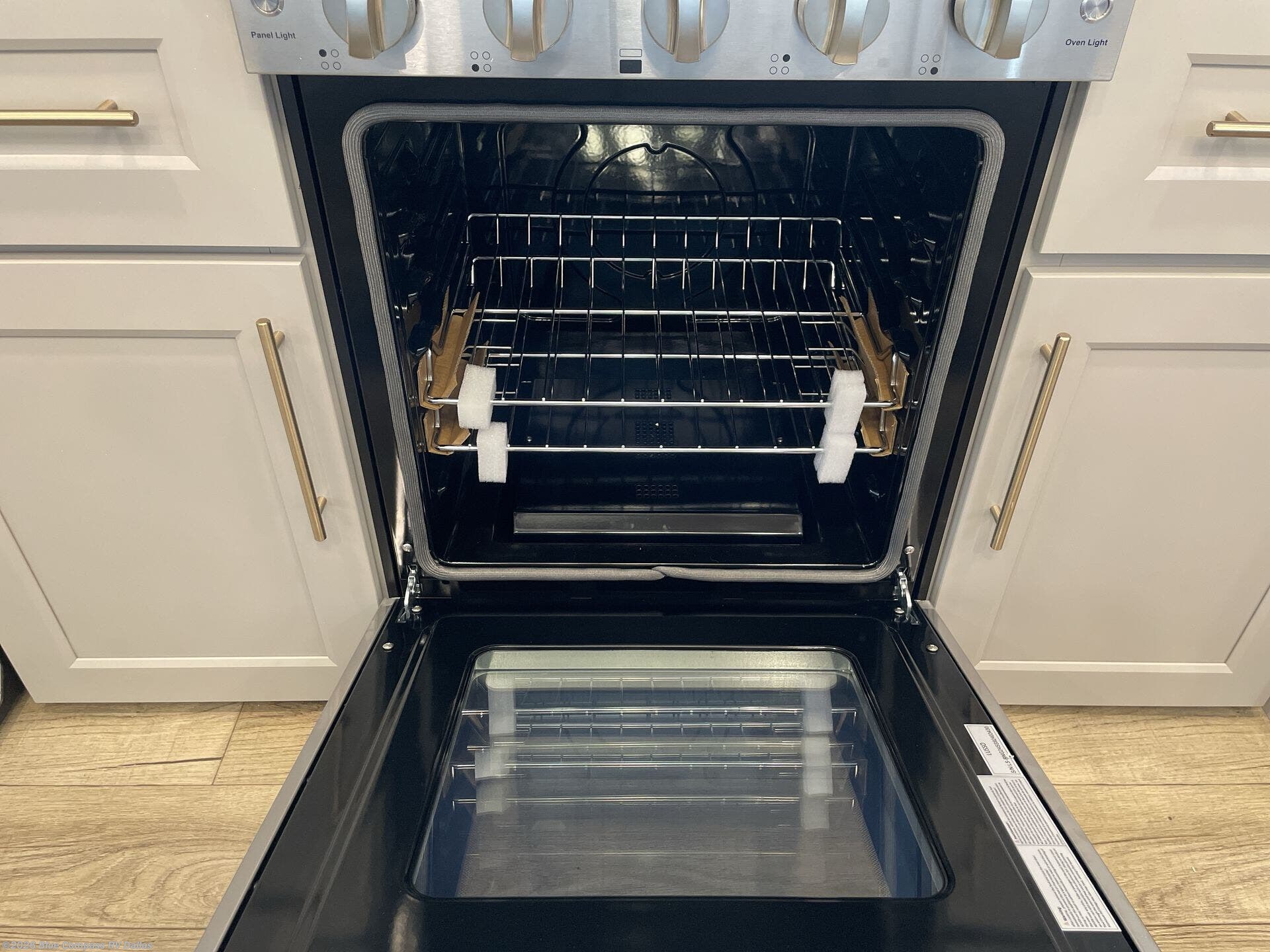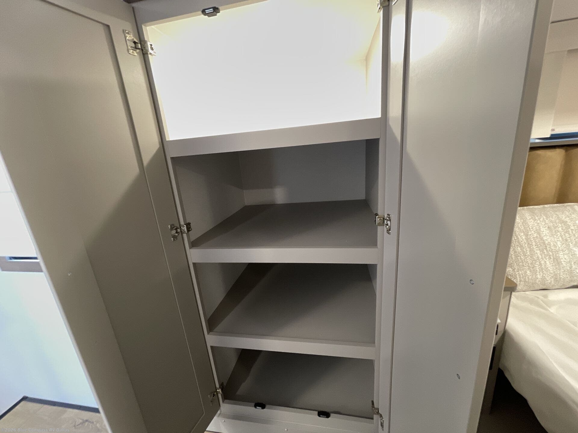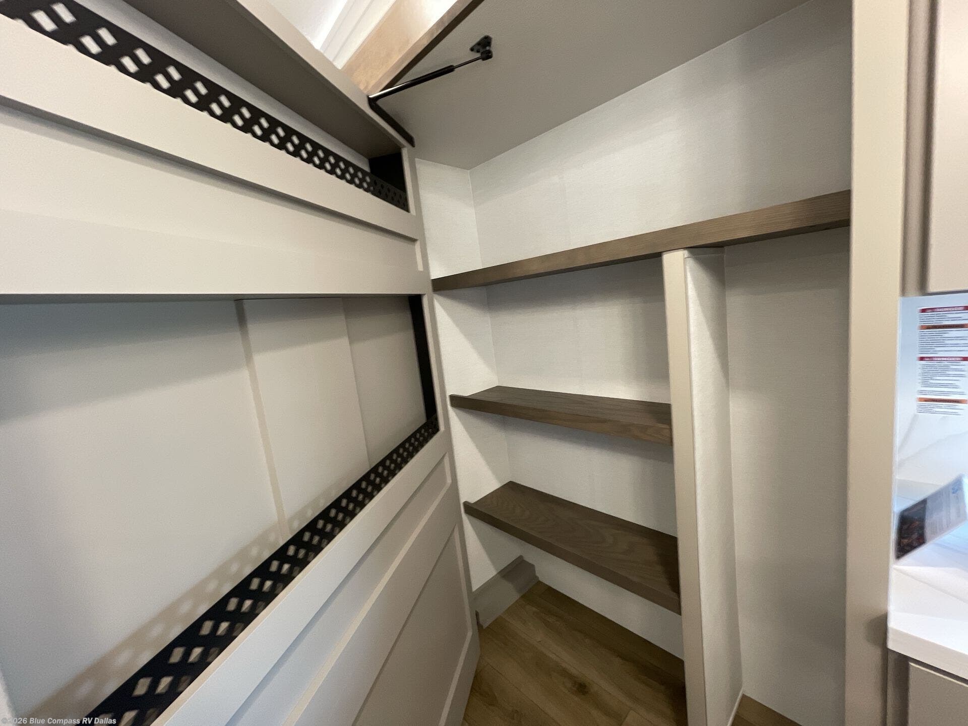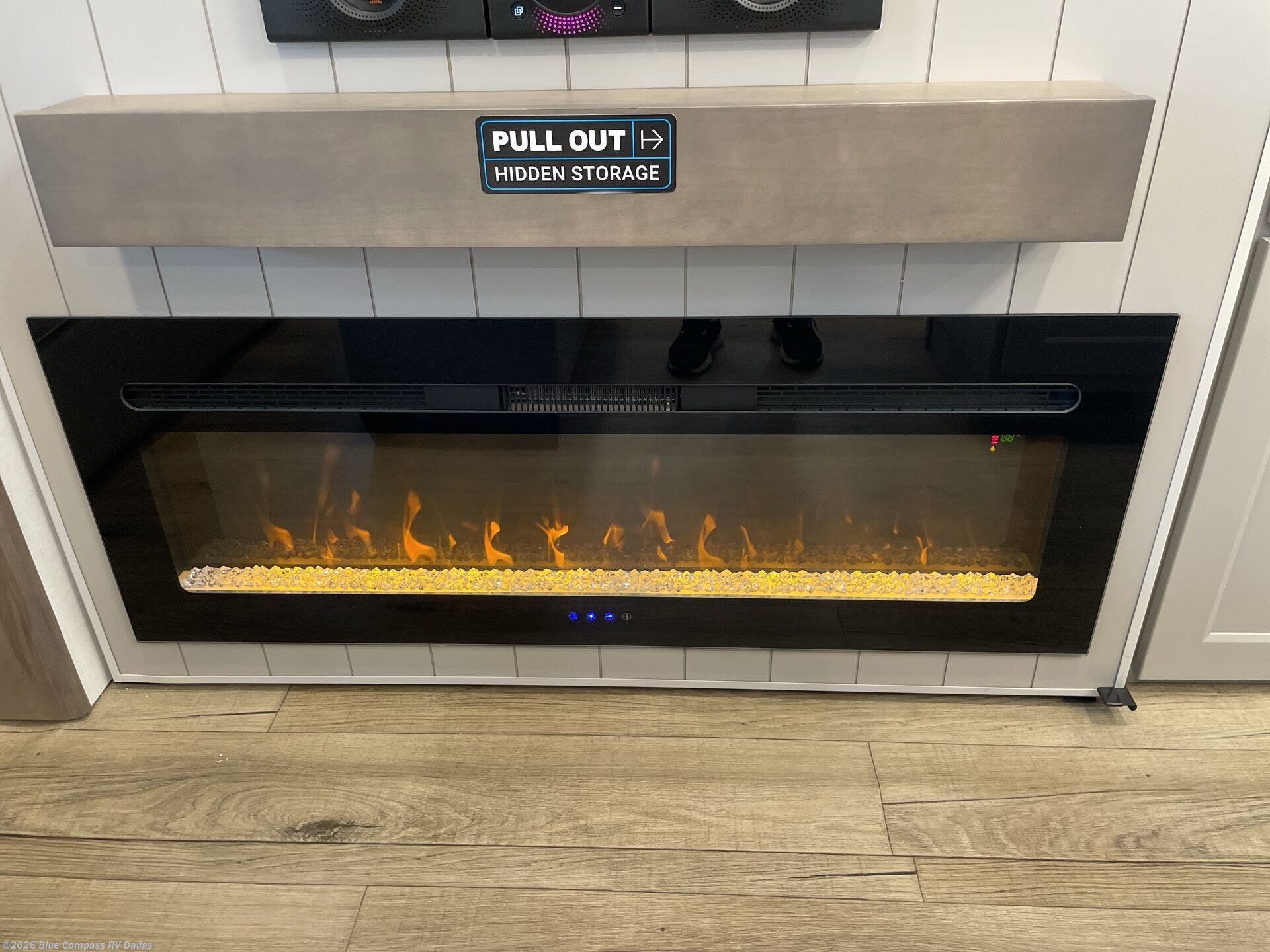 Travel to see family and friends while living in this RV or while on vacation! You will love the spacious rear living area thanks to the dual opposing slides which include the kitchen amenities and the 50" Smart TV with a fireplace. There is also a hidden pantry storage behind the TV for smart storage spaces! You can get comfortable on the dual recliner love seat or dine at the swivel table and desk. The kitchen island includes a sink and counter space to utilize many ways, plus there is dishwasher prep if you want to add that option. The full bathroom is up the steps towards the front bedroom and includes a spacious 61" x 30" shower. You even have more floor space in the hallway thanks to the third slide out which includes shelf storage, plus more shelves and a king bed in the bedroom.
